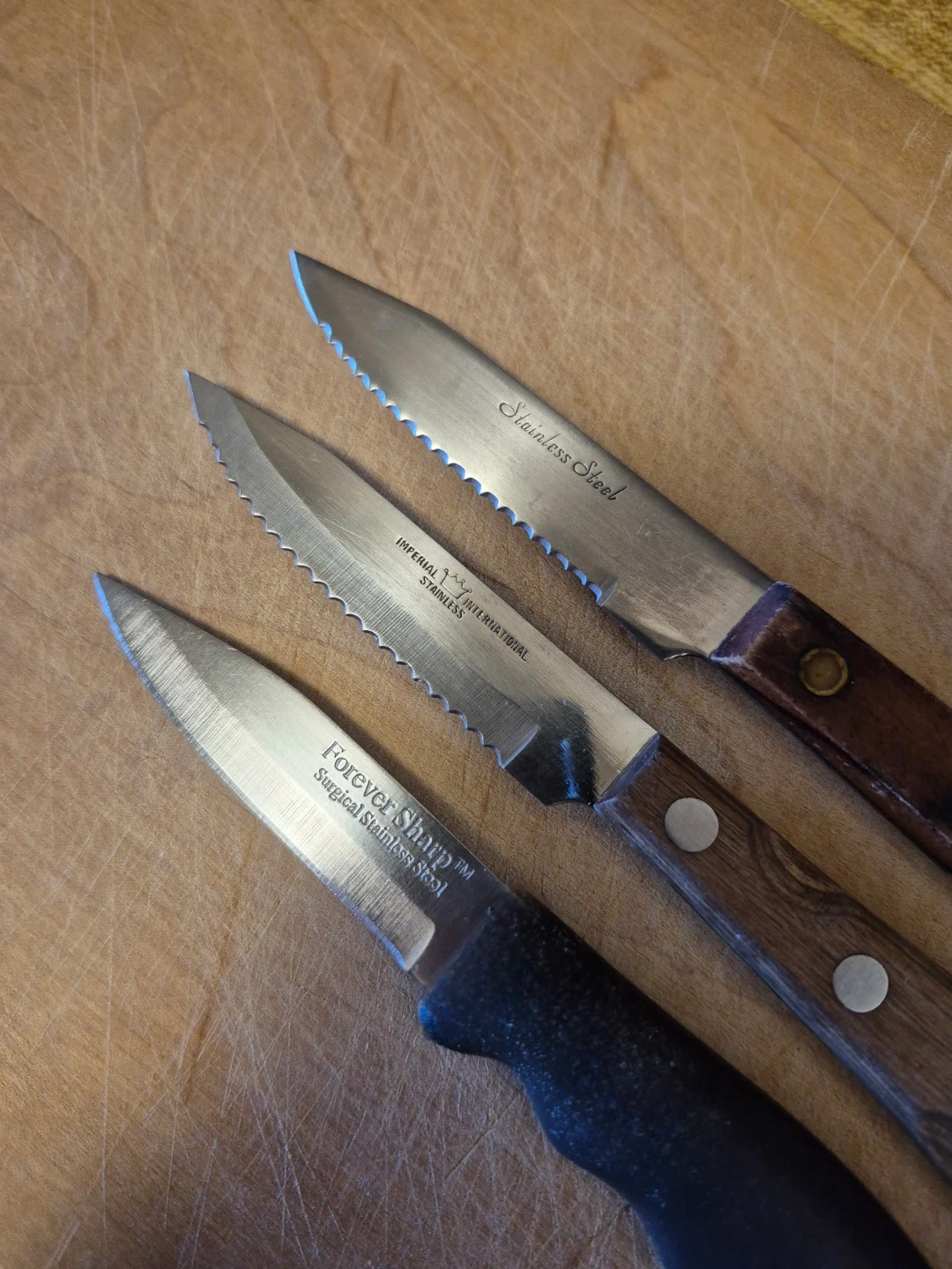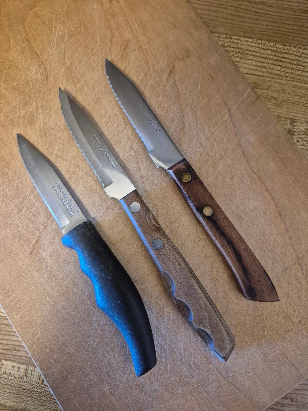 Three short paring knives. Not used much because we just have too many. These are older, so good quality.