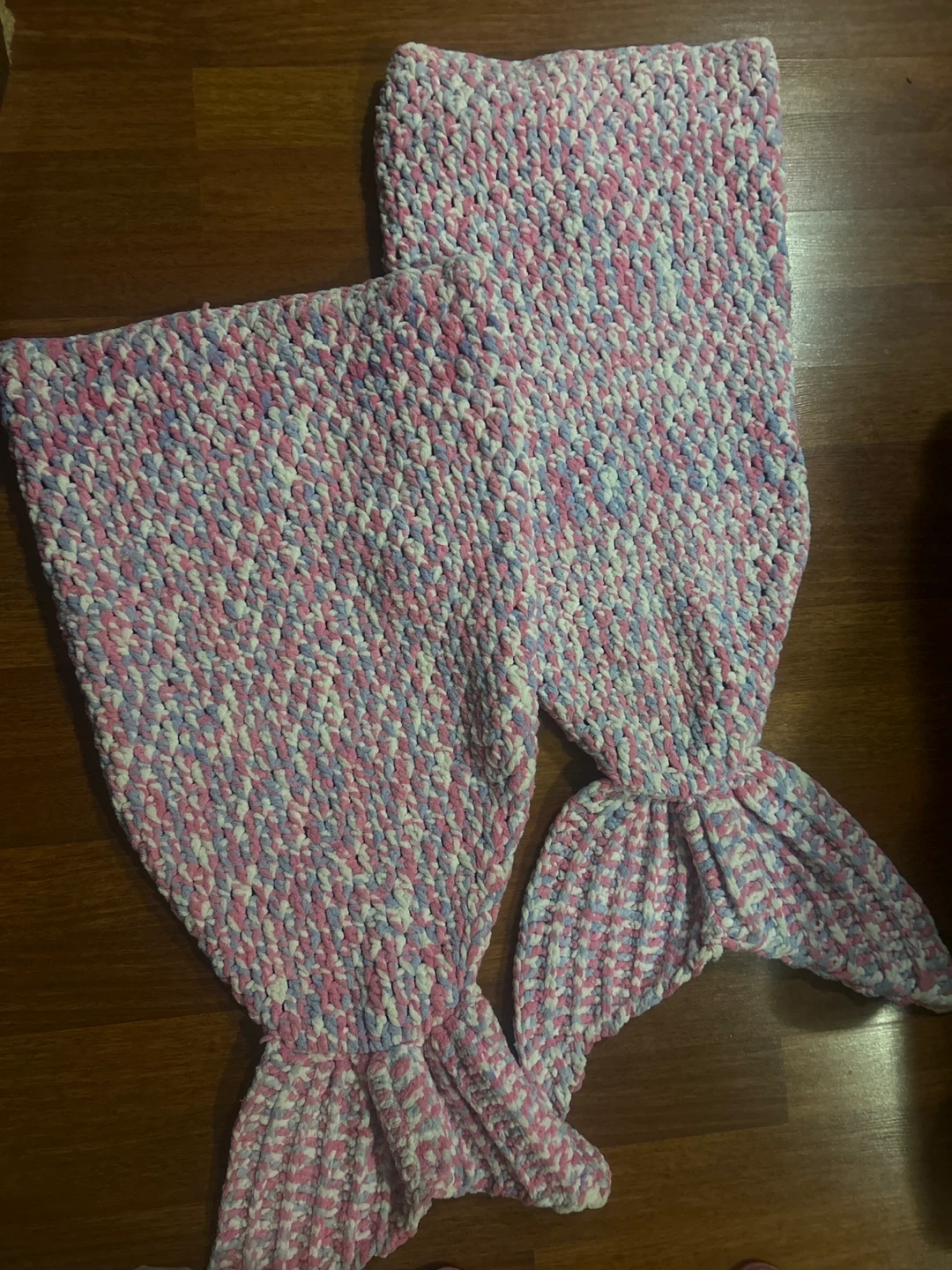 Super soft and cozy crocheted mermaid tail blanket. It's made with chunky yarn in a pretty pink, white, and blue mix. Perfect for lounging or adding a touch of fun to story time! Take both!