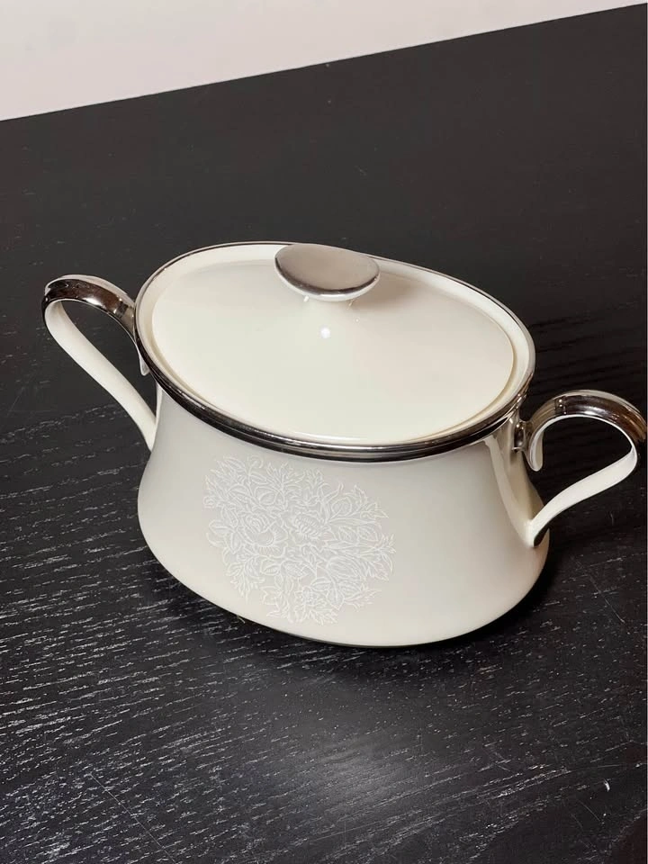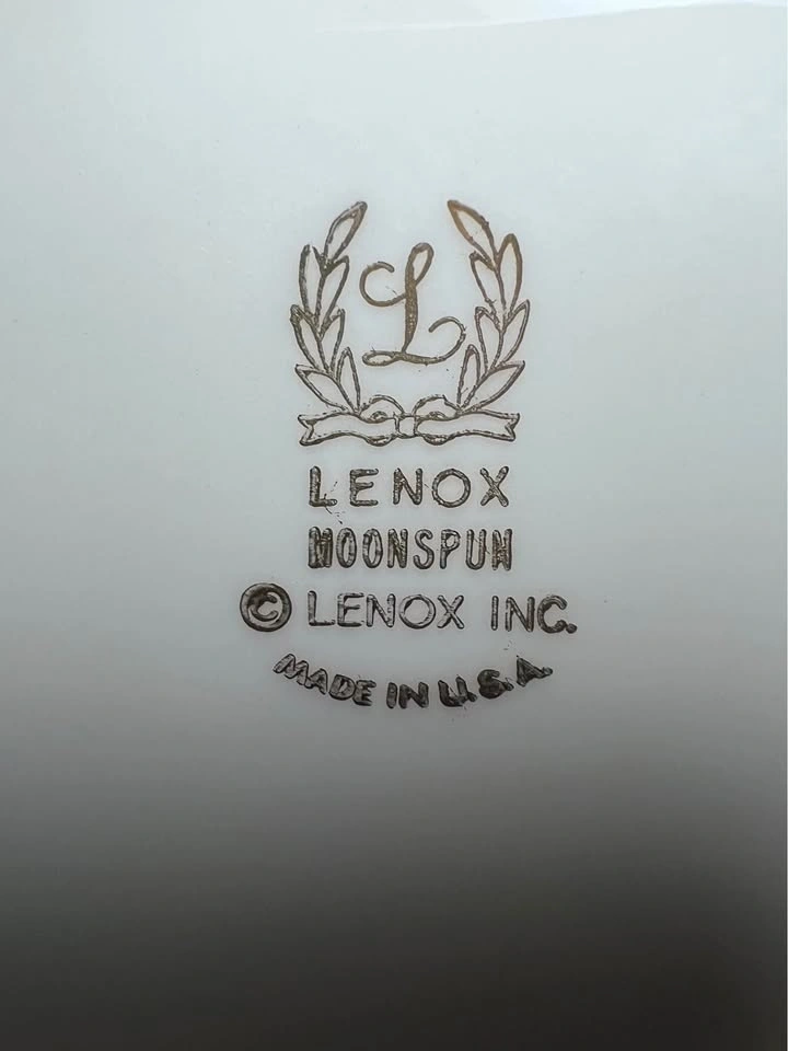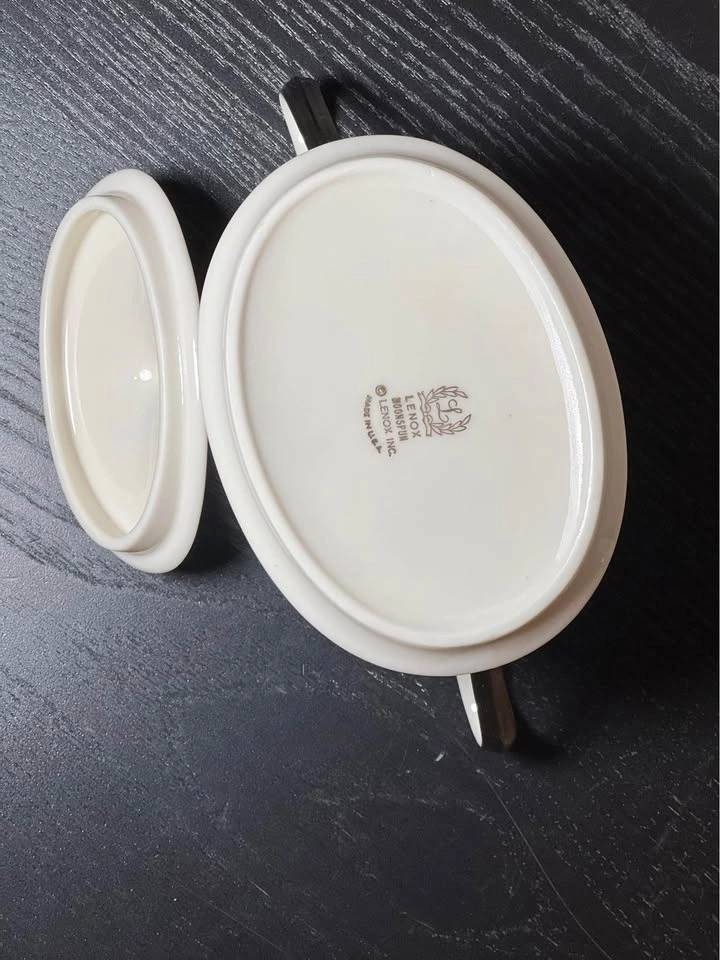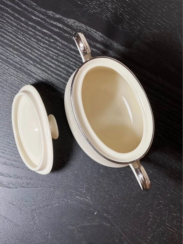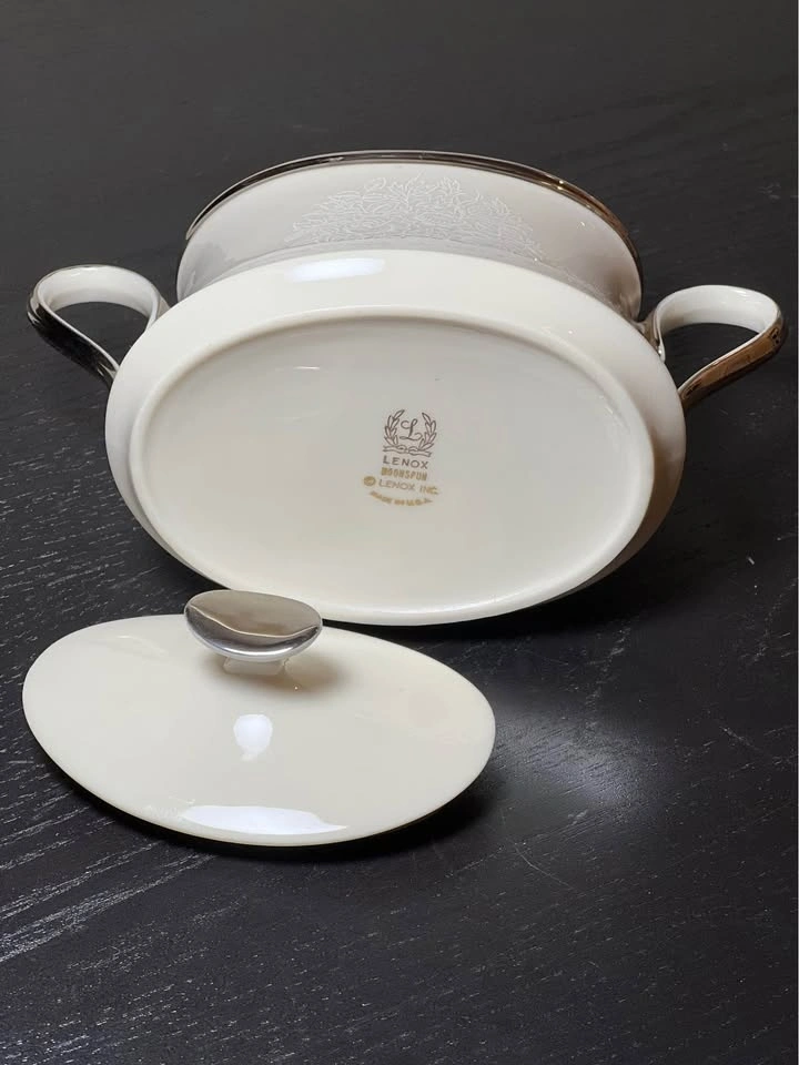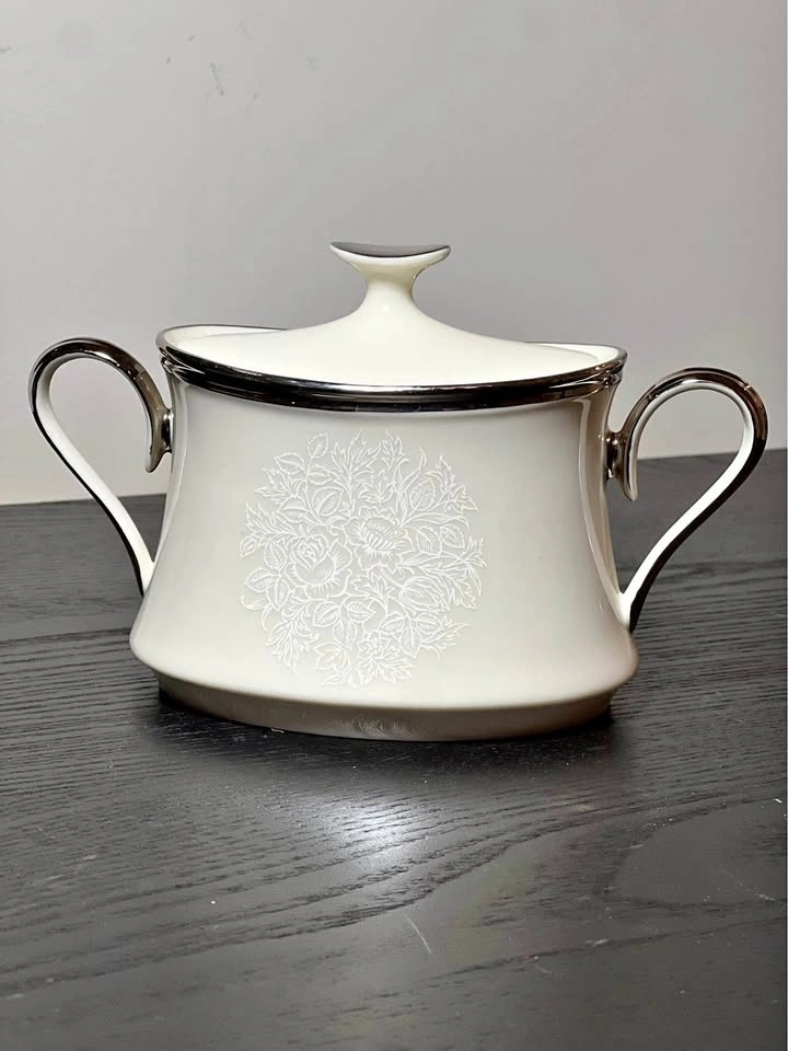 This Lenox Moonspun covered sugar bowl is a stunning addition to any china service. The ivory porcelain embossed with the delicate Moonspun enameled pattern is accented with a platinum trim, adding a touch of elegance to any occasion. Measuring 7" in length, this sugar bowl is perfect for serving guests at all occasions. The sugar bowl is in excellent condition, with a glossy finish and a printed backstamp. Pickup is 58th and 7th Ave in midtown Manhattan.