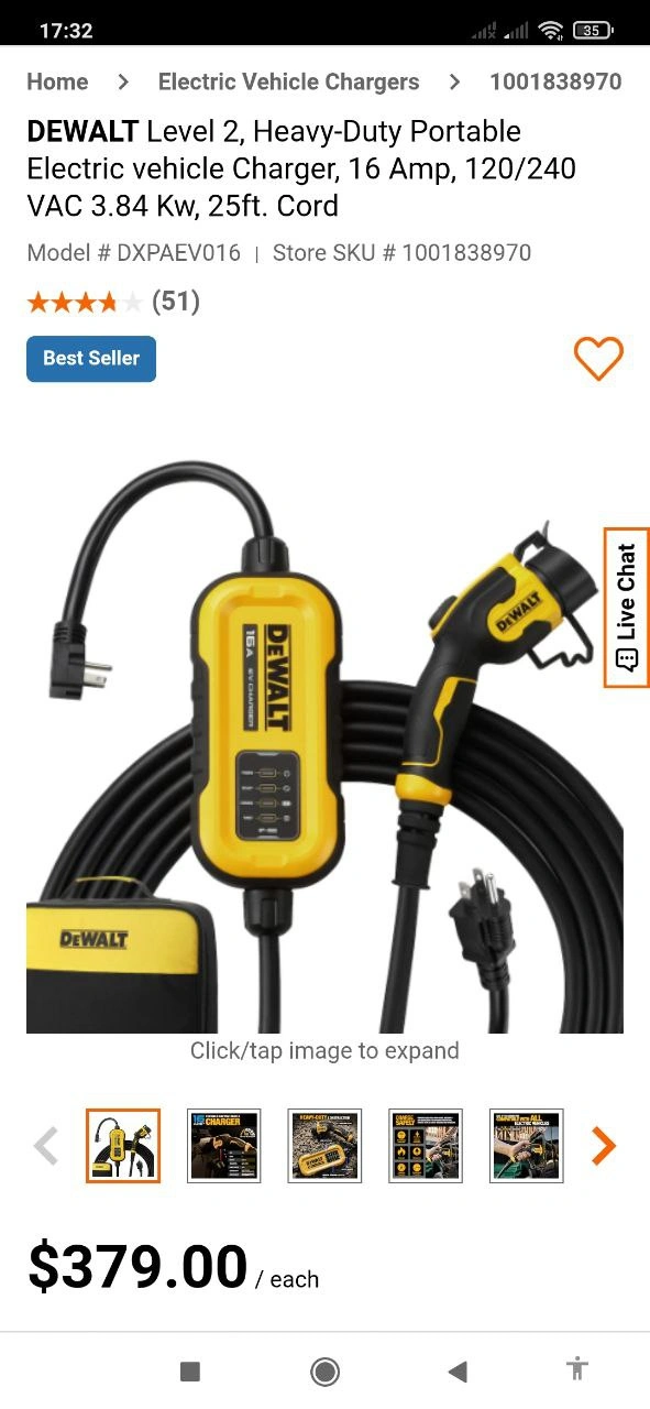 Selling a DEWALT Portable EV Charger, Level 2, up to 16 Amps. Works with 120-240V. CSA Certified for indoor/outdoor use. Comes with NEMA 6-20 plug and a NEMA 5-15 adapter. The cable is 25 ft long. Retail price was $379, selling for $285. This charger is great for charging your electric vehicle at home, while traveling, or as an emergency backup. No installation is required. It offers Level 1 & Level 2 charging and can deliver up to 12 miles of range per hour. The current is adjustable between 12-16 Amps. It has an easy-to-read display and includes a travel bag. It's compatible with all SAE J1772 EVs, and Tesla vehicles with an adapter (not included). Please note it may not be suitable for certain models like the Chevrolet Bolt. It's CSA Certified, IP66 waterproof, and has NEMA 4X enclosure for indoor/outdoor use. Features over-voltage, over-current, over-heat, surge, and over-charge protection, plus a heavy-duty protective cage and anti-slip grip. This charger is new. Pickup is in Livingston NW or Southland SW, or we can discuss delivery. Let me know if you're interested!