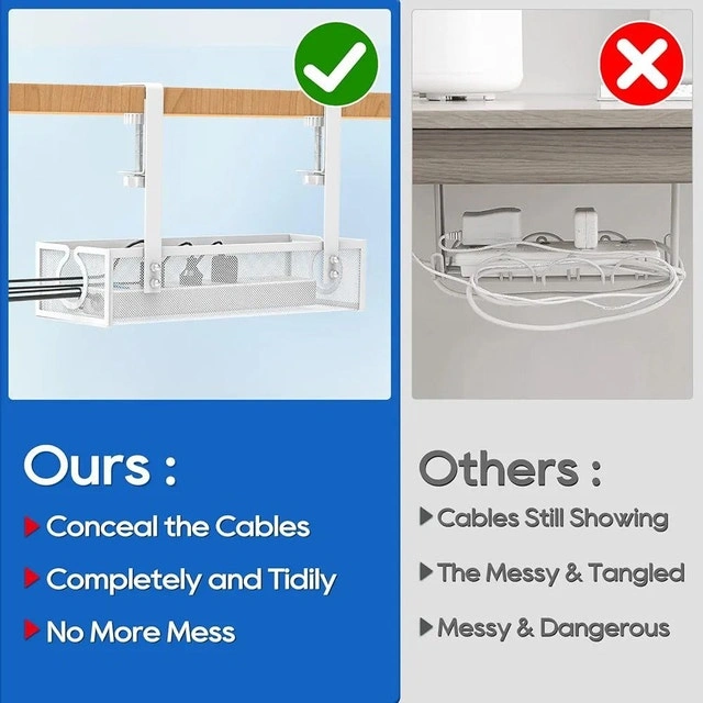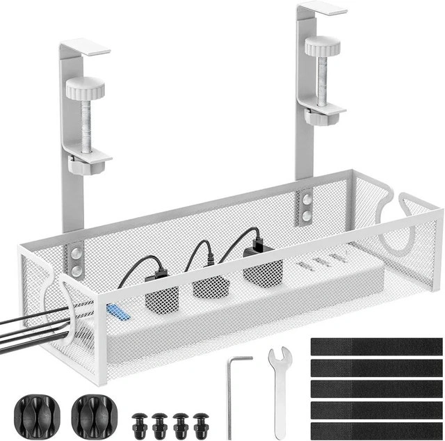 BRAND NEW IN BOX! Keep your workspace neat, organized, and clutter-free with this metal mesh under desk cable management tray! Perfect for hiding messy wires and keeping your cords safely off the floor. It features a minimalist concealed design, an aesthetic trapezoidal shape for easy cable viewing, and a side circular hole for simple cable insertion. This tray helps keep all data and power cords tidy and off the ground, preventing tangles. The clamp mounts include scratch-resistant pads to protect your desk. Color: Black; White Material: Metal Mesh Type: Clamp-Mount Tray Includes: 1 set (tray + mounting clamps). Ideal for home offices, study desks, and gaming setups. My price: $15. Pick up locations possible: SW - Cedardale Bay SW, NW - Arbour Lake NW, NE - Airport area NE.