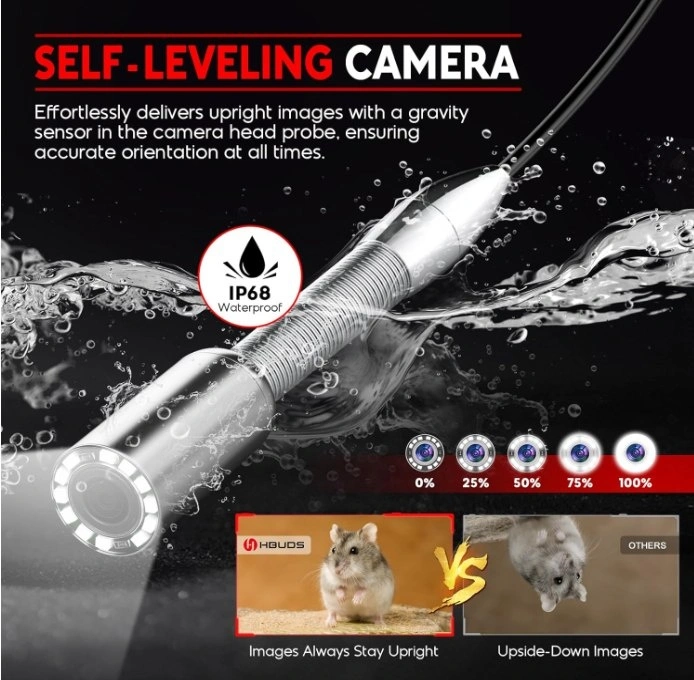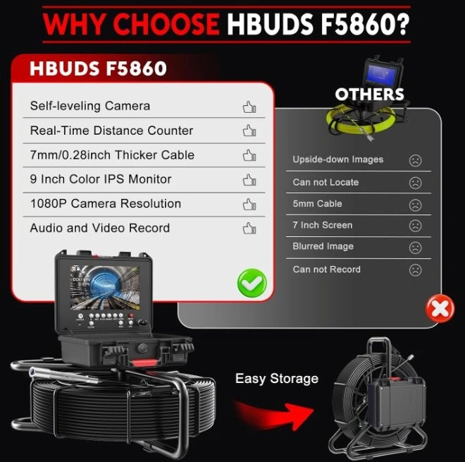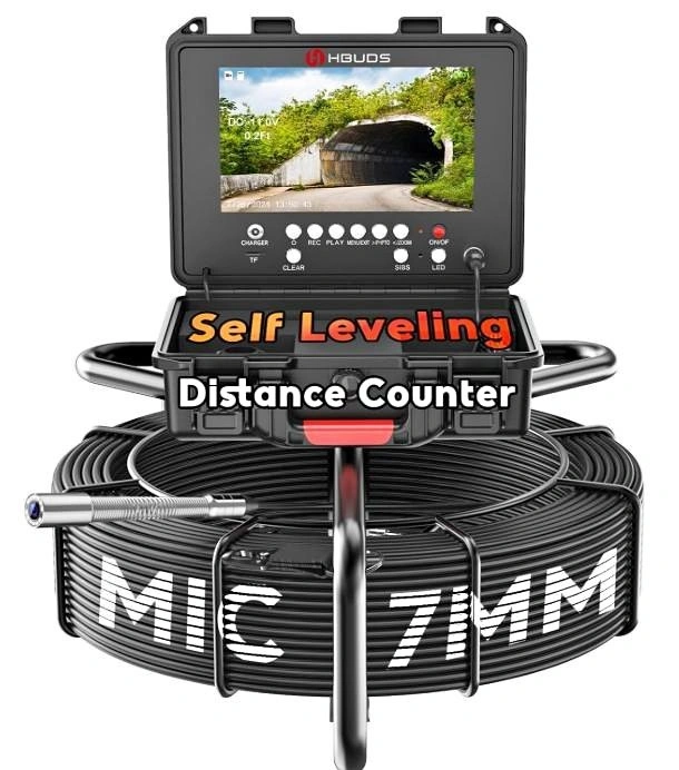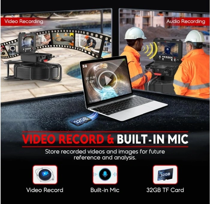 Self-Leveling Function. Real-Time Distance Counter. 7mm/0.28in Thicker Cable. Crystal-Clear Image. Video Record and Rechargeable Battery - The pipe camera features a DVR recording function that enables you to record videos or capture photos at any time and store them on a 32GB SD card (included) for future analysis or sharing with clients. The sewer camera 100ft boasts a powerful 12V 4500mAh rechargeable battery that provides up to 6 hours of continuous use on a single charge.