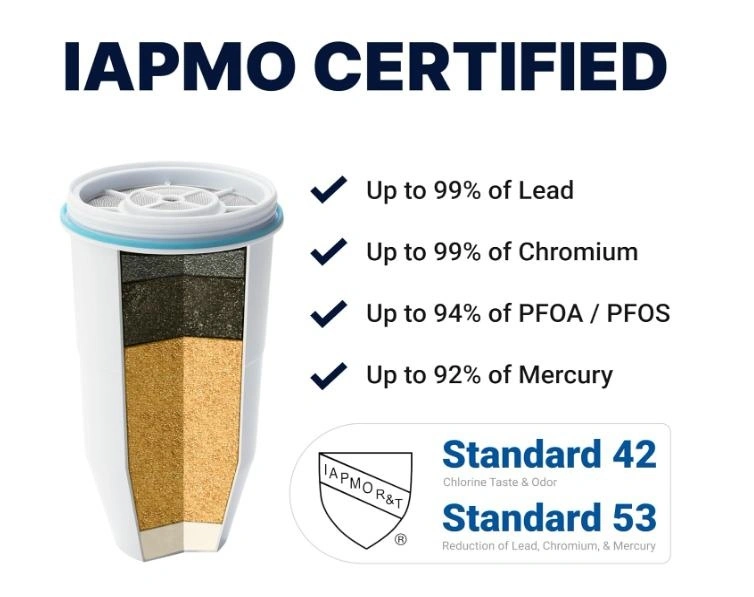 ZeroWater 7-Cup 5-Stage Water Filter Pitcher for Improved Tap Water Taste. IAPMO Certified to Reduce Lead, Chromium, and PFOA/PFOS. Our 5-Stage Ion Exchange Filter removes virtually all dissolved solids (TDS) for the purest tasting water. Total Dissolved Solids are organic and inorganic materials, such as metals, minerals, salts, and ions dissolved in water.