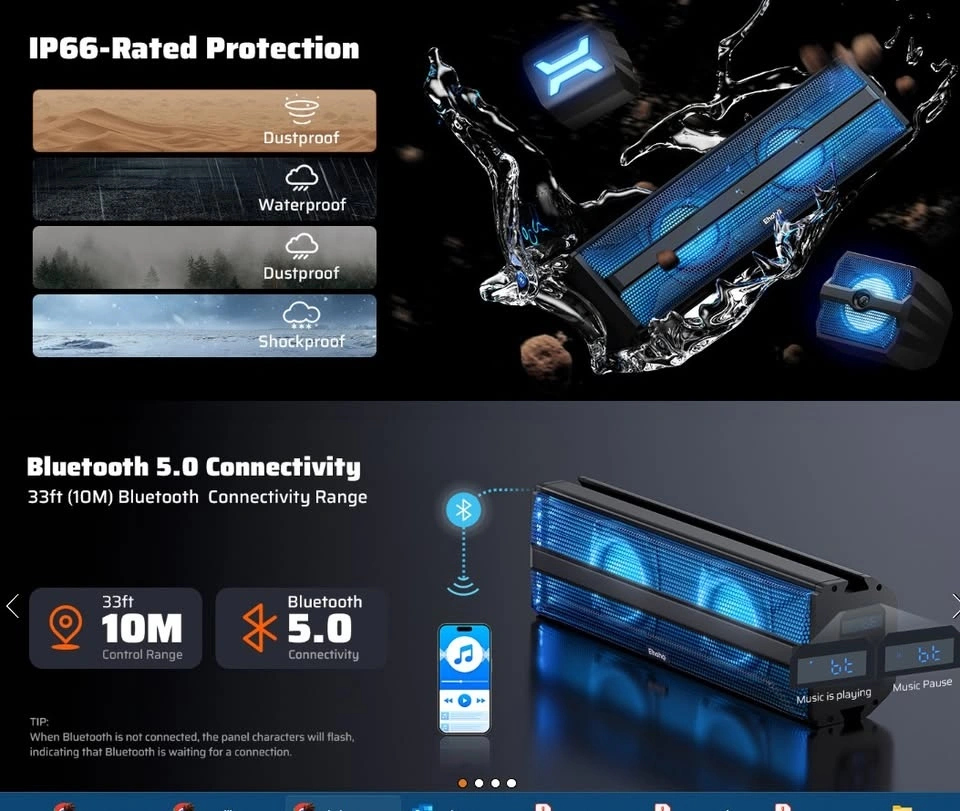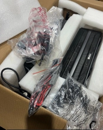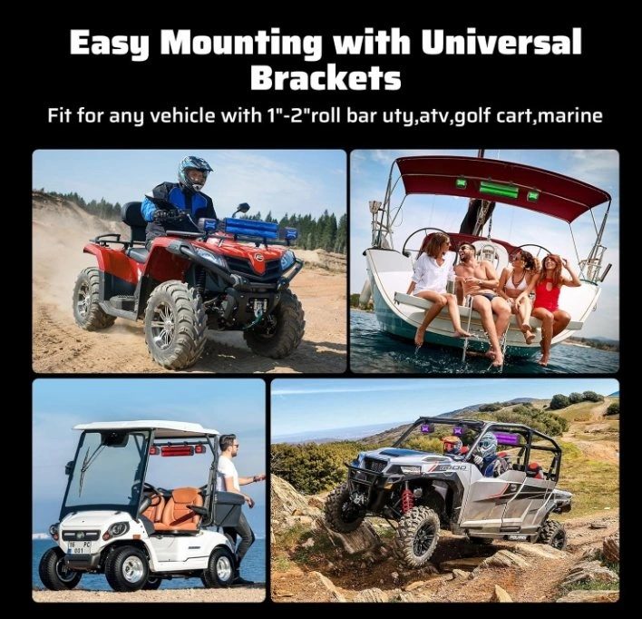 Selling a powerful Ehaho 2.1 channel UTV soundbar system with a 17-inch subwoofer and two 4" full-range speakers, delivering 500W peak power for immersive sound. Features dynamic RGB LED lighting on the subwoofer and blue LEDs on the speakers that change with volume. It's IP66 waterproof and dust resistant, built tough for outdoor use. Connects via Bluetooth V5.0, USB, or 3.5mm Aux. Includes a control panel and wireless remote. Comes with universal brackets for mounting on 1"-2" roll cages for UTVs, ATVs, golf carts, and more.