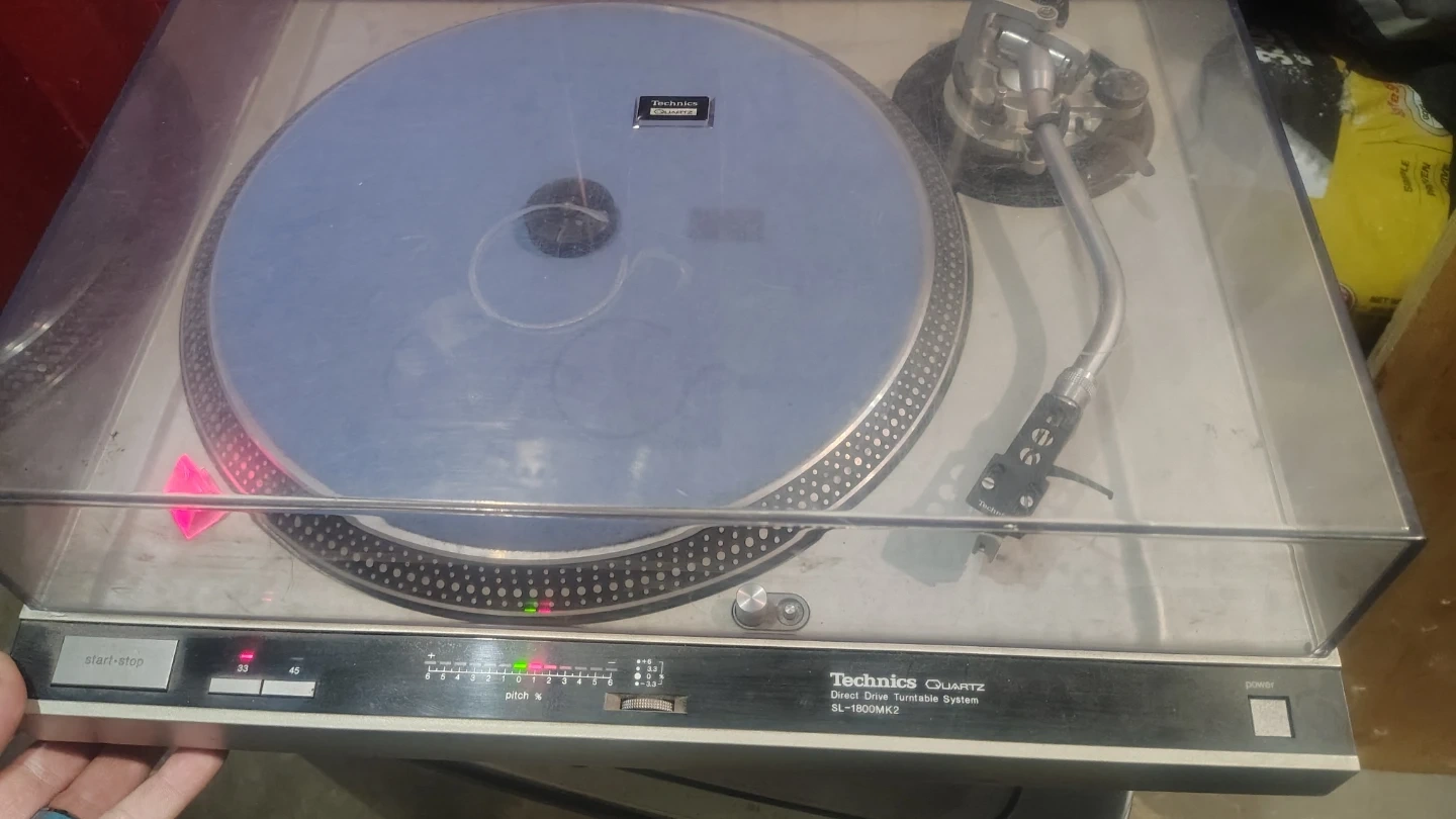 Technics Quartz Direct Drive Turntable System, model SL-1800MK2. It's a professional-grade turntable. Features pitch control adjustment.