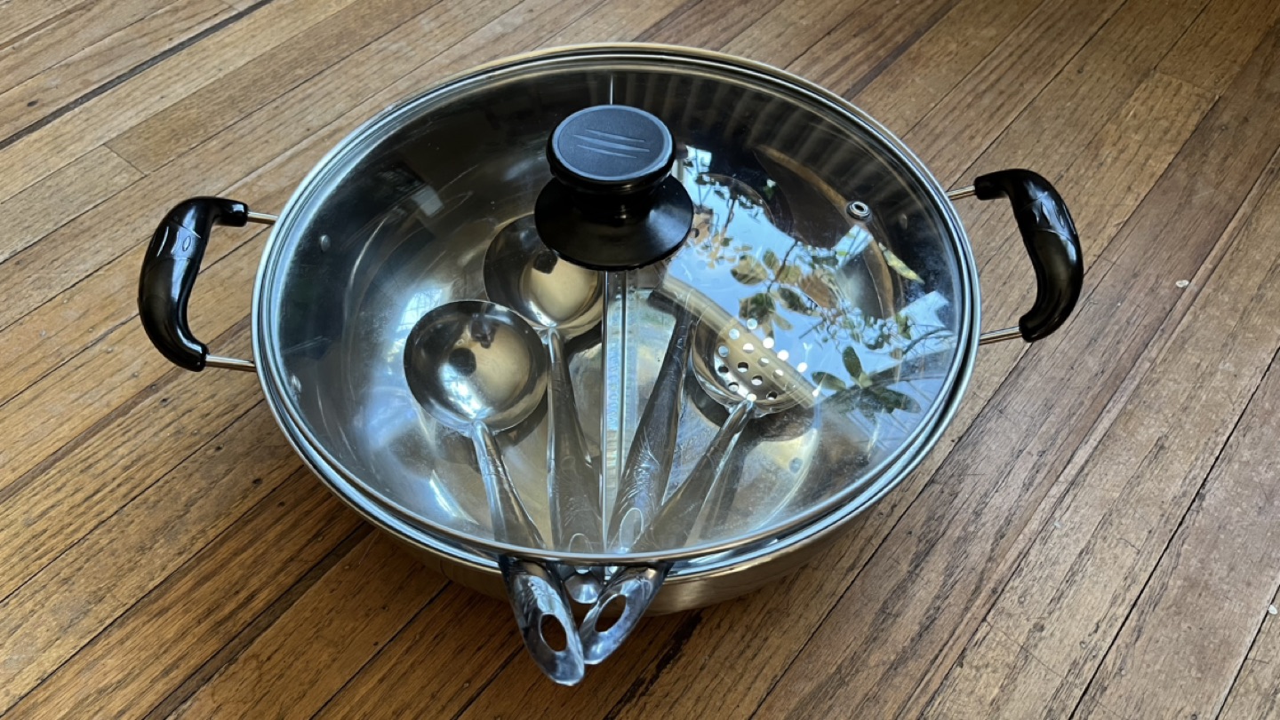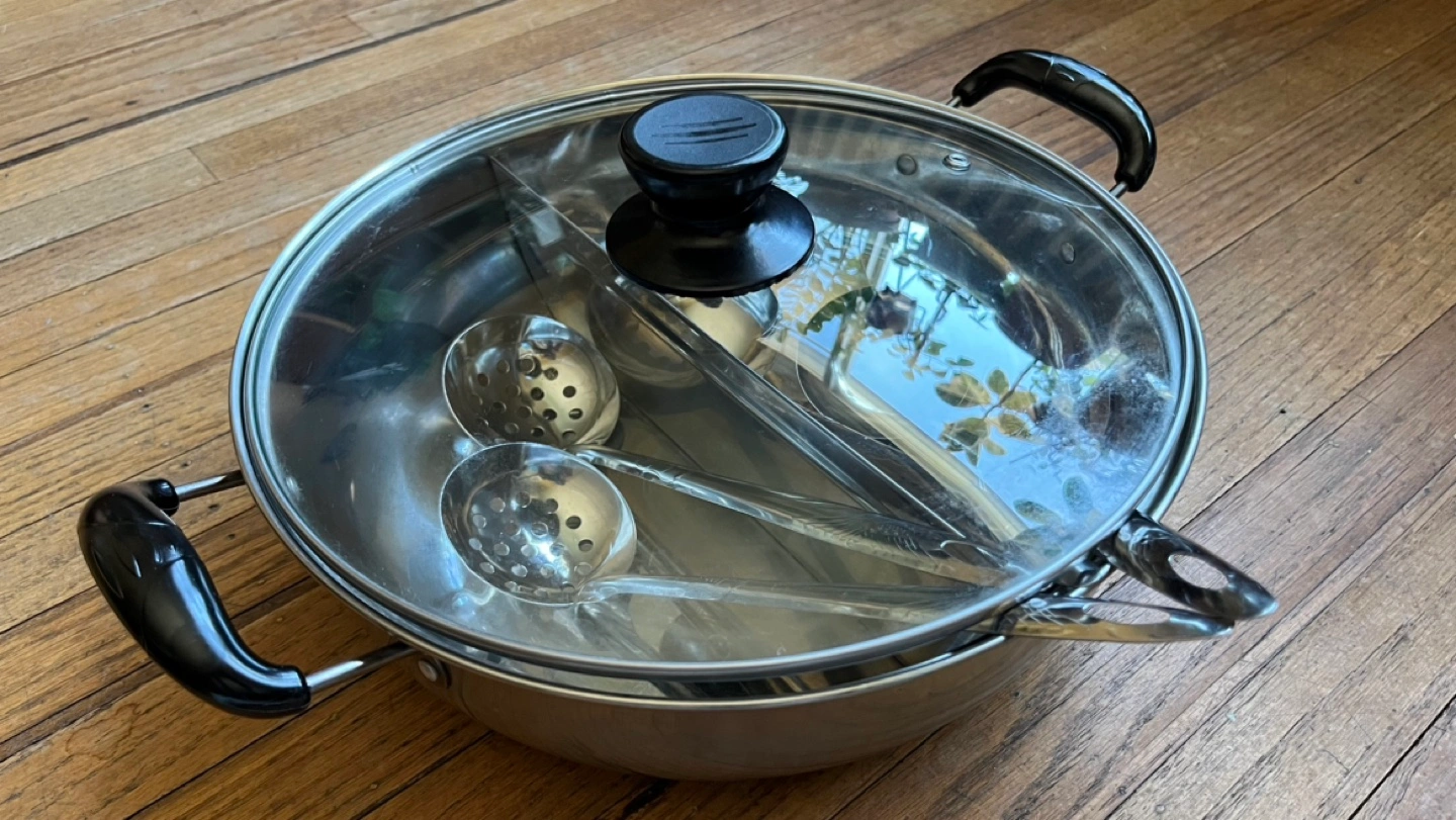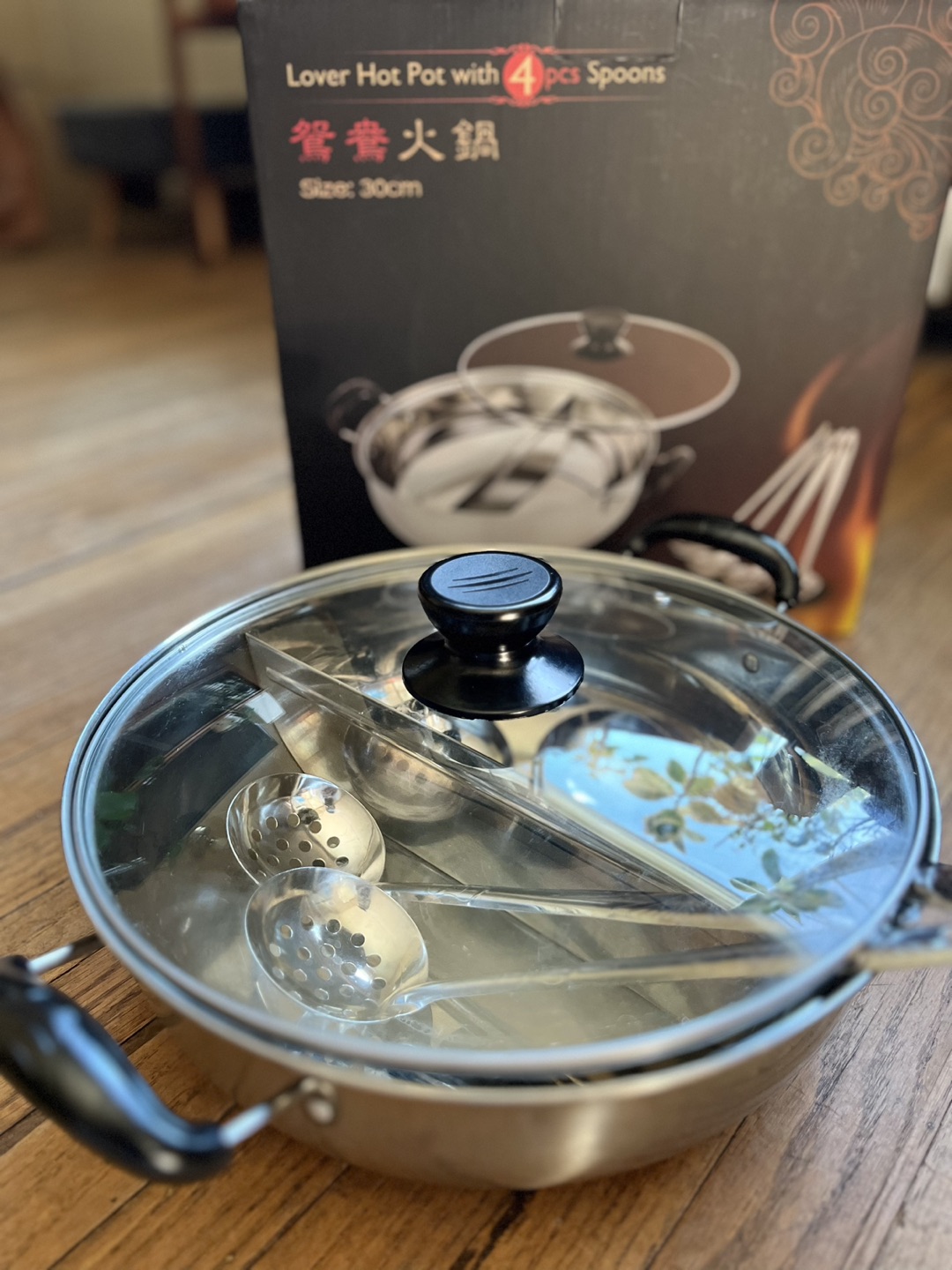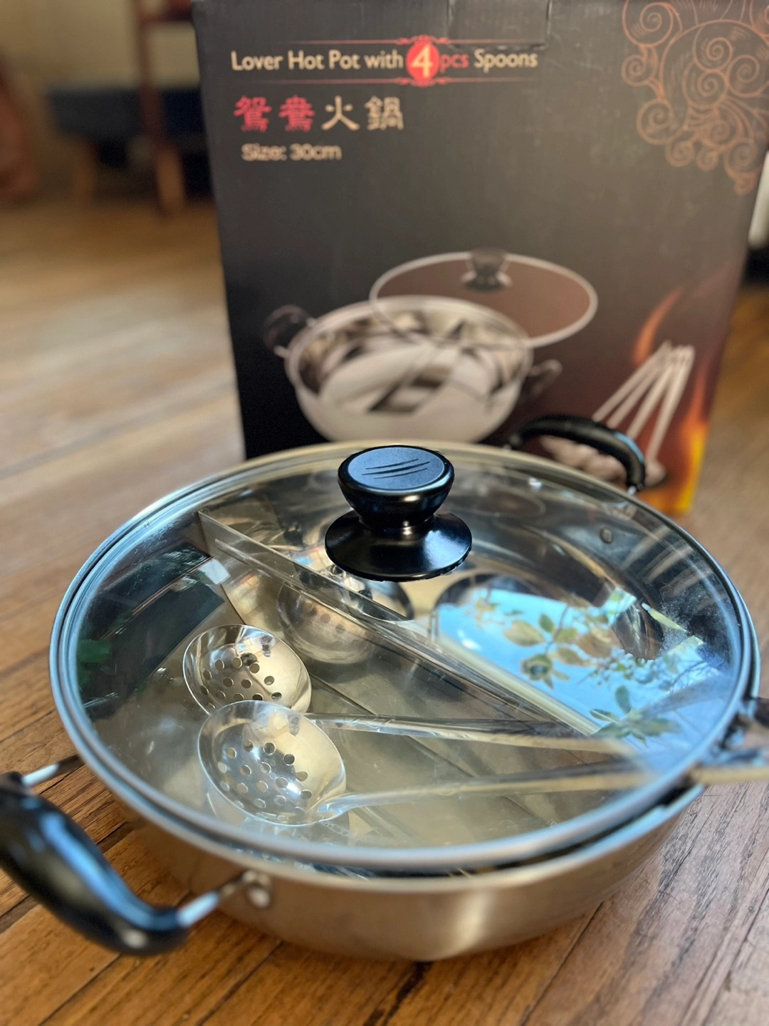 Hot pot set with pot divider for separate soup bases. Comes with two ladles and two slotted spoons.