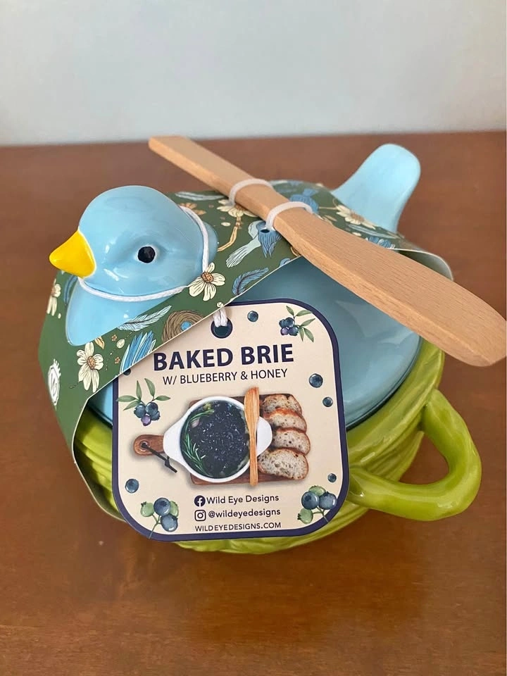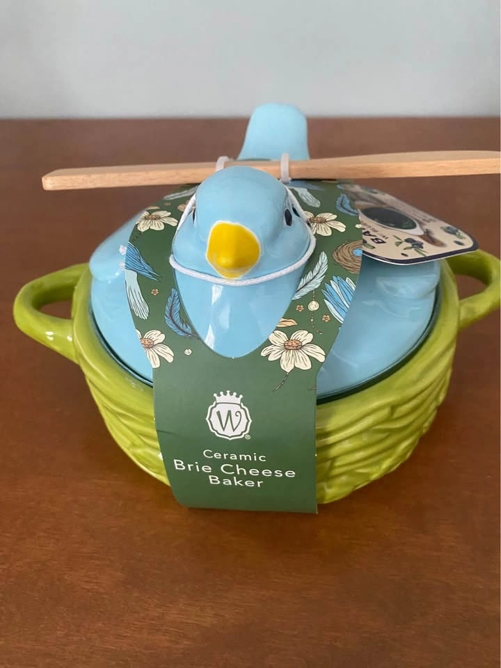 This is a very cute Wild Eye Designs Ceramic Brie Cheese Baker shaped like a bird. It is designed for baking brie cheese and serving appetizers. The set includes the ceramic baker dish with a lid and a small wooden spreader. The ceramic material is both oven and microwave safe. I also have the box that it came in, so suitable for gifting.