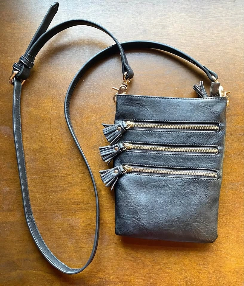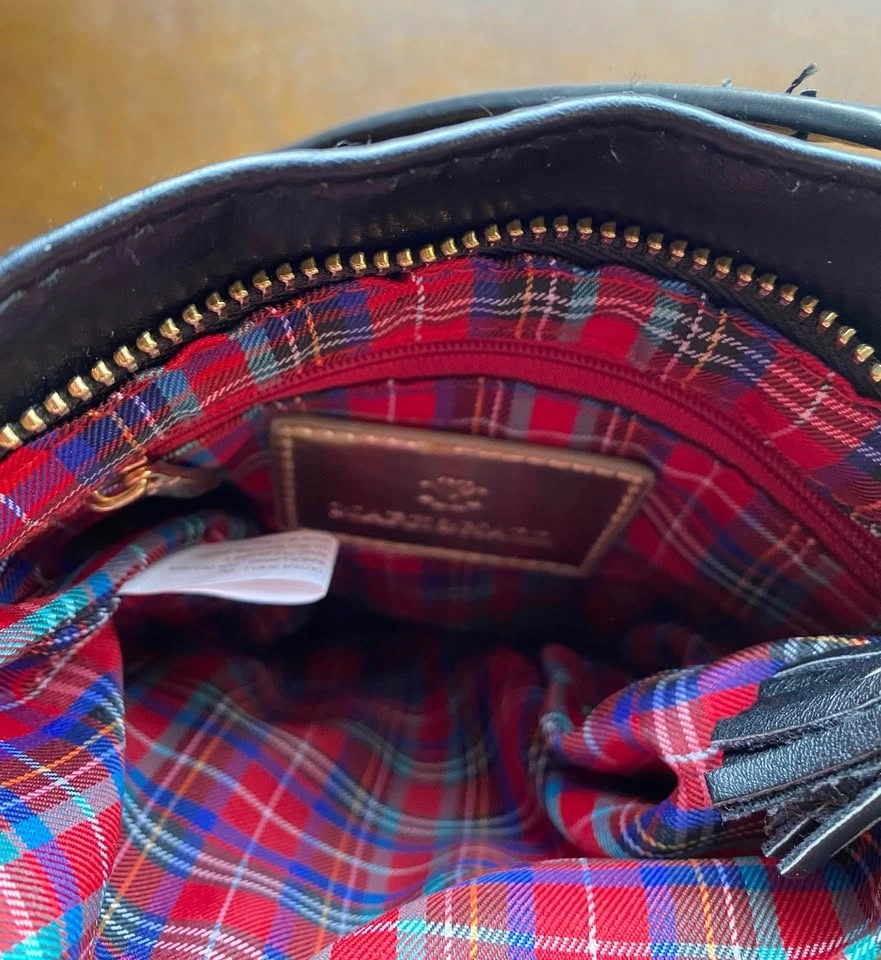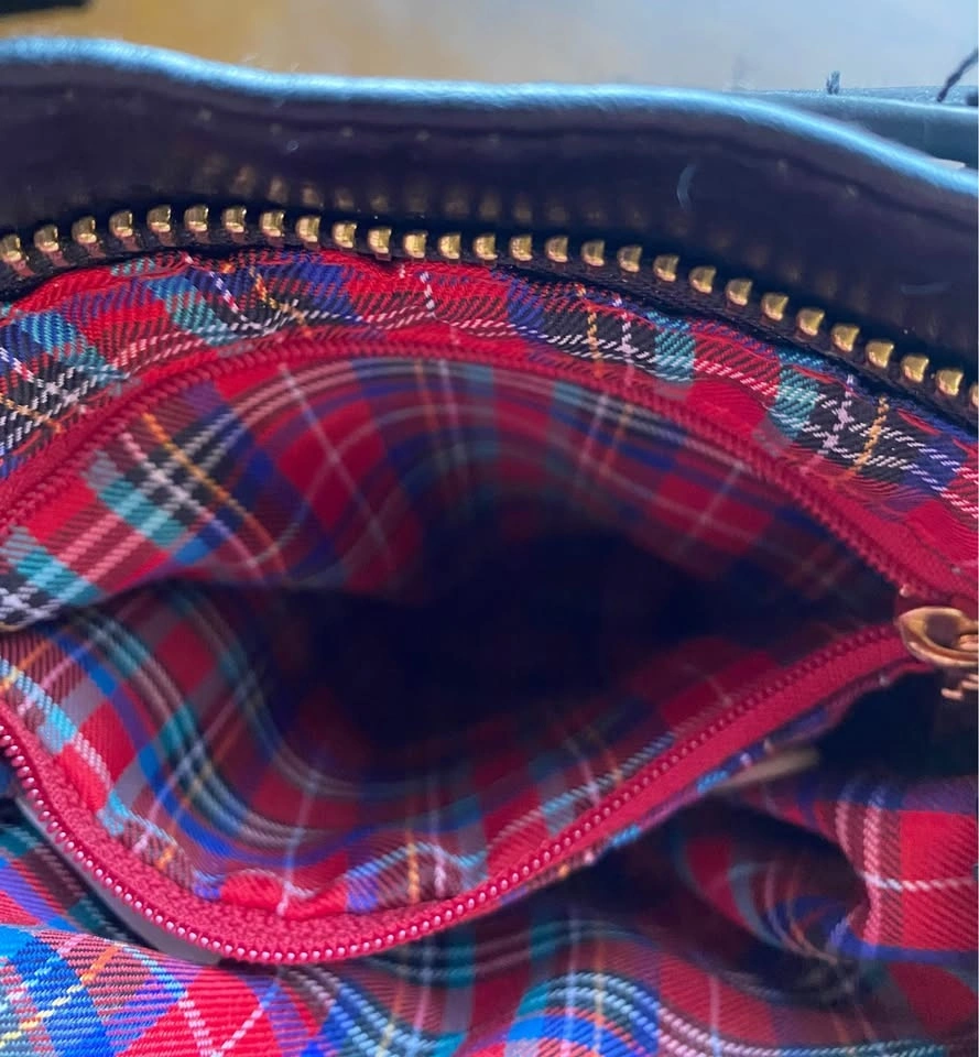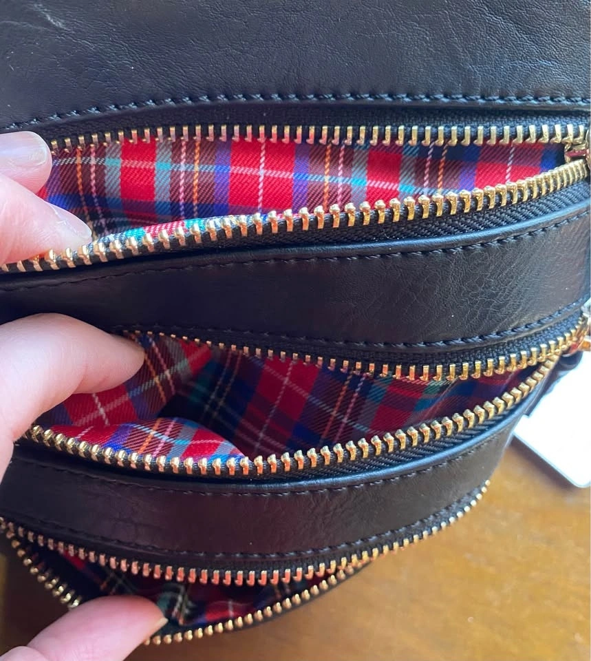 New without tags. Mark & Hall black faux leather crossbody bag with gold-tone hardware and three zipper tassels on outside pockets. One zipped pocket inside. Red plaid lining.