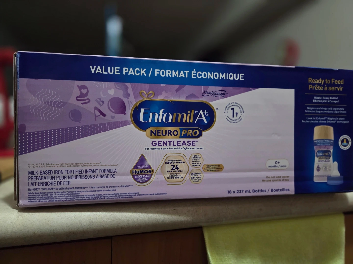 This value pack includes 15 ready-to-feed bottles of Enfamil A+ Neuro Pro Gentlease formula. Nipples and rings are sold separately. Formula is for babies 0+ months. Three were used out of this box....retails for $83+ tax