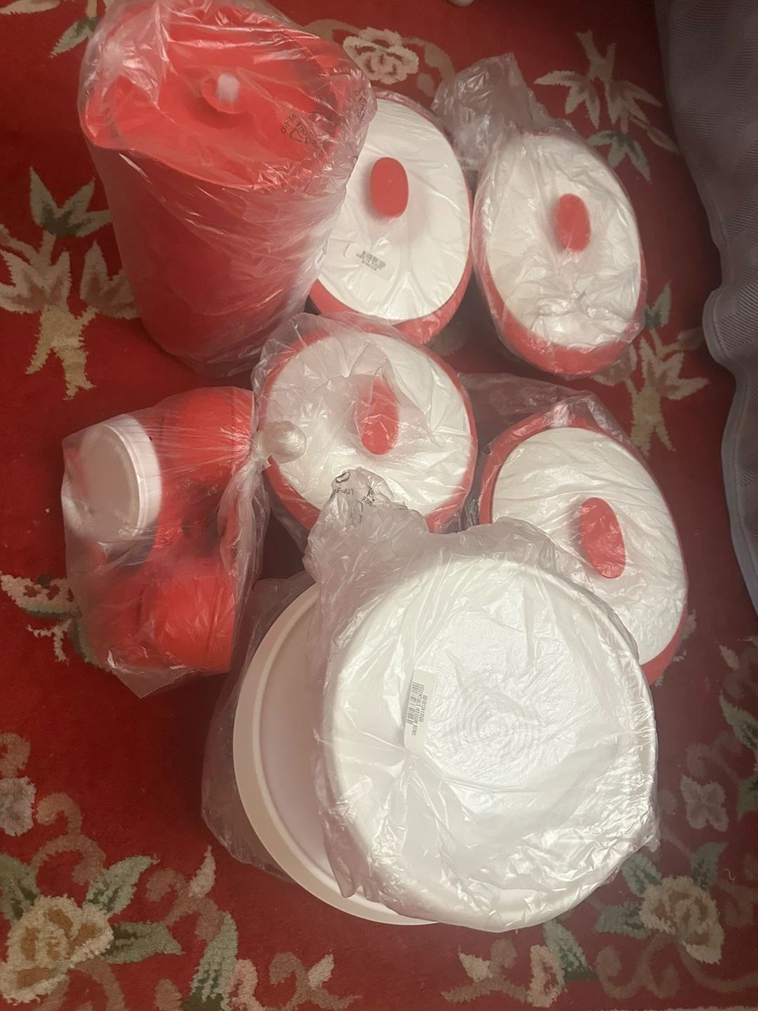Set of Tupperware Modular Mates square containers in red and white. These are great for organizing your pantry and keeping food fresh. Stacking design saves space.