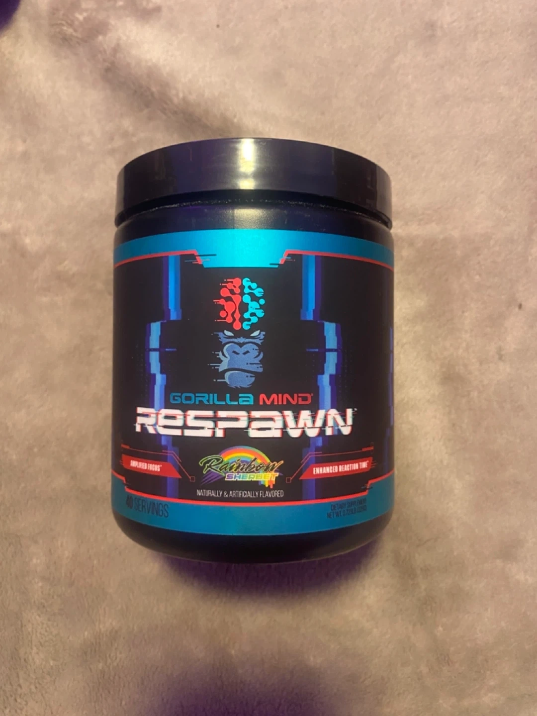 Gorilla Mind Respawn dietary supplement in Rainbow Sherbet flavour. It's naturally & artificially flavored with 40 servings. This product is designed for enhanced reaction time and amplified focus.