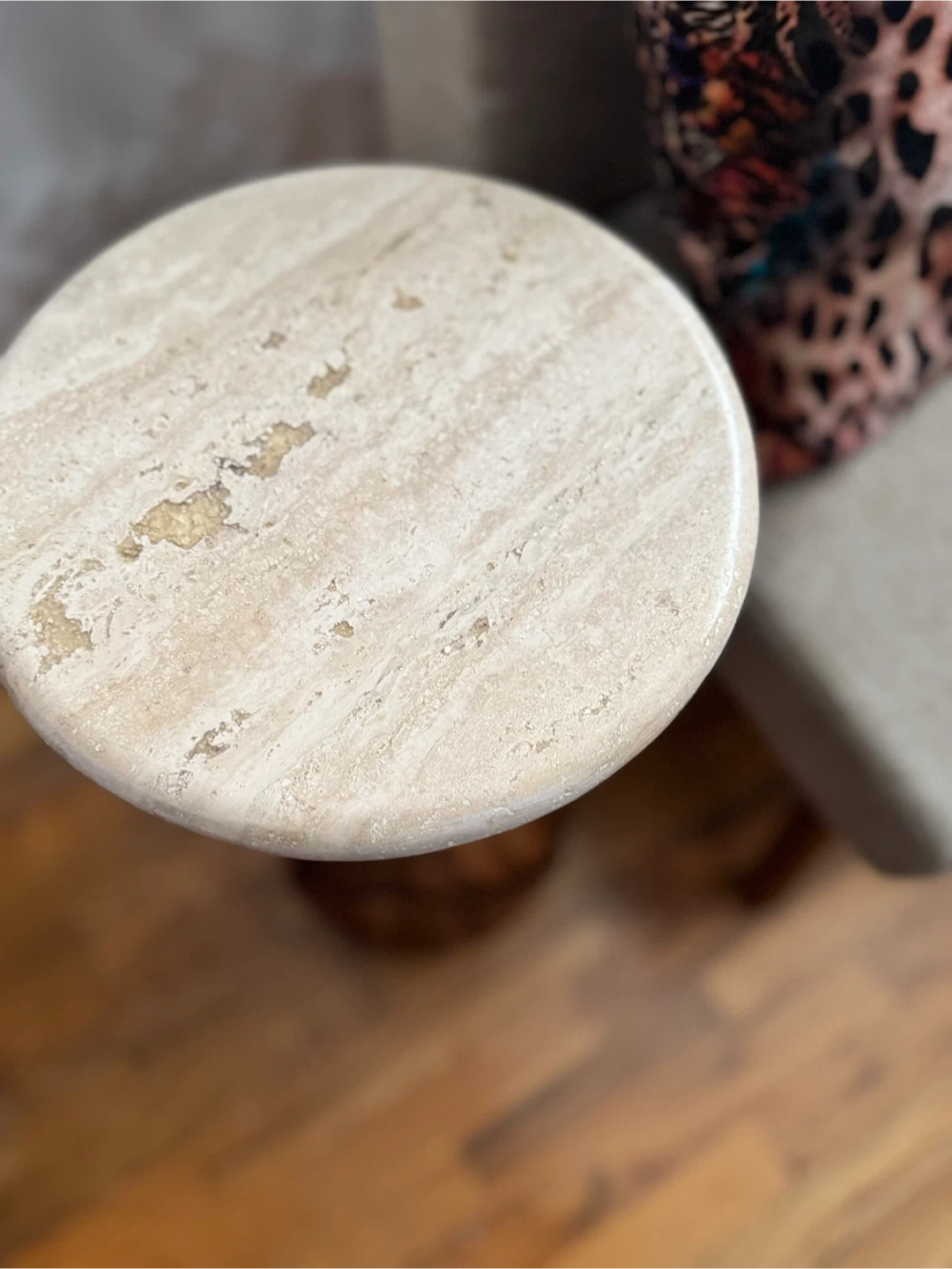 This eye-catching side table features a marble top and a carved wooden base shaped like a garlic bulb. It's a unique statement piece for any room. The table is approximately 22 inches tall with a 12-inch diameter top.