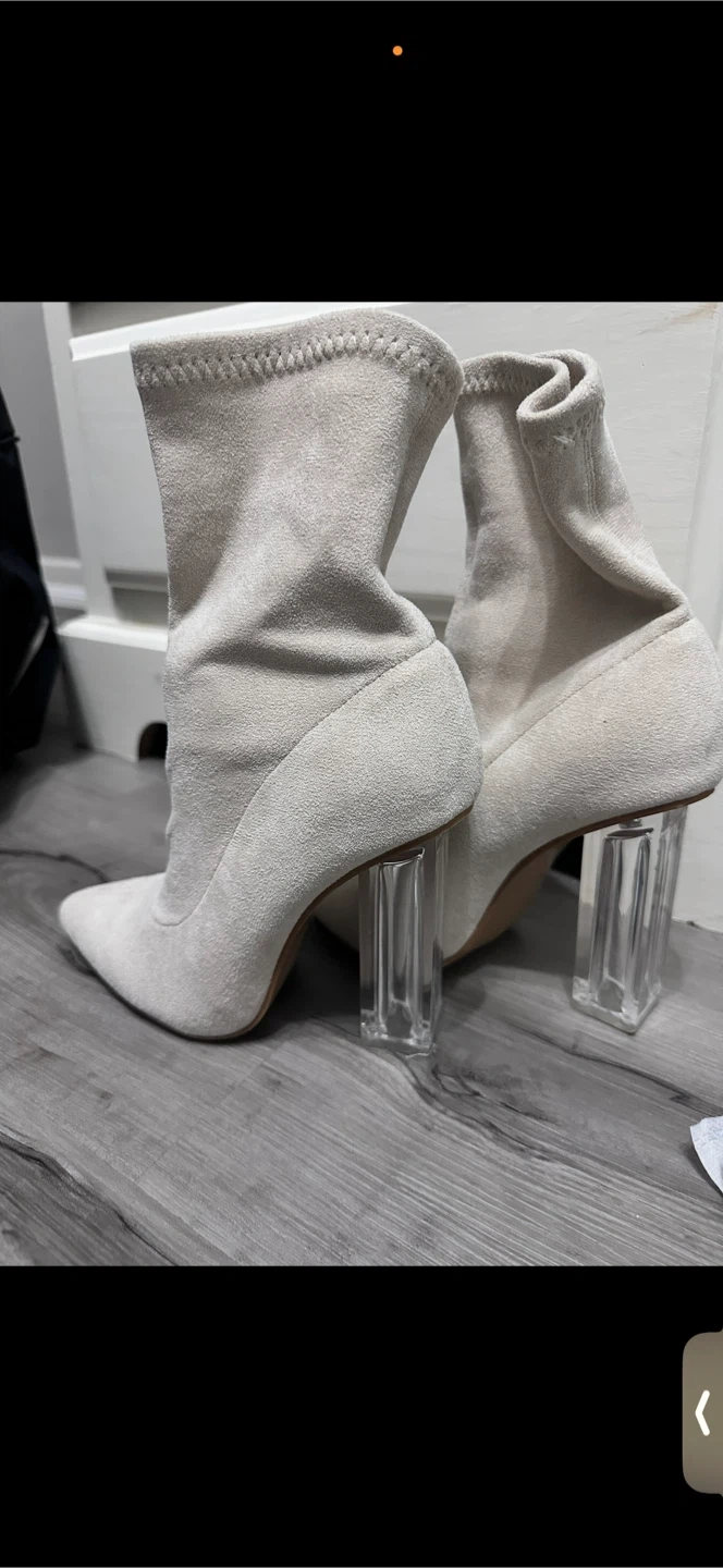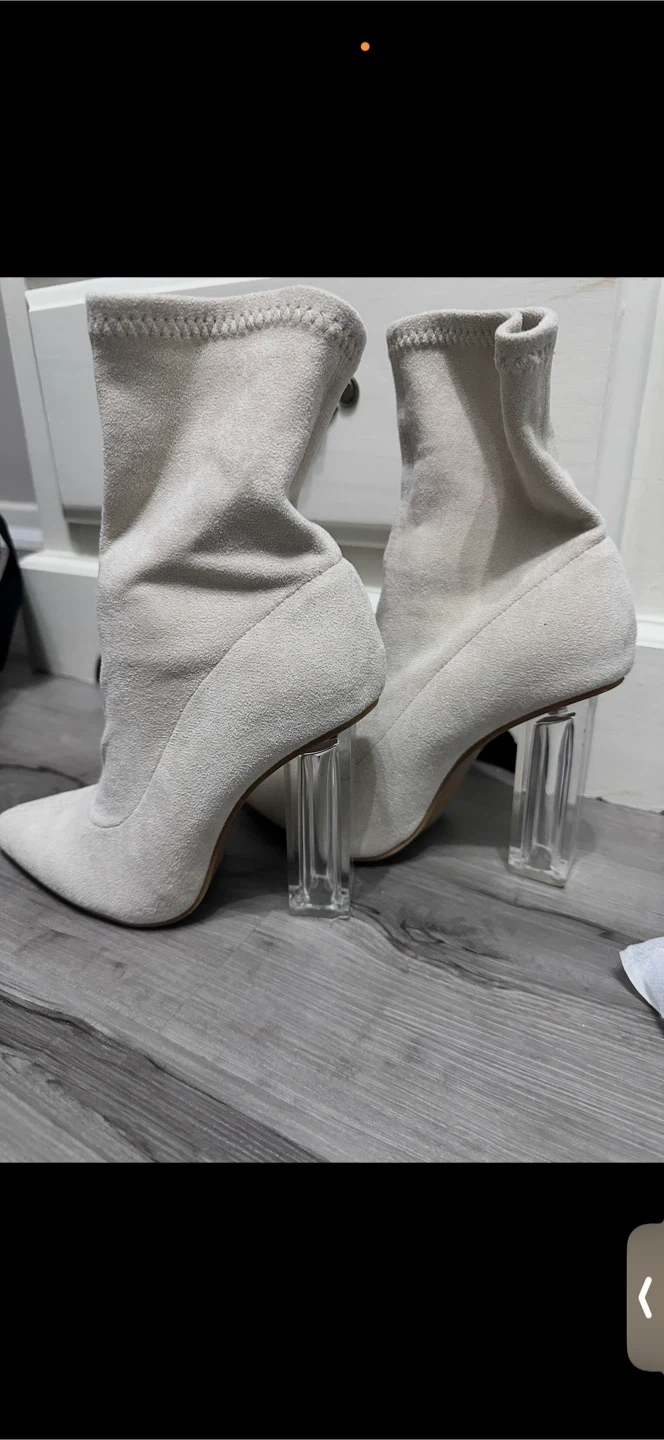 Stylish white ankle boots with a pointed toe and a clear block heel. The boots are made from a soft, suede-like material. They feature a stretch-fit shaft for comfort. Great for dressing up an outfit!