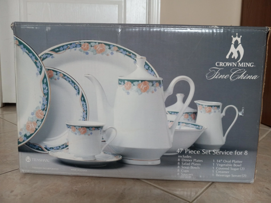 Fine China. Brand new, never used. 8 dinner, 8 salad, 8 soup, 8 cups, 8 saucers, 1 oval platter, 1 veg. bowl server, coffee/tea server, covered sugar, creamer. Giftable for Christmas, wedding shower, birthday or housewarming. Pick up near Kennedy and Eglinton.