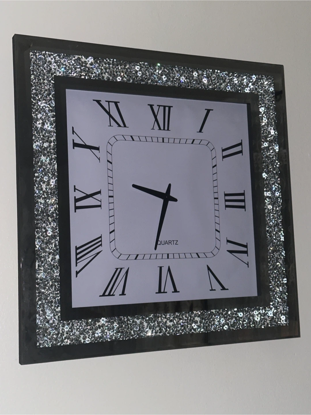 This is a square wall clock with a black frame and a sparkly glitter border. It features Roman numerals on the face and a quartz movement. It's a stylish addition to any room!