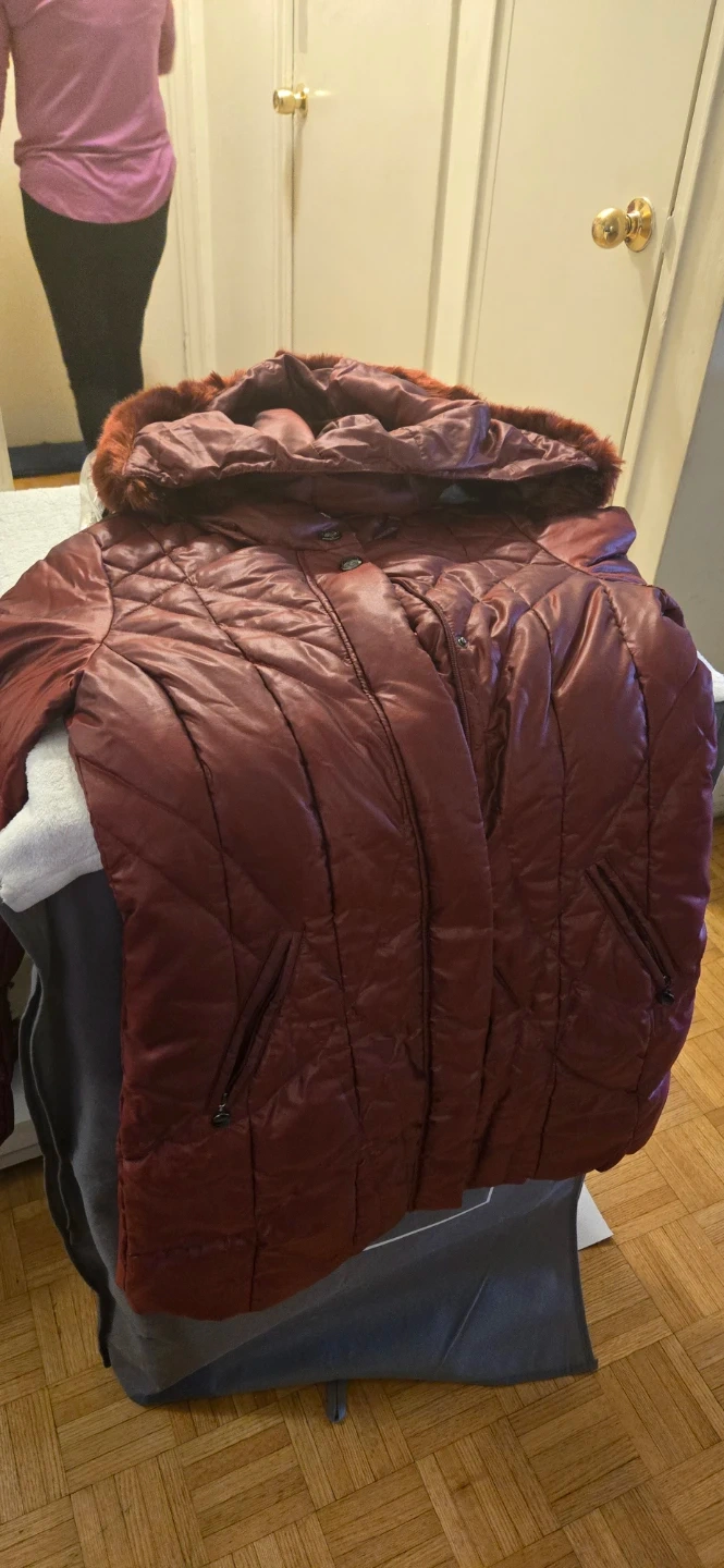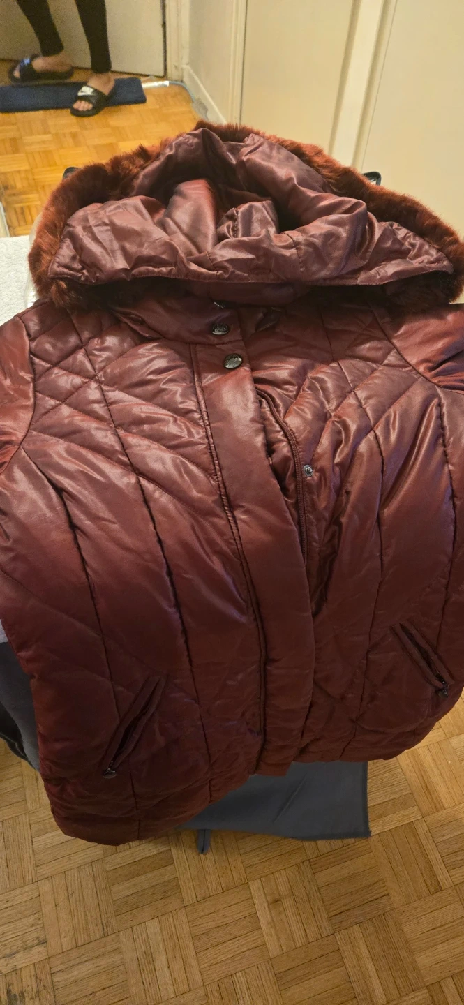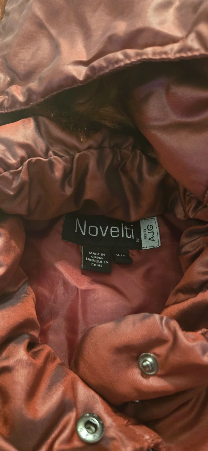 Here's a burgundy puffer jacket from Novelti! It's in good condition and features a faux fur hood. Perfect for staying warm during the colder months!