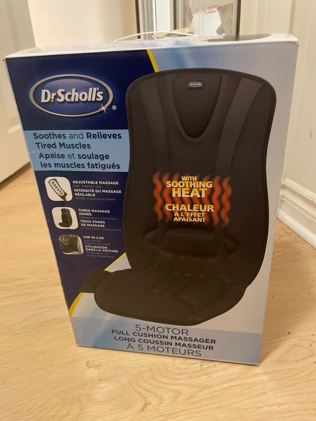 Selling a Dr. Scholl's Soothing 5-Motor Full Cushion Massager! It has five motors for direct massage and soothing heat massage to provide comfort for aching back muscles. It also soothes and relieves tired muscles. Comes with auto and AC adapters included