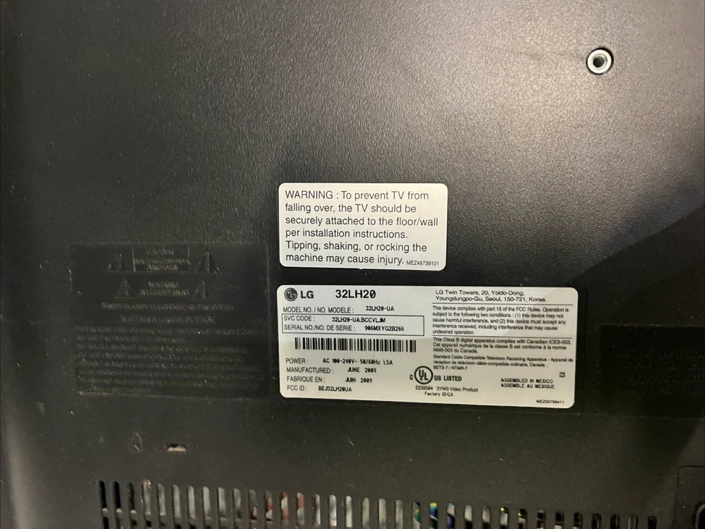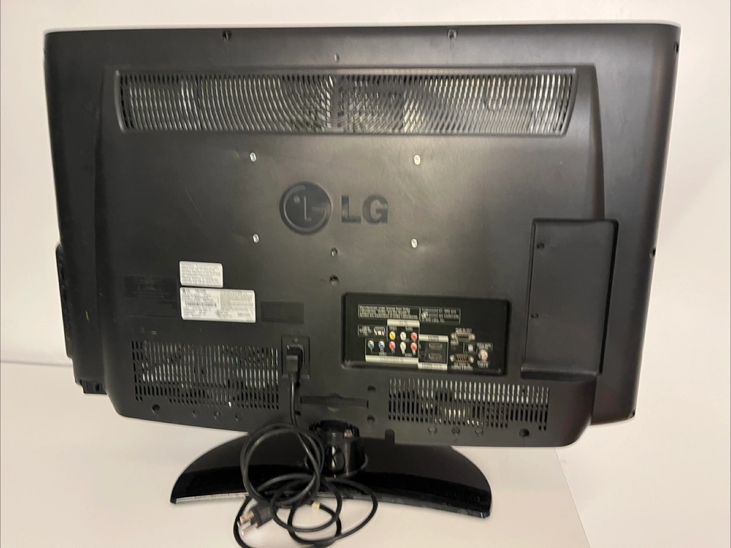LG 32LH20 32-inch LCD TV. Manufactured in June 2009. It's a black television with a glossy finish. Includes multiple AV inputs like component, HDMI, and RGB. There’s small issue with burnt pixels above of the screen.