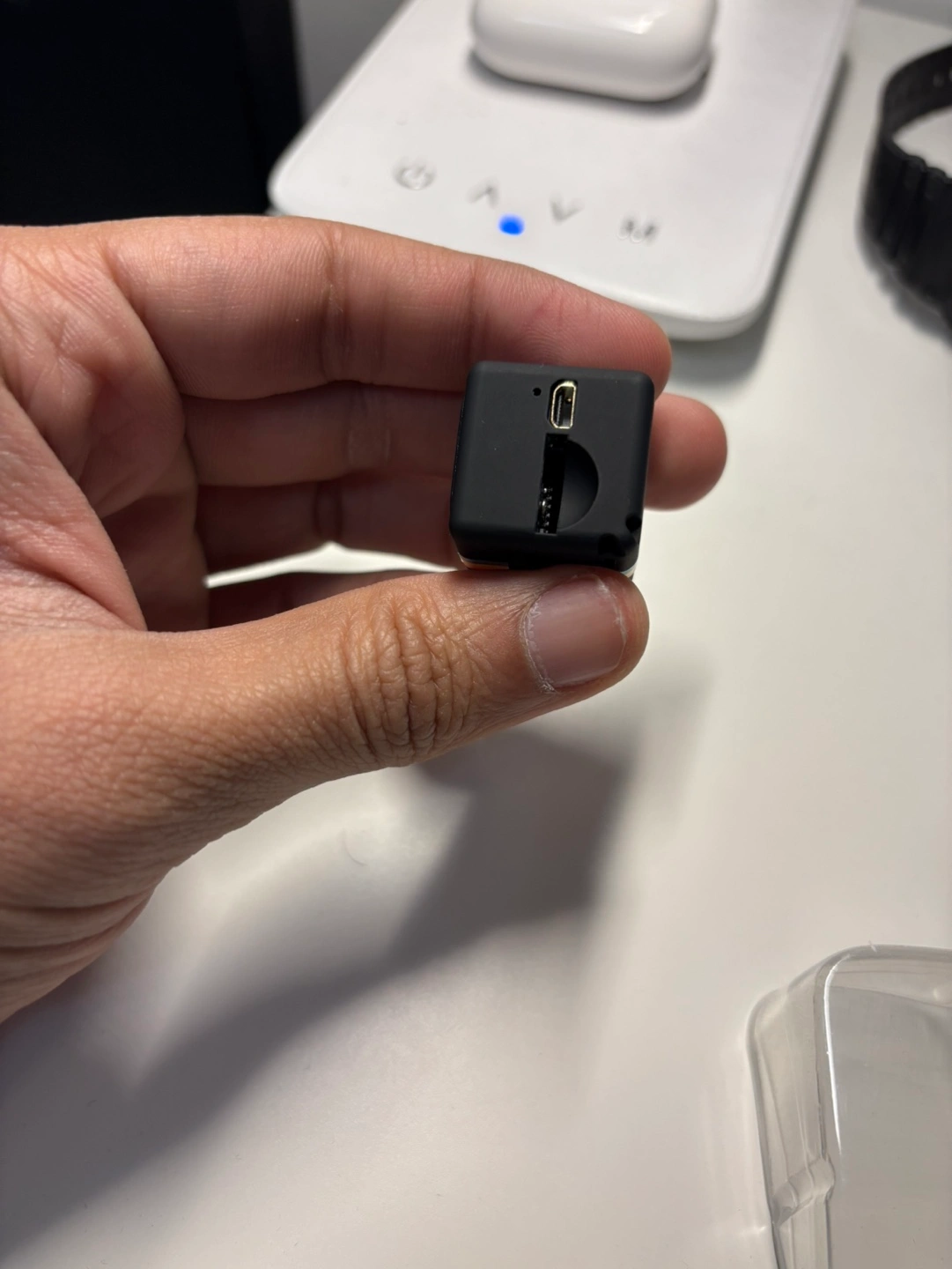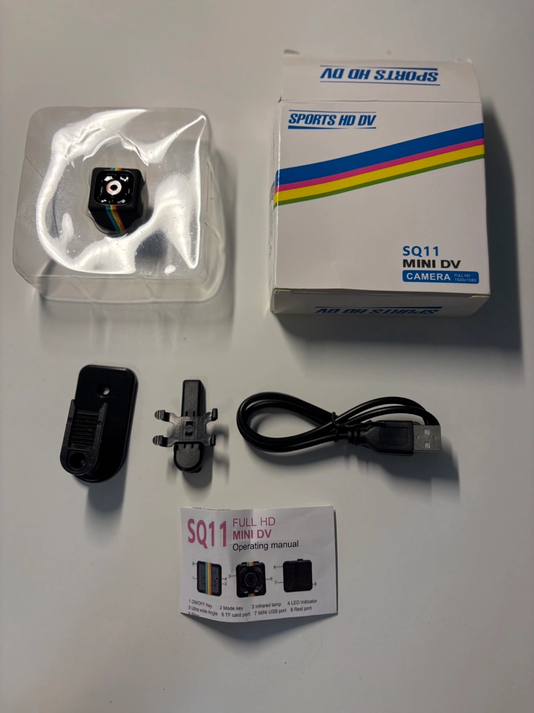 Mini 1080p camera. Records videos in Full HD. Includes USB cable, instruction manual, and mounting clip. Small and discreet design. Micro-SD card compatible (not included)