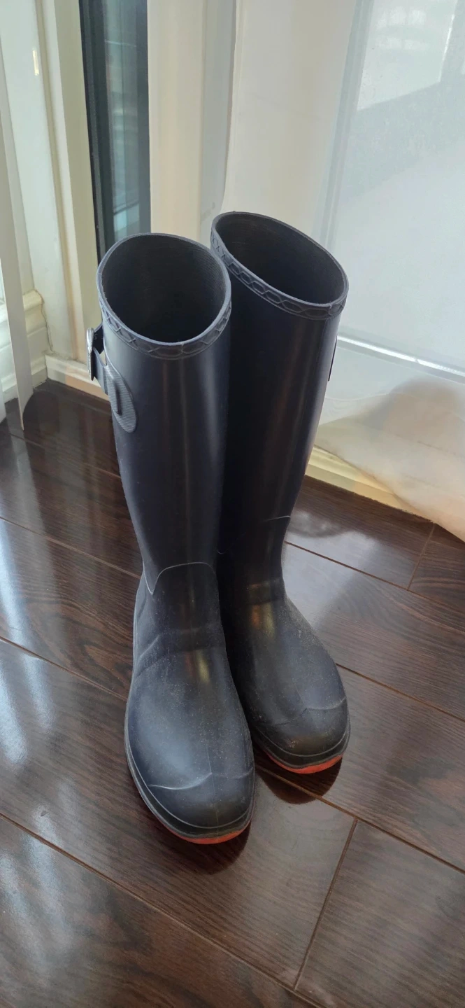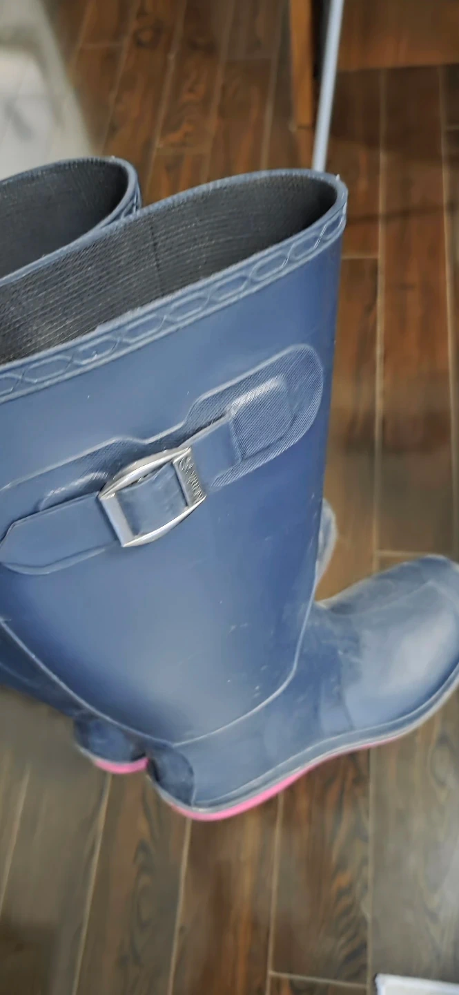 These navy blue rubber rain boots are a size 7.5-8. Perfect for keeping your feet dry on rainy days! Selling because I bought them and have not used them at all...