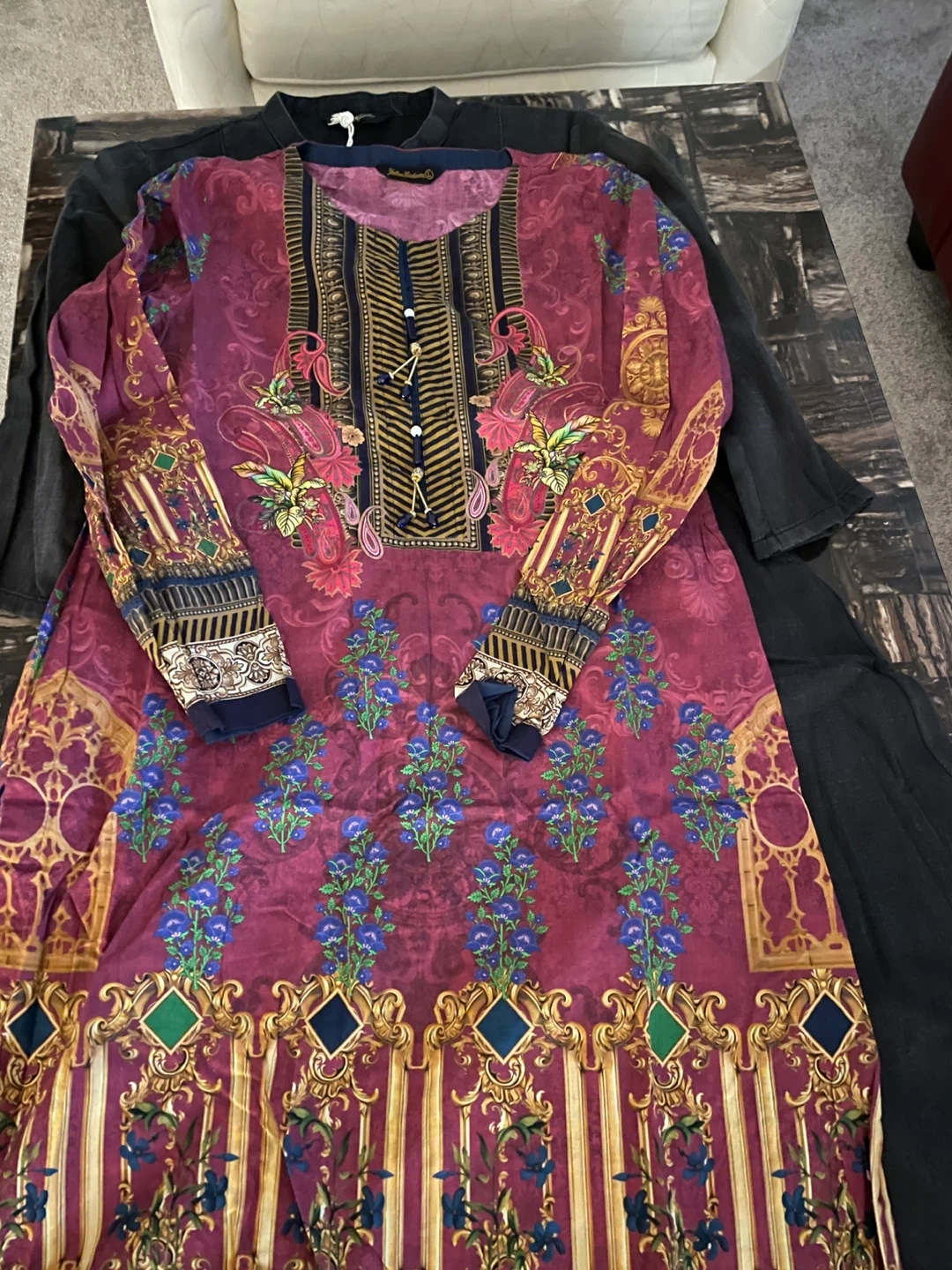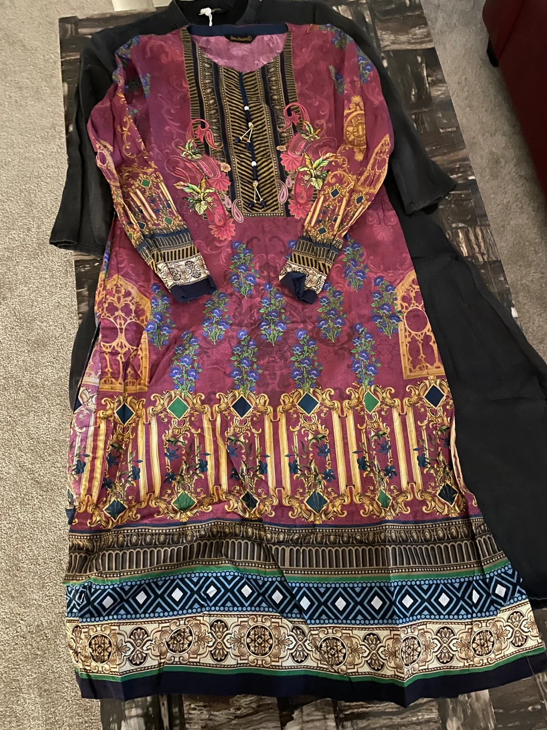 This is a women's kurti with a vibrant pink base and a detailed floral and paisley print. It features a long-sleeved design with ornate cuffs and a decorative neckline with gold accents. The fabric has a soft sheen and the print includes blue floral motifs and ornate borders. It's a stylish piece perfect for casual wear or cultural events.