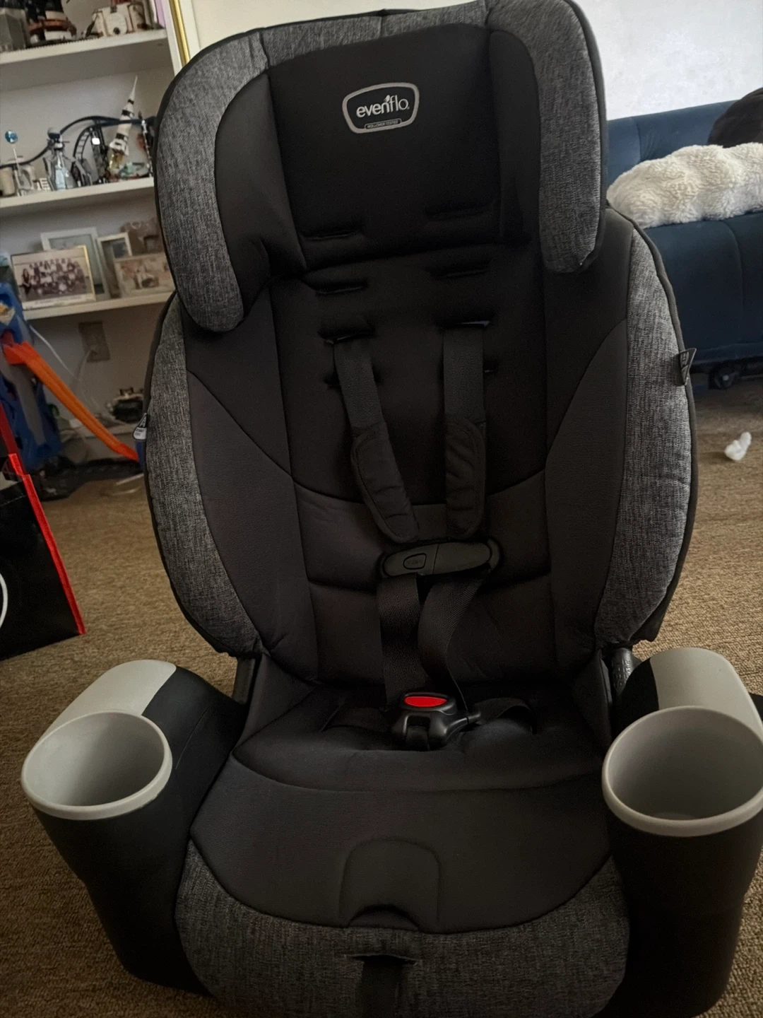 This is an Evenflo Maestro Sport car seat. It's designed for children weighing 10-22.7 kg (22-50 lb) and heights up to 71 cm (28-50 in). It features a 5-point harness system. Suitable for kids aged 2 and up.