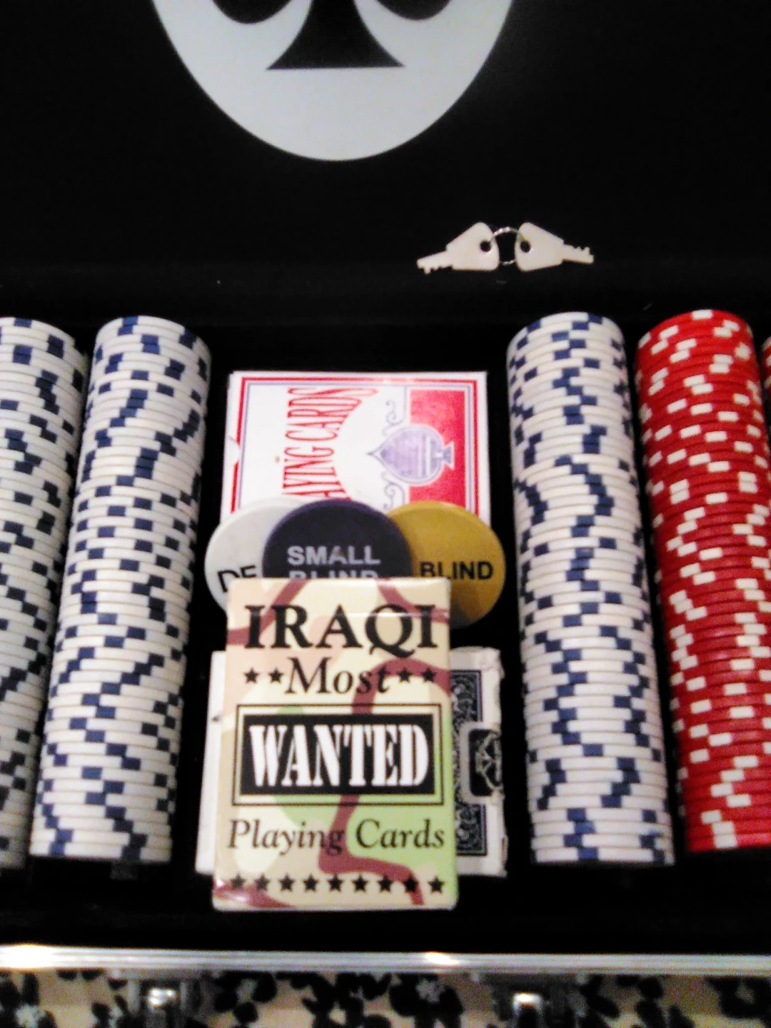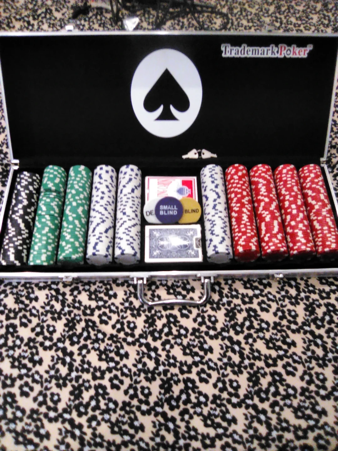 This is a TrademarkPoker 500 chip poker set. It comes with two decks of cards and two blind buttons. Includes a locking case with keys.