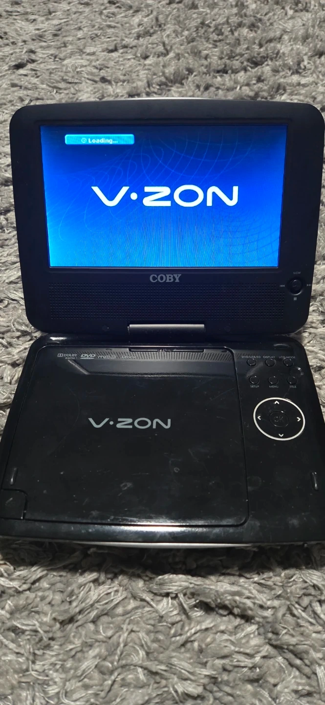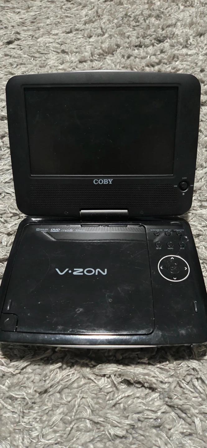Selling a used Coby V.ZON portable DVD player. It shows some signs of wear. Perfect for watching movies on the go. Comes with power cord.