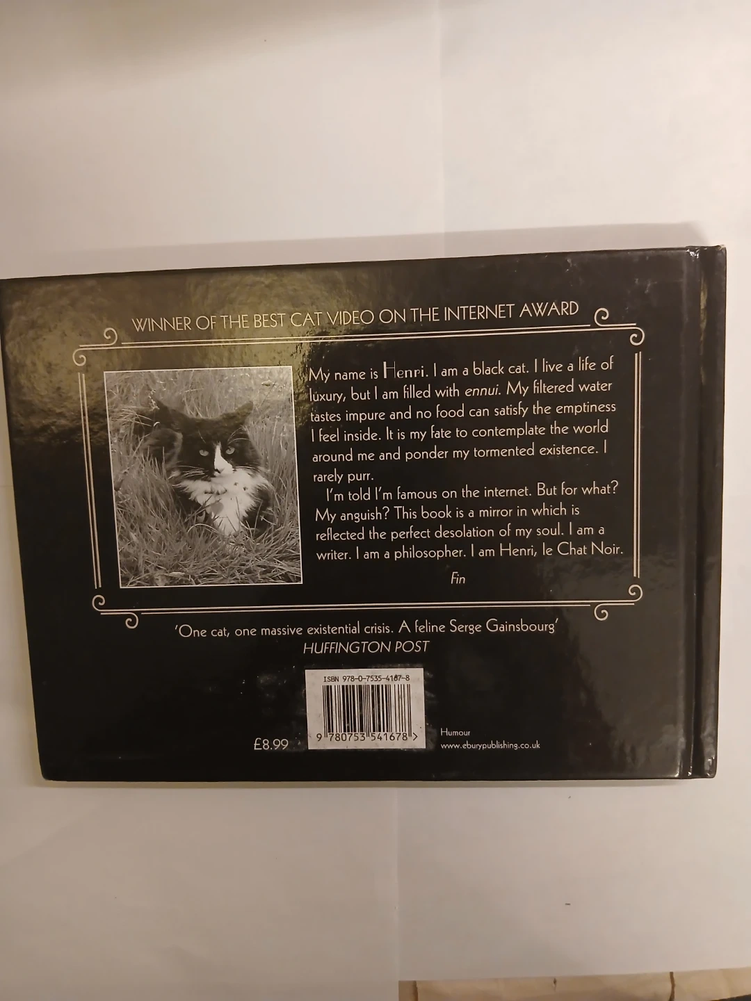 This book is "Henri, le Chat Noir: The Existential Mewsings of an Angst-Filled Cat" by William Braden. It features the musings of a black cat named Henri. The book was a winner of the Best Cat Video on the Internet award and has 10 million fans on YouTube.