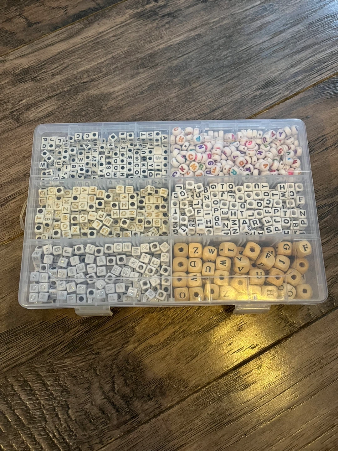 Includes a variety of letter beads for crafting. It contains white beads with black letters, colourful beads with letters, and natural wood beads with letters. The beads are organized in a clear plastic case