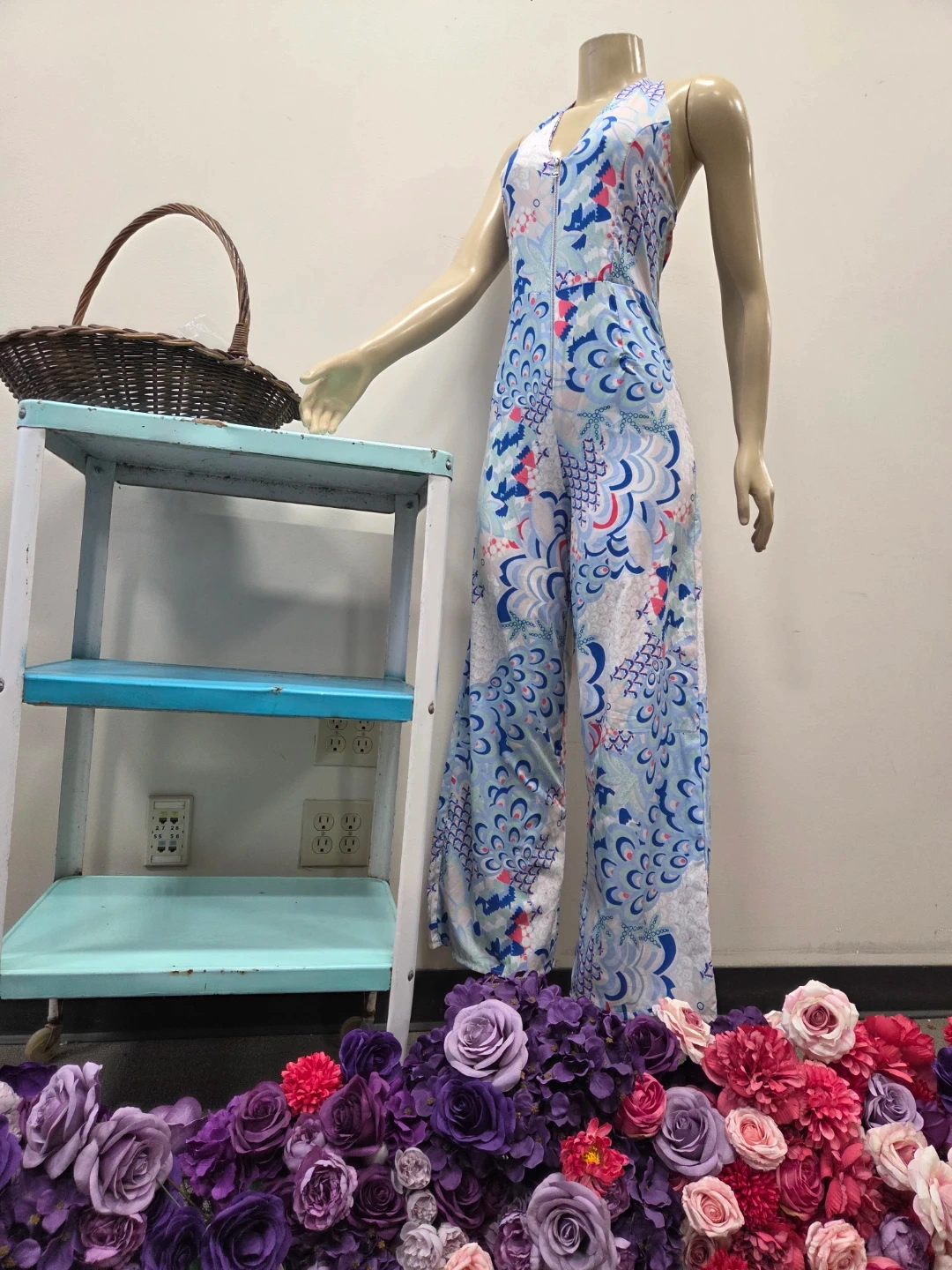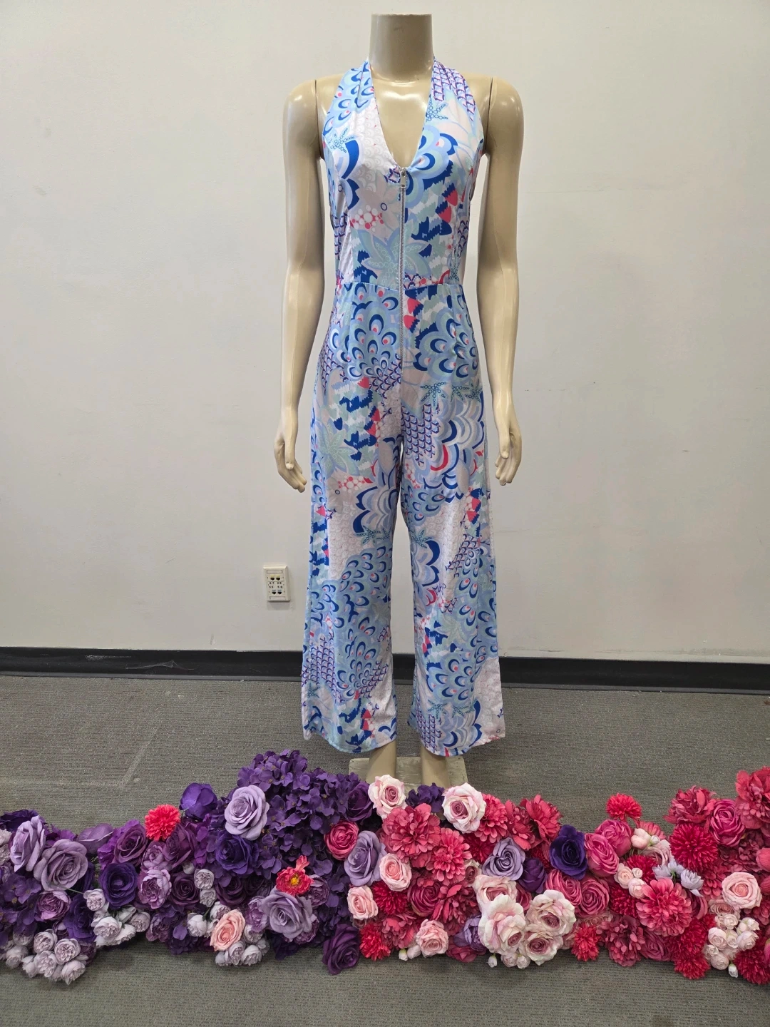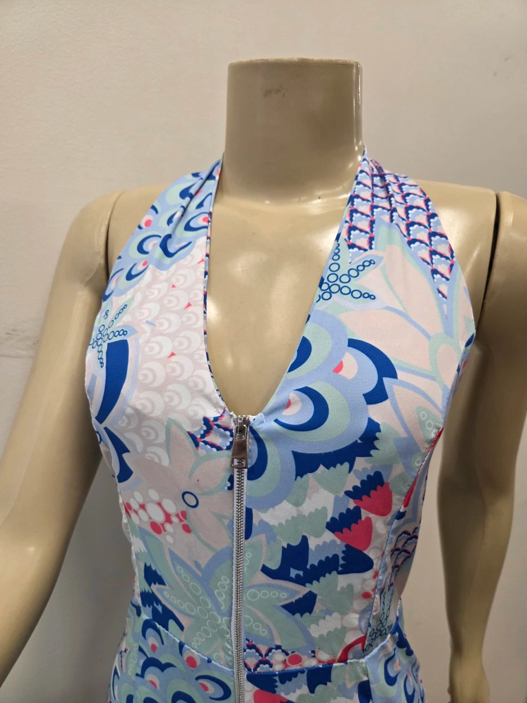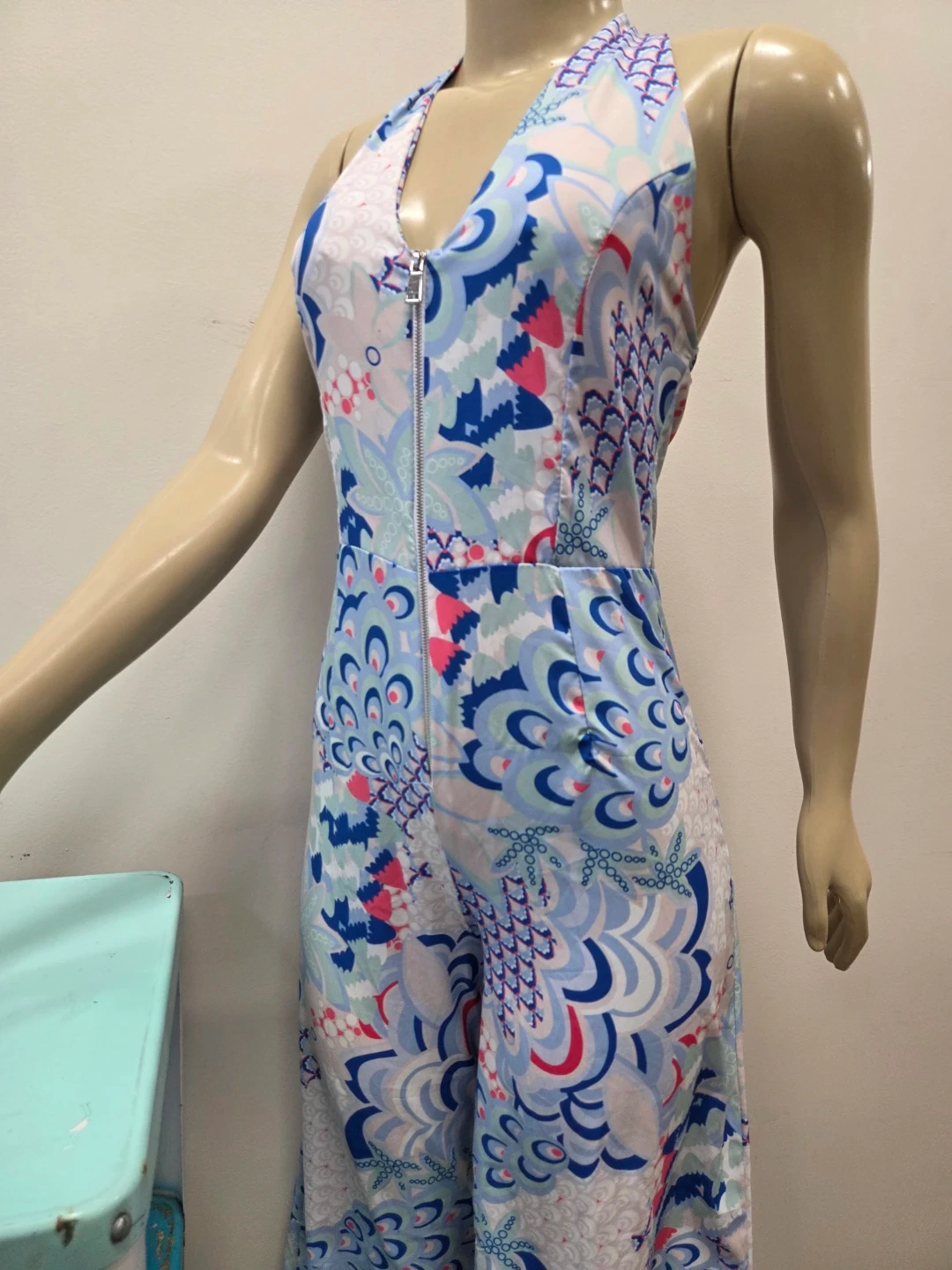 This stylish jumpsuit features a bold blue, pink, and white floral pattern with a halter neckline and a front zipper closure. It is new old stock with tags vintage item never worn. I purchased it in Europe.