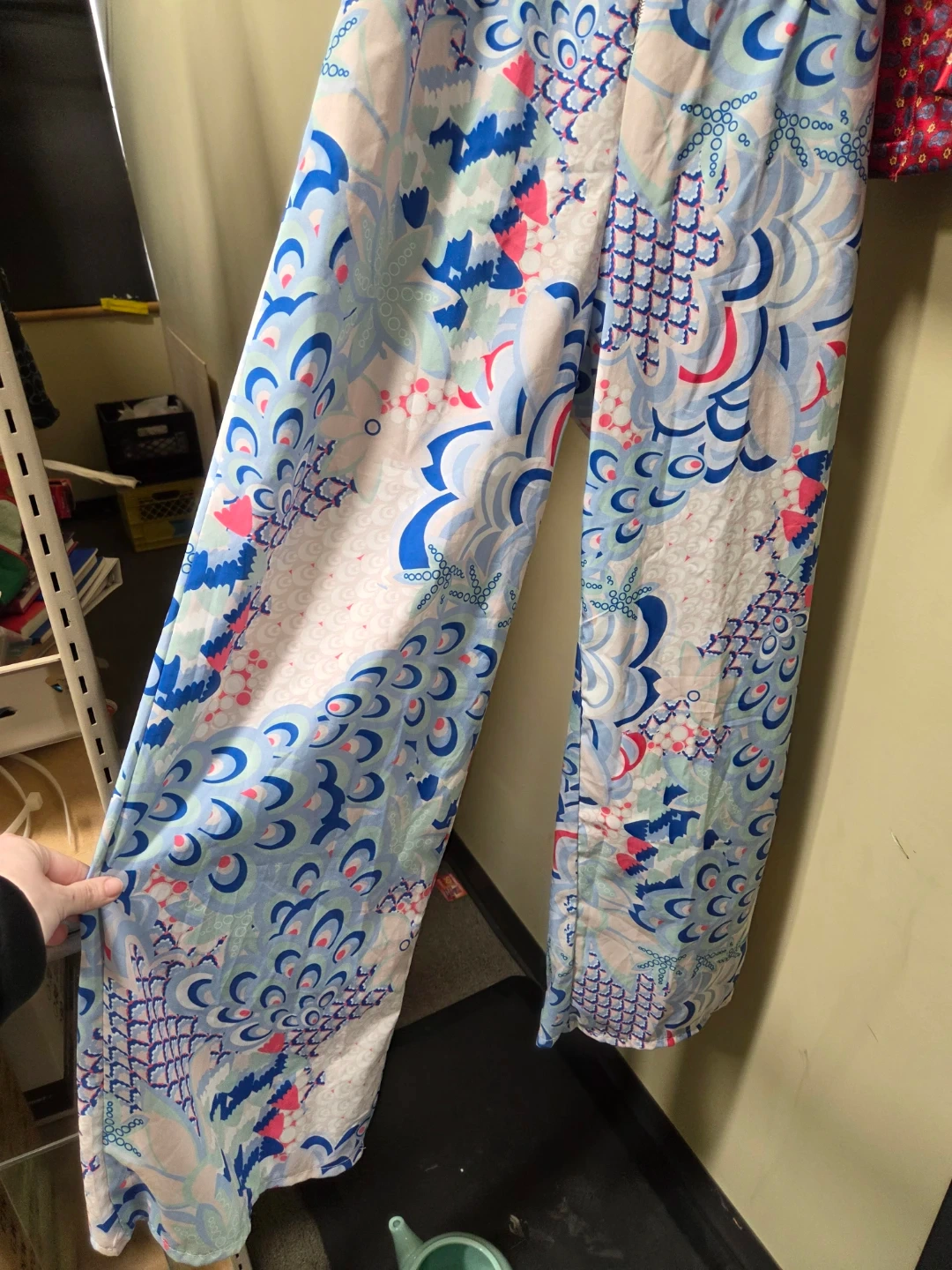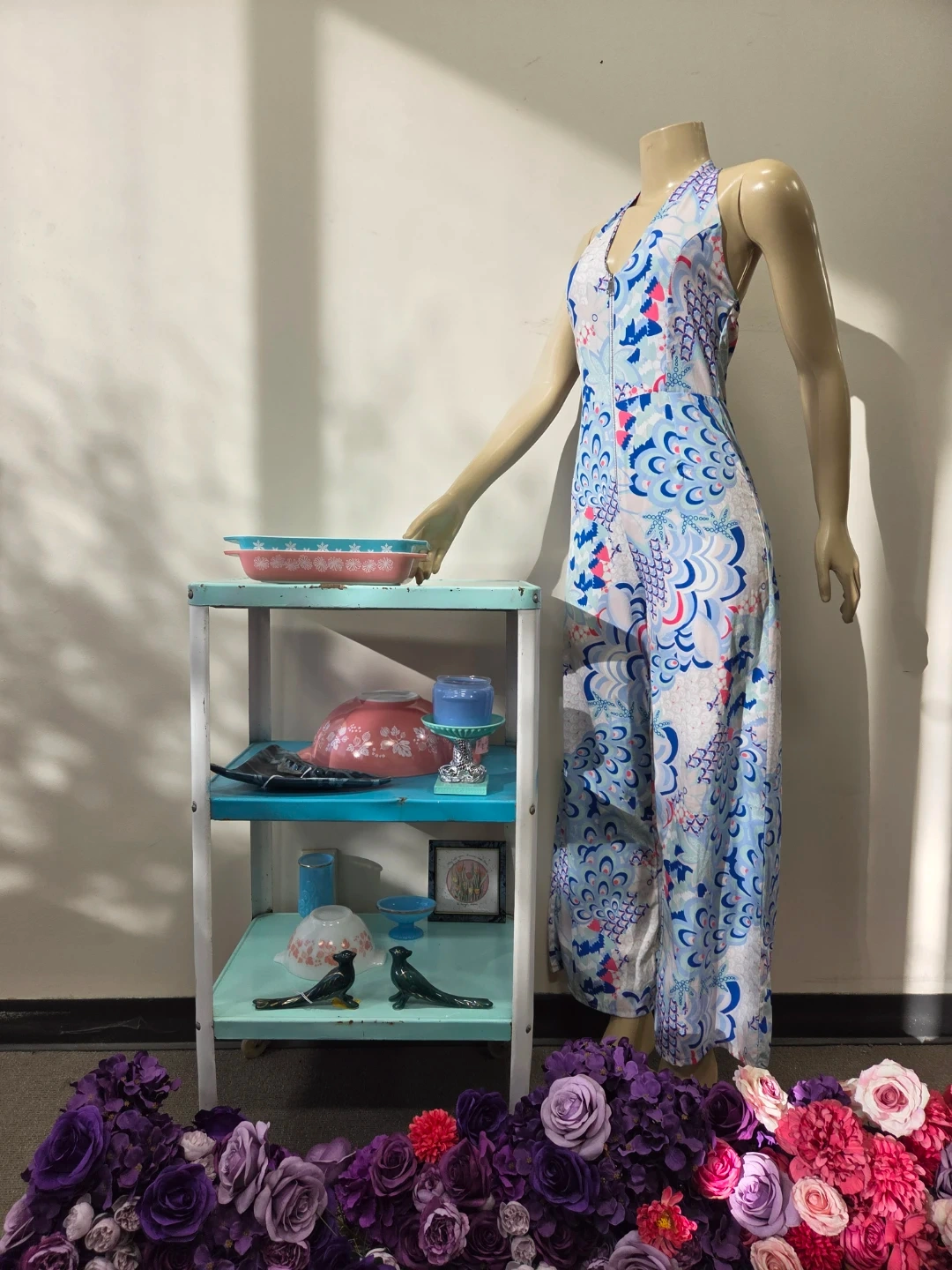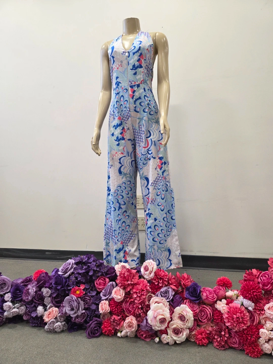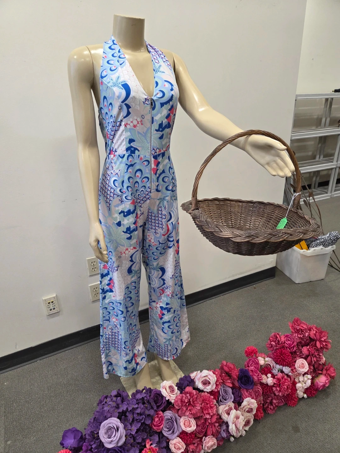 This stylish jumpsuit features a bold blue, pink, and white floral pattern with a halter neckline and a front zipper closure. It is new old stock with tags vintage item never worn. I purchased it in Europe.