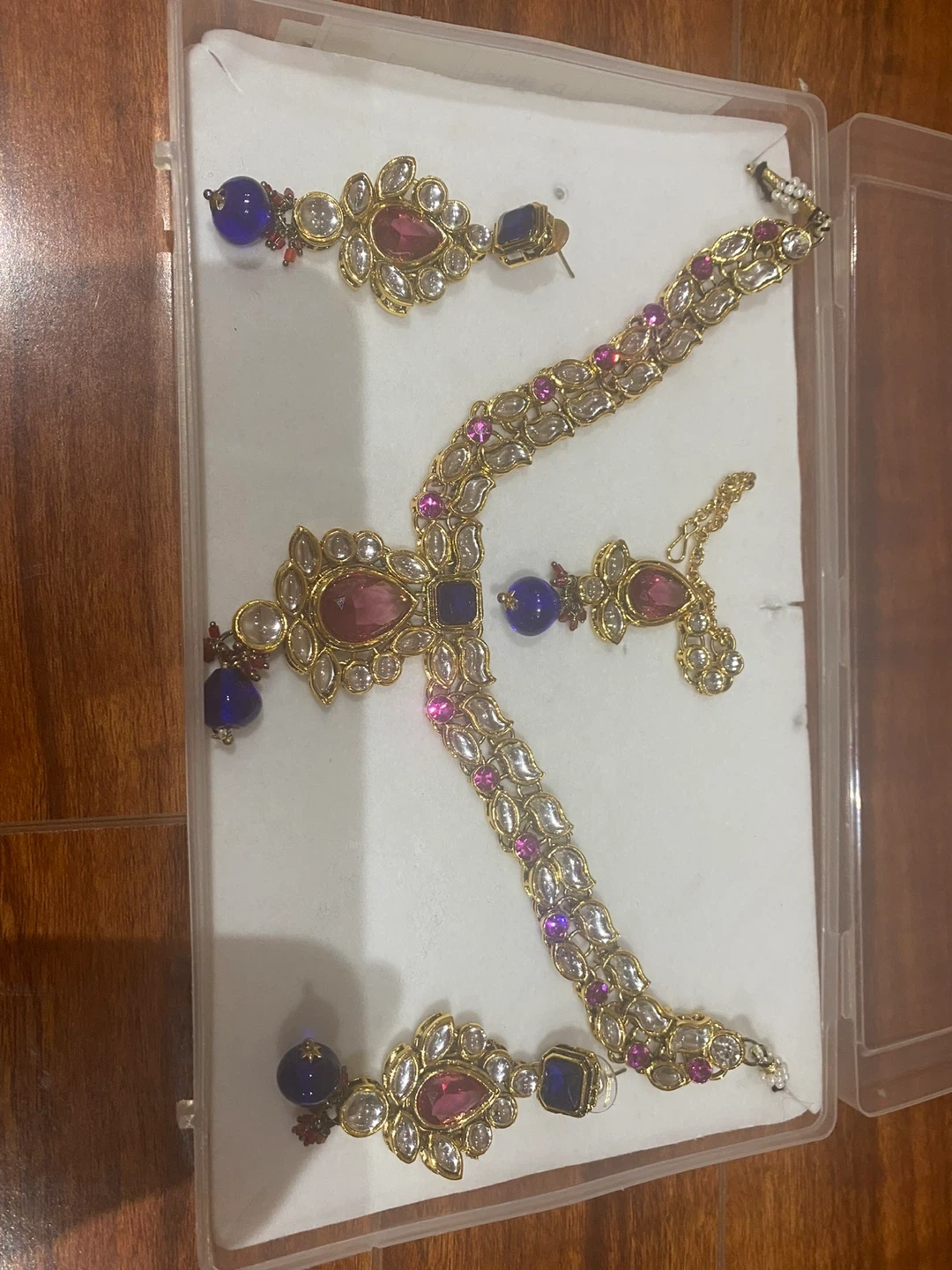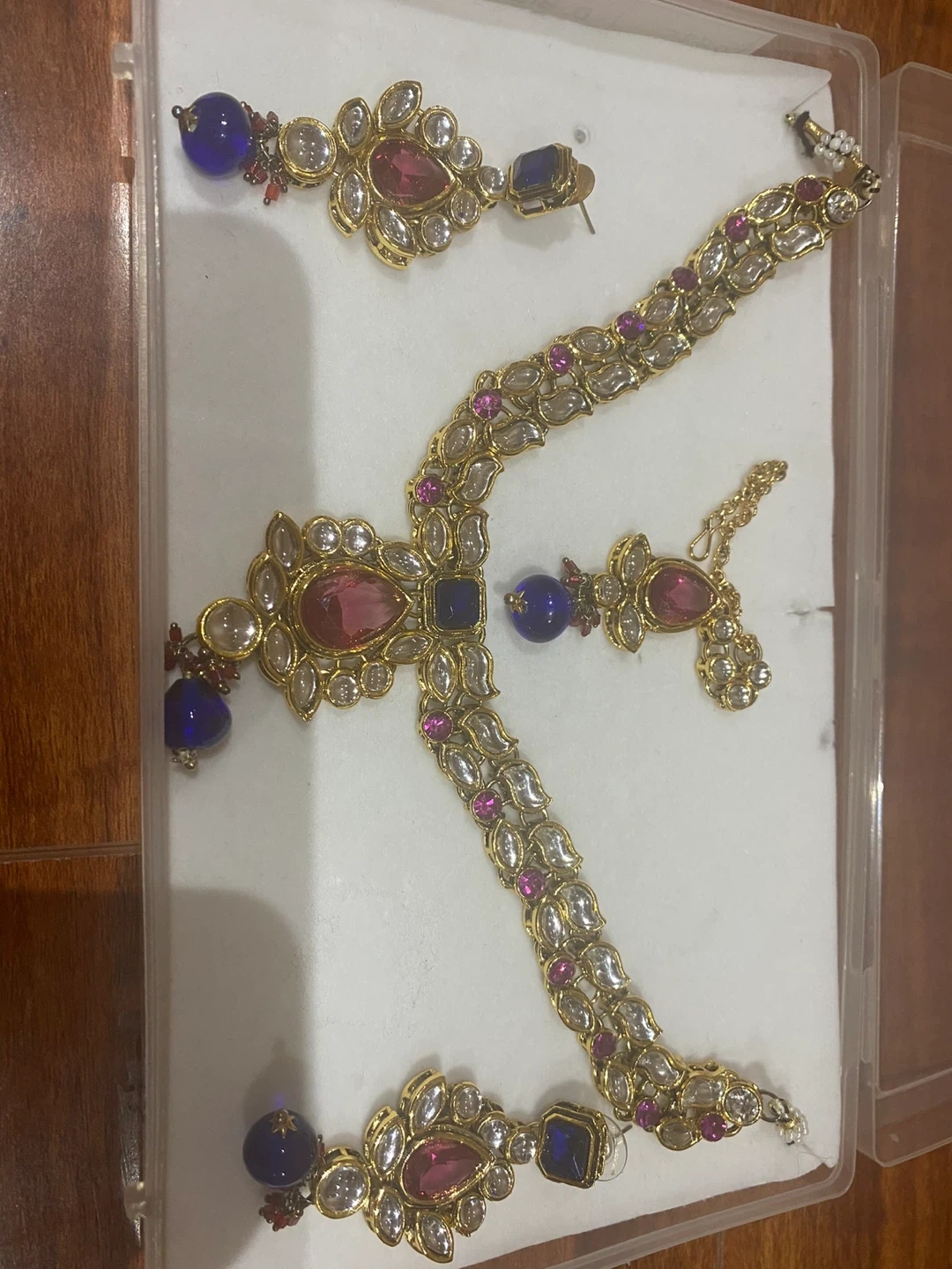 This set includes a necklace and a pair of earrings. It's detailed with pink and blue stones and gold-tone accents. This jewellery set is suitable for special occasions.
