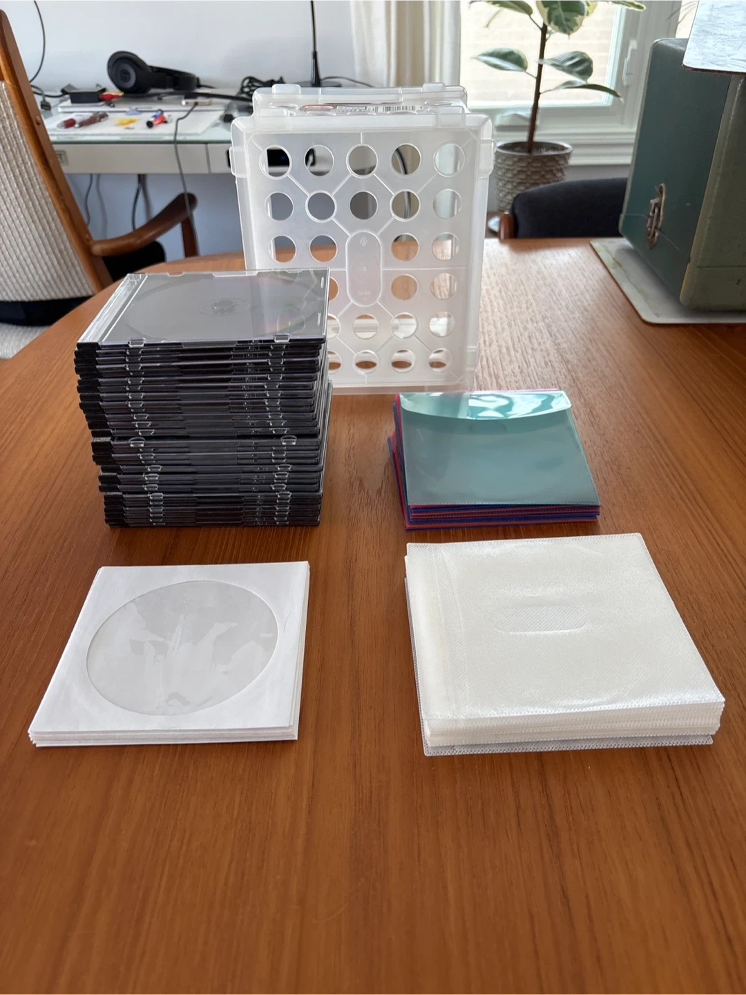 This bundle includes a white Sterilite CD/DVD storage case. It also comes with a stack of standard CD jewel cases and a variety of colourful and clear CD/DVD sleeves. Everything you need to organize your media collection!