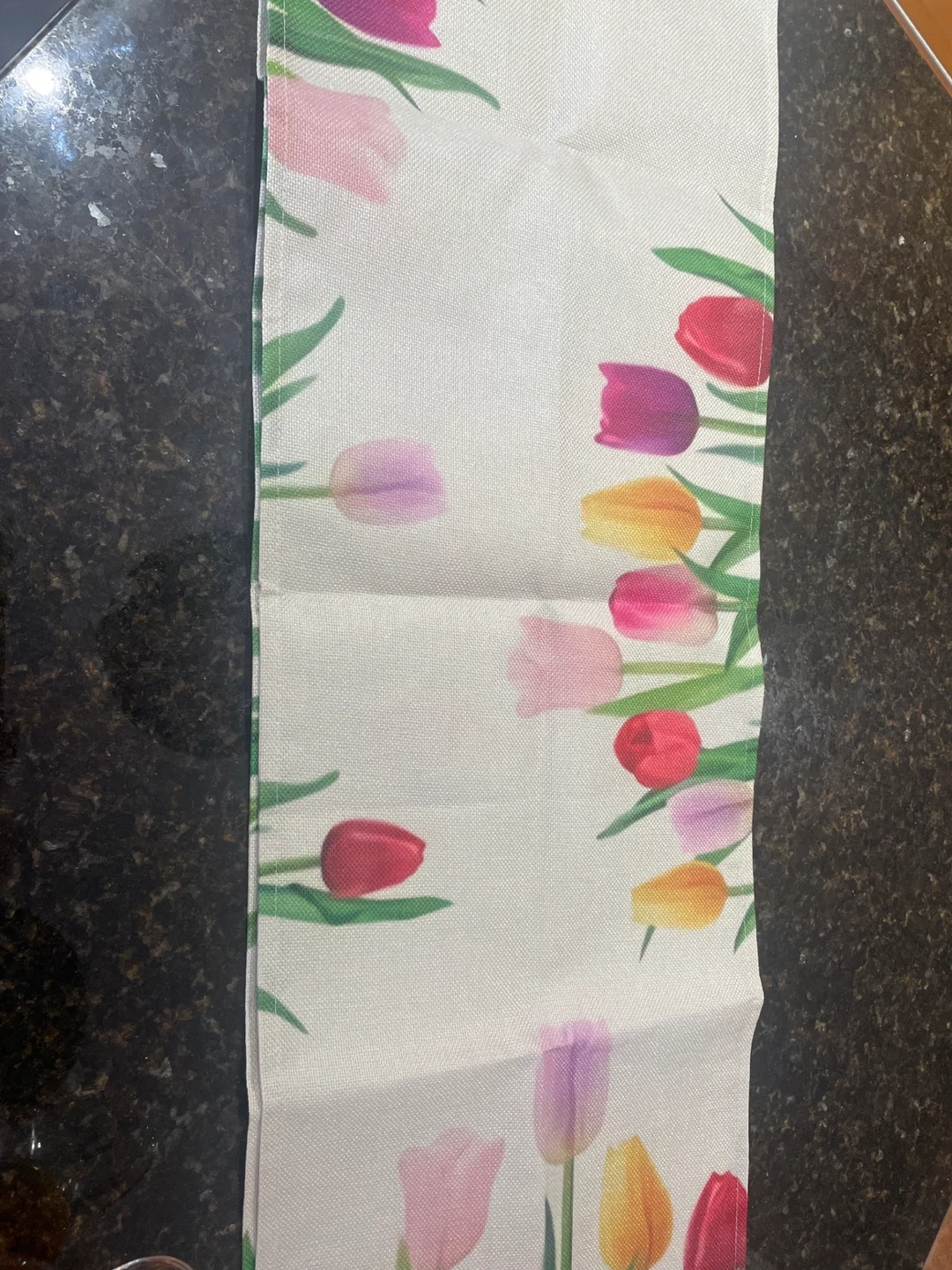 A white table runner featuring a colourful tulip print along the edges. It's made of a linen-like fabric. This runner is perfect for adding a touch of spring to your dining table or buffet.