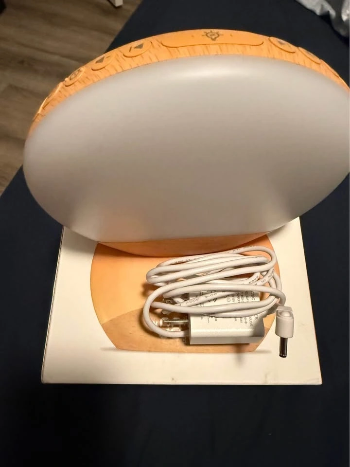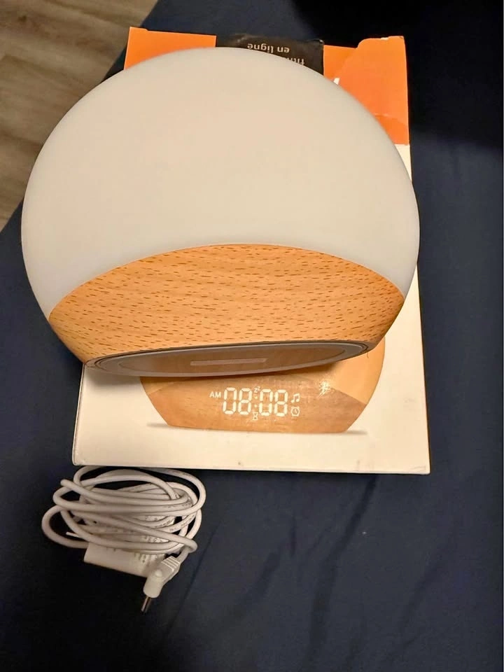 Sunrise wake-up alarm clock in excellent condition – barely used. Gradually brightens like a natural sunrise to help you wake up more gently. Choose from soothing waves crashing or birds chirping sounds. Also works as a bedside lamp with alarm sounds and digital display. Includes: Original packaging, Power cable. Selling for $20.
