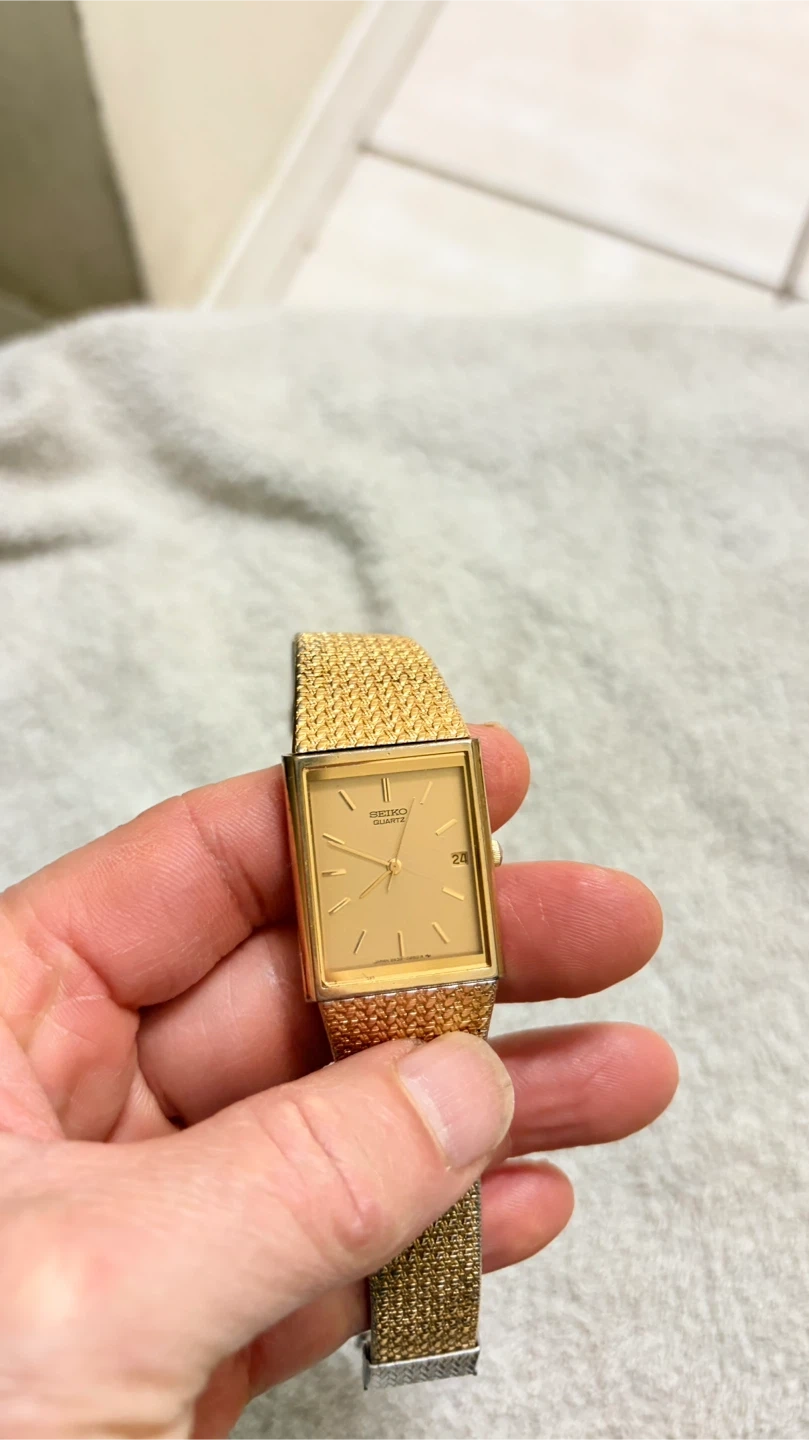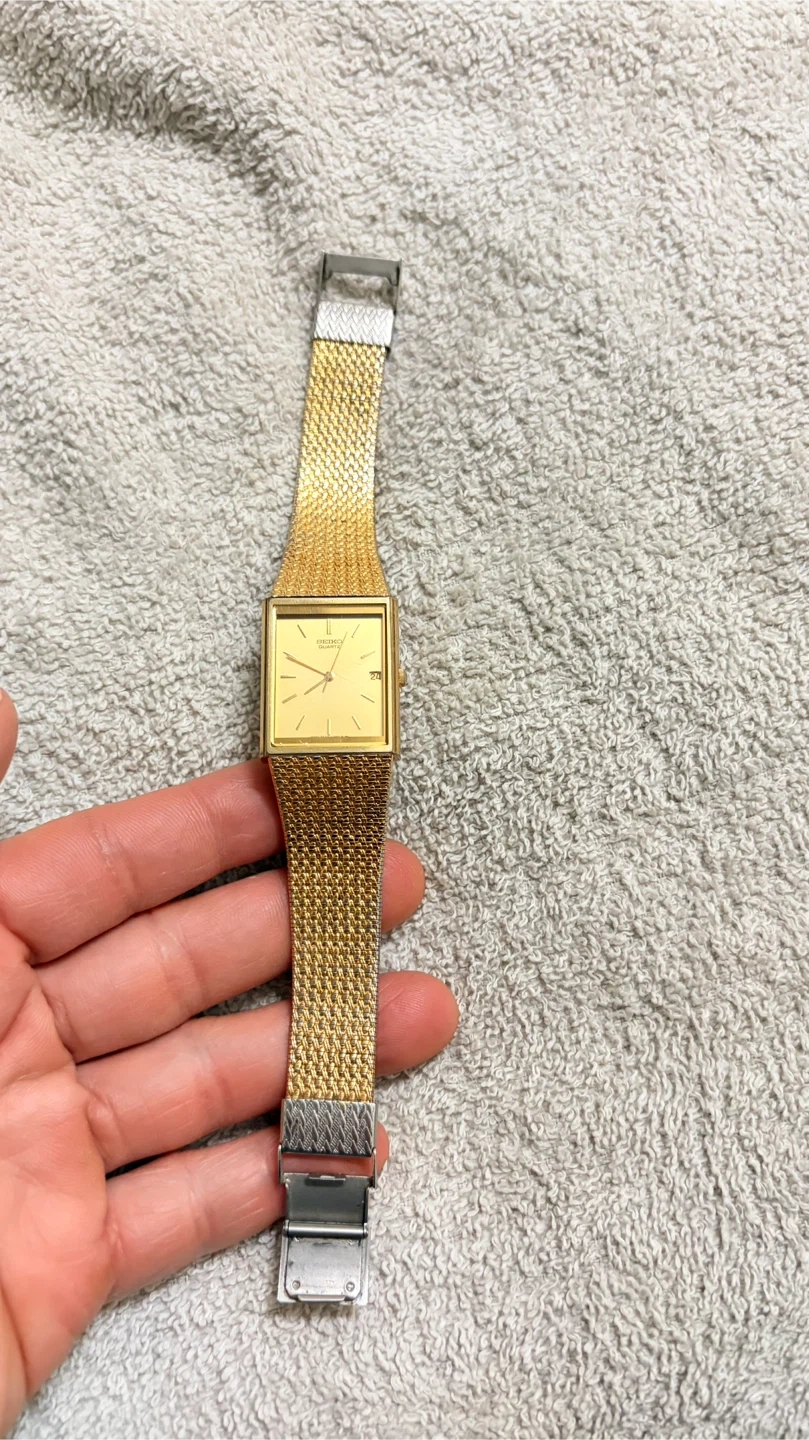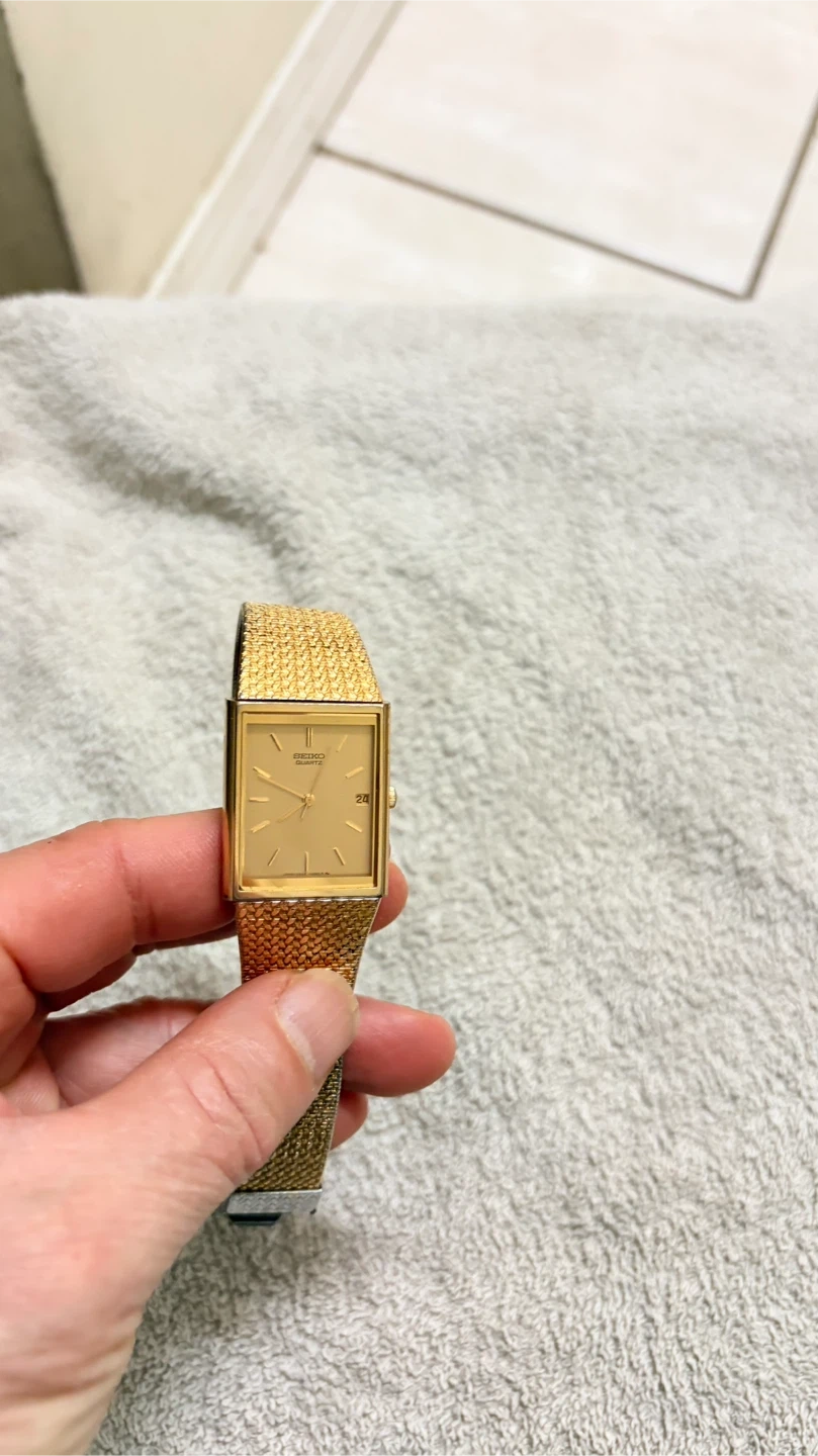 Selling a Seiko Quartz watch with a gold-tone finish. It has a rectangular face and a mesh-style band. The watch shows some signs of wear on the back. It had a new battery in it