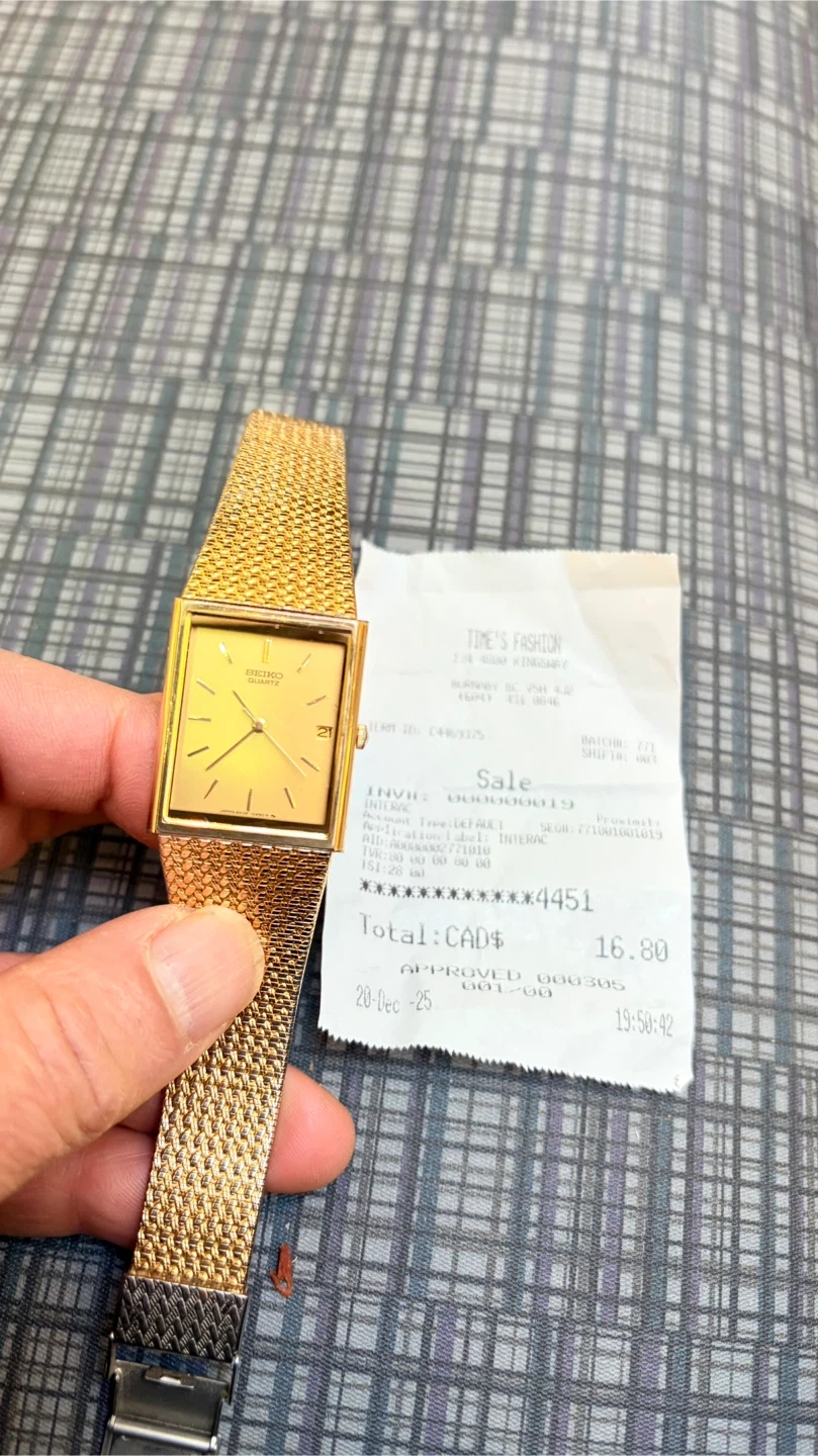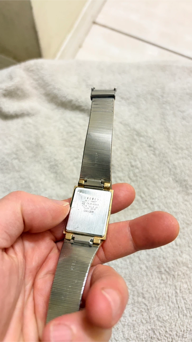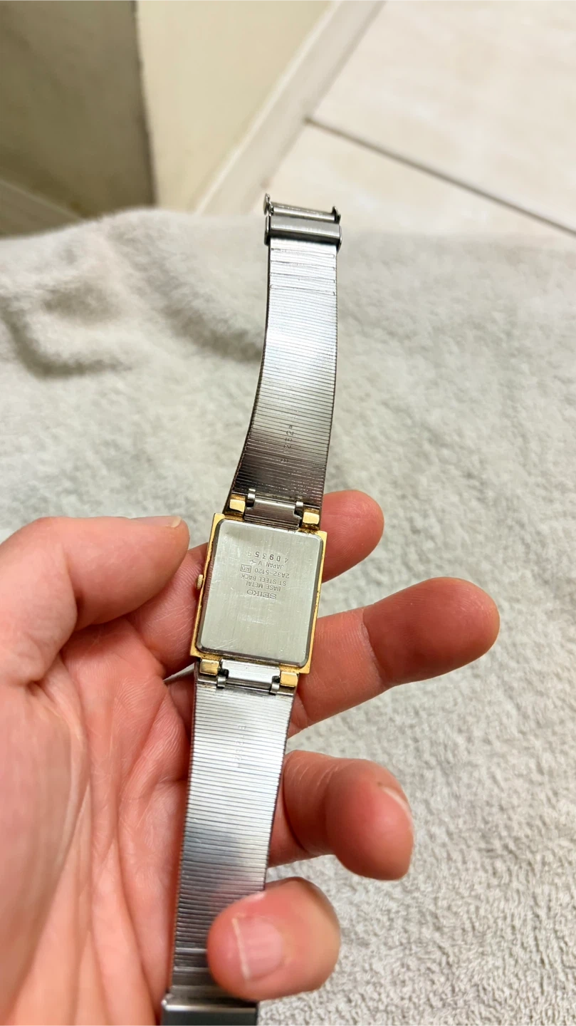 Selling a Seiko Quartz watch with a gold-tone finish. It has a rectangular face and a mesh-style band. The watch shows some signs of wear on the back. It had a new battery in it