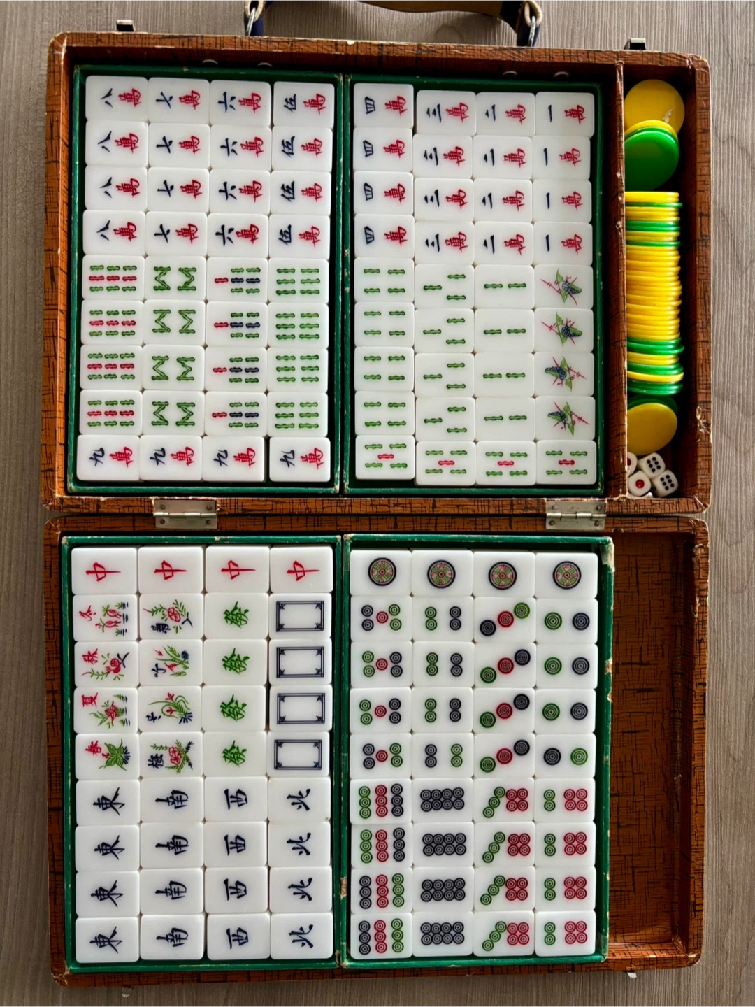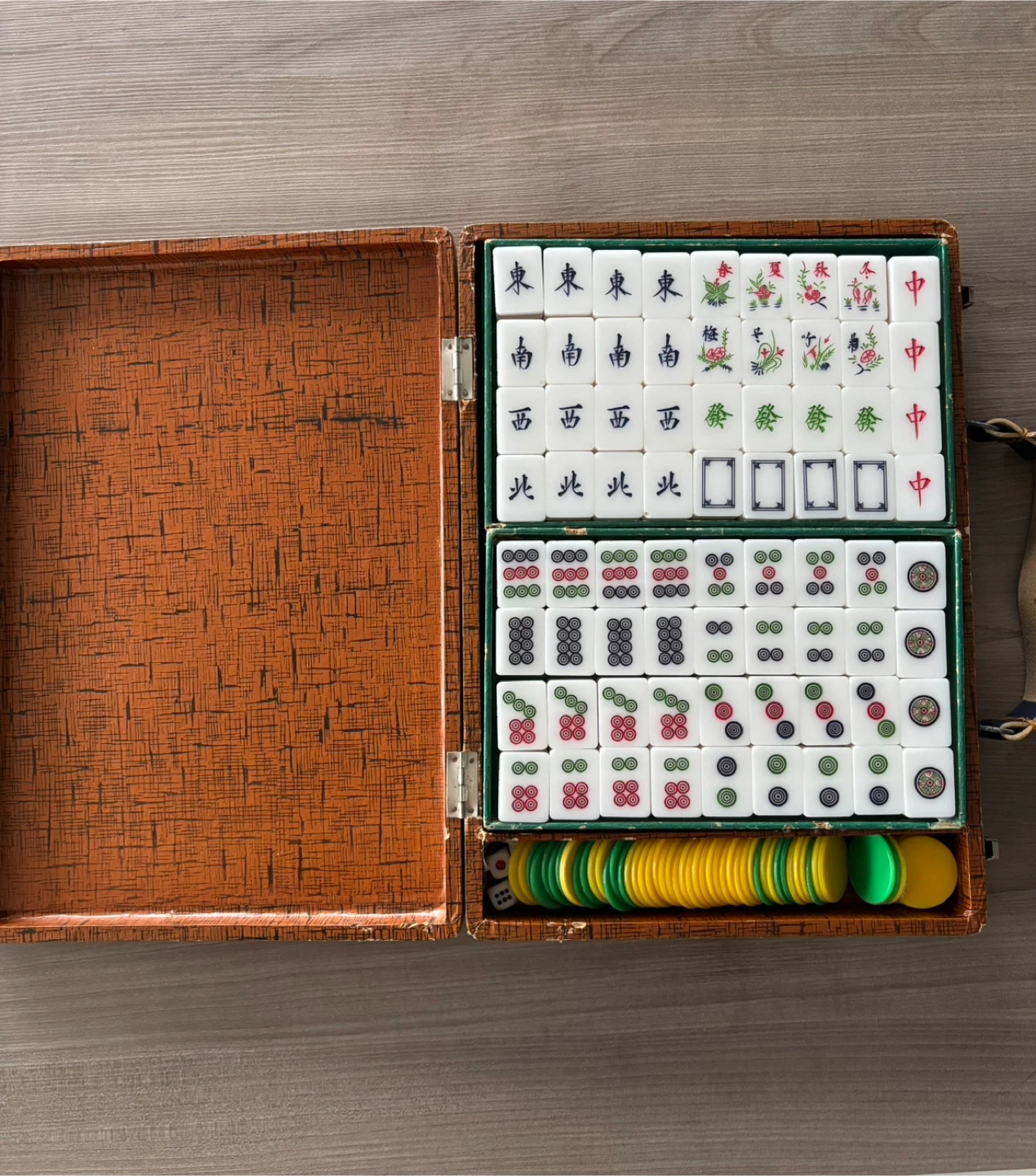 Complete mahjong set in a vintage wooden case. Includes tiles, dice, and scoring chips -all in mint condition. Great for game nights!