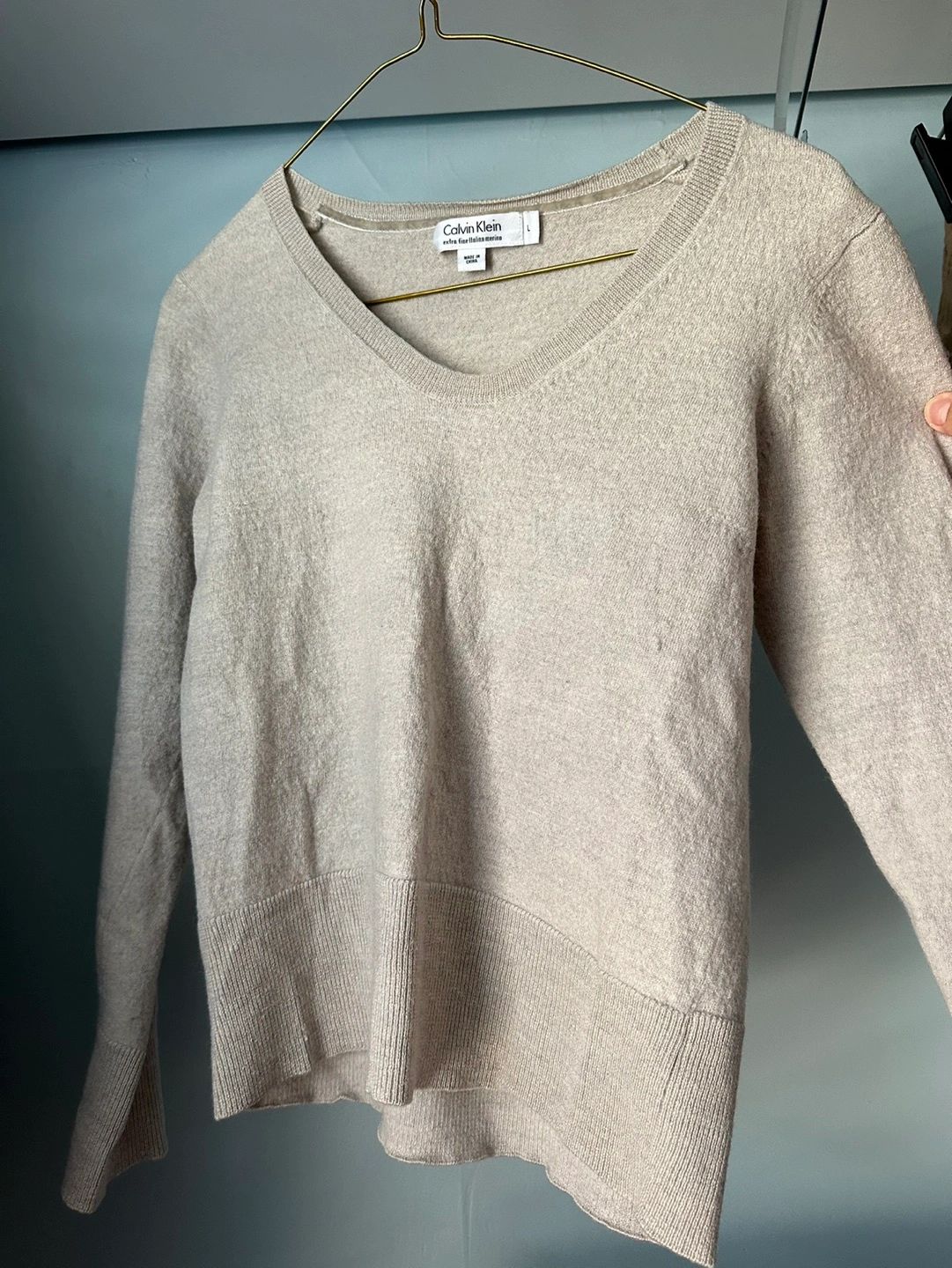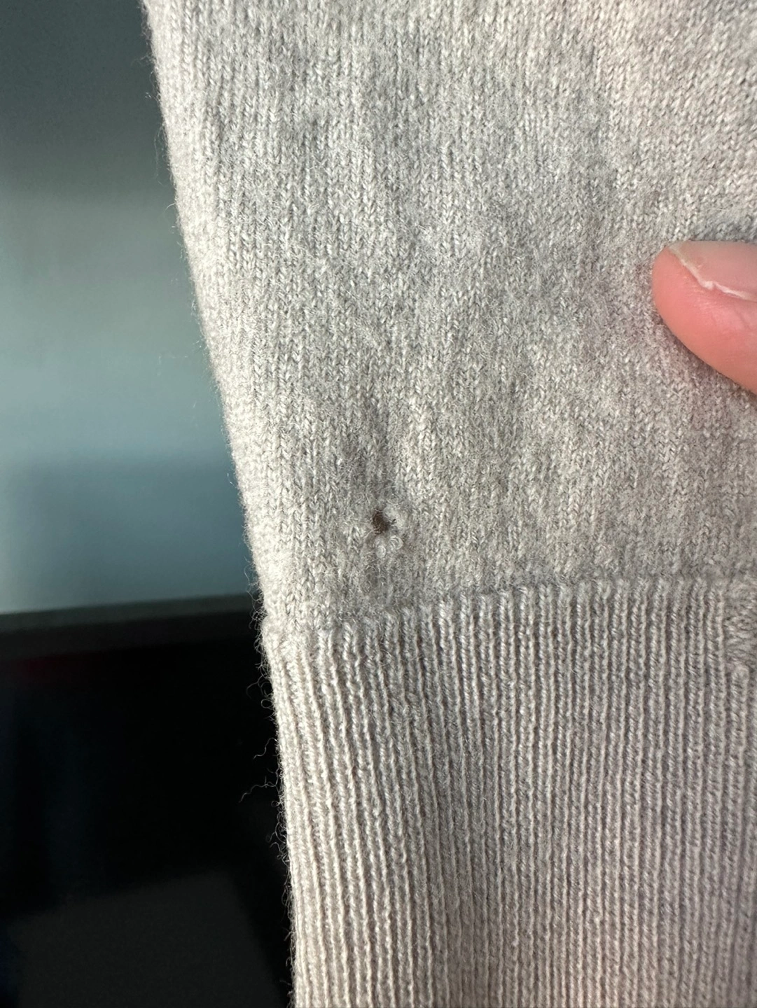 Size L but fits like a small because it shrunk. Small hole on sleeve (see second pic). Pick up only