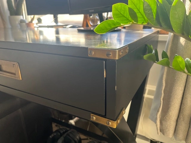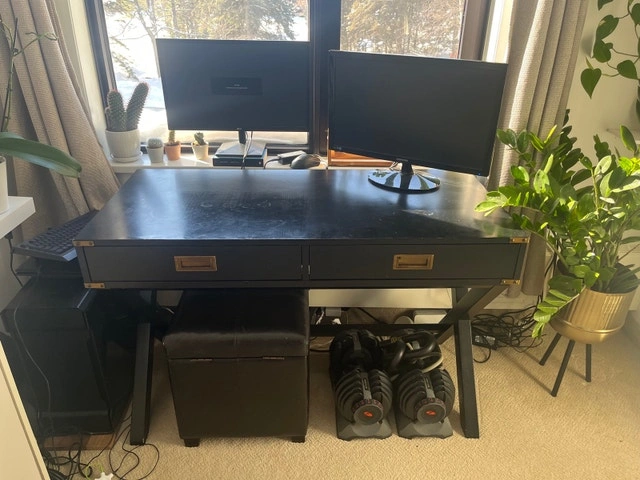 Charming vintage desk with brass accent details. Sturdy and functional with a bit of light wear consistent with age. Ideal for a home office, writing desk, or creative space. Adds warmth and a timeless look to any room. 22” x 38” x31”. Cashless payment accepted.