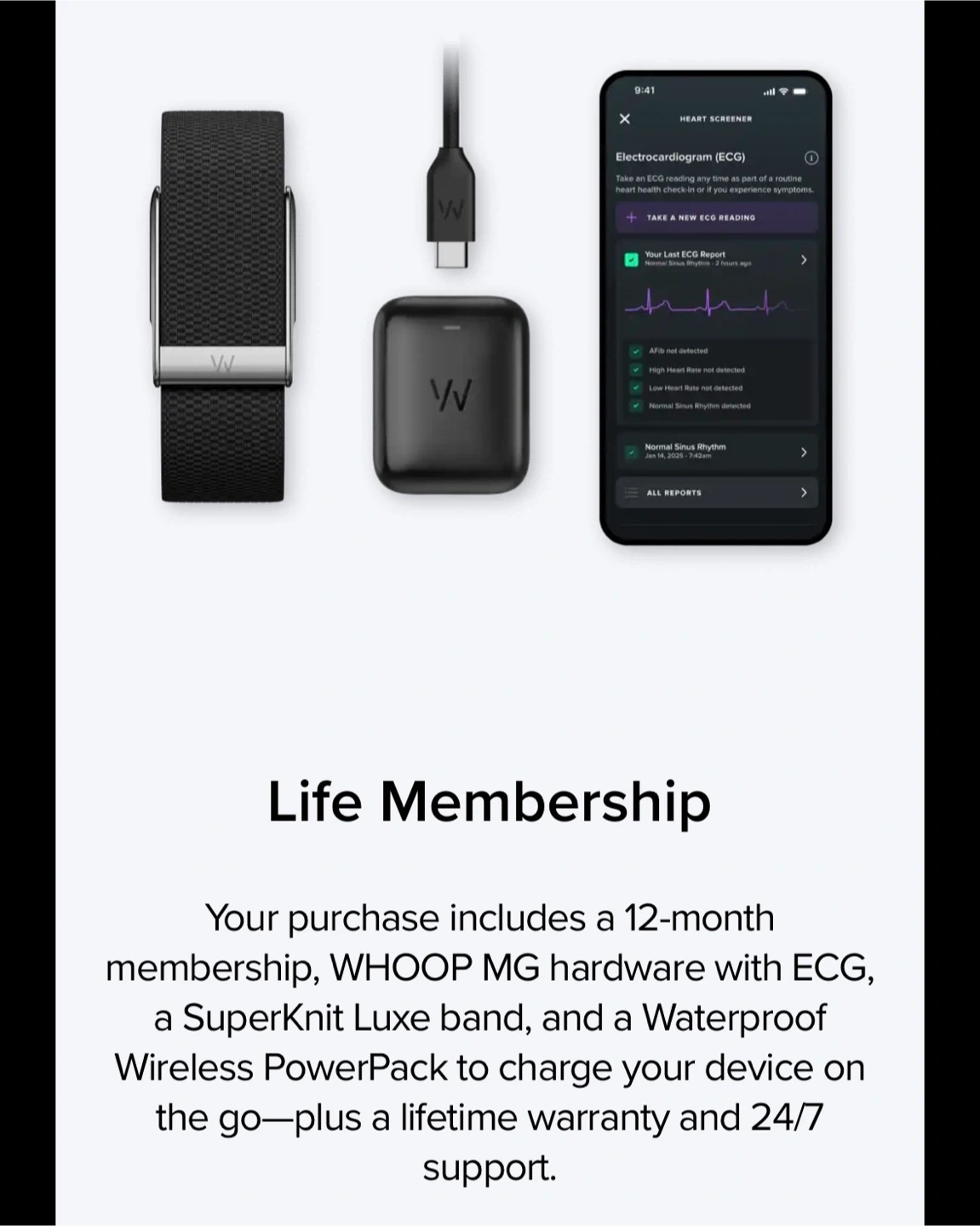 Includes a 12-month Life membership, WHOOP MG hardware with ECG, a SuperKnit Luxe band, and a Waterproof Wireless PowerPack to charge your device on the go—plus a lifetime warranty and 24/7 support.