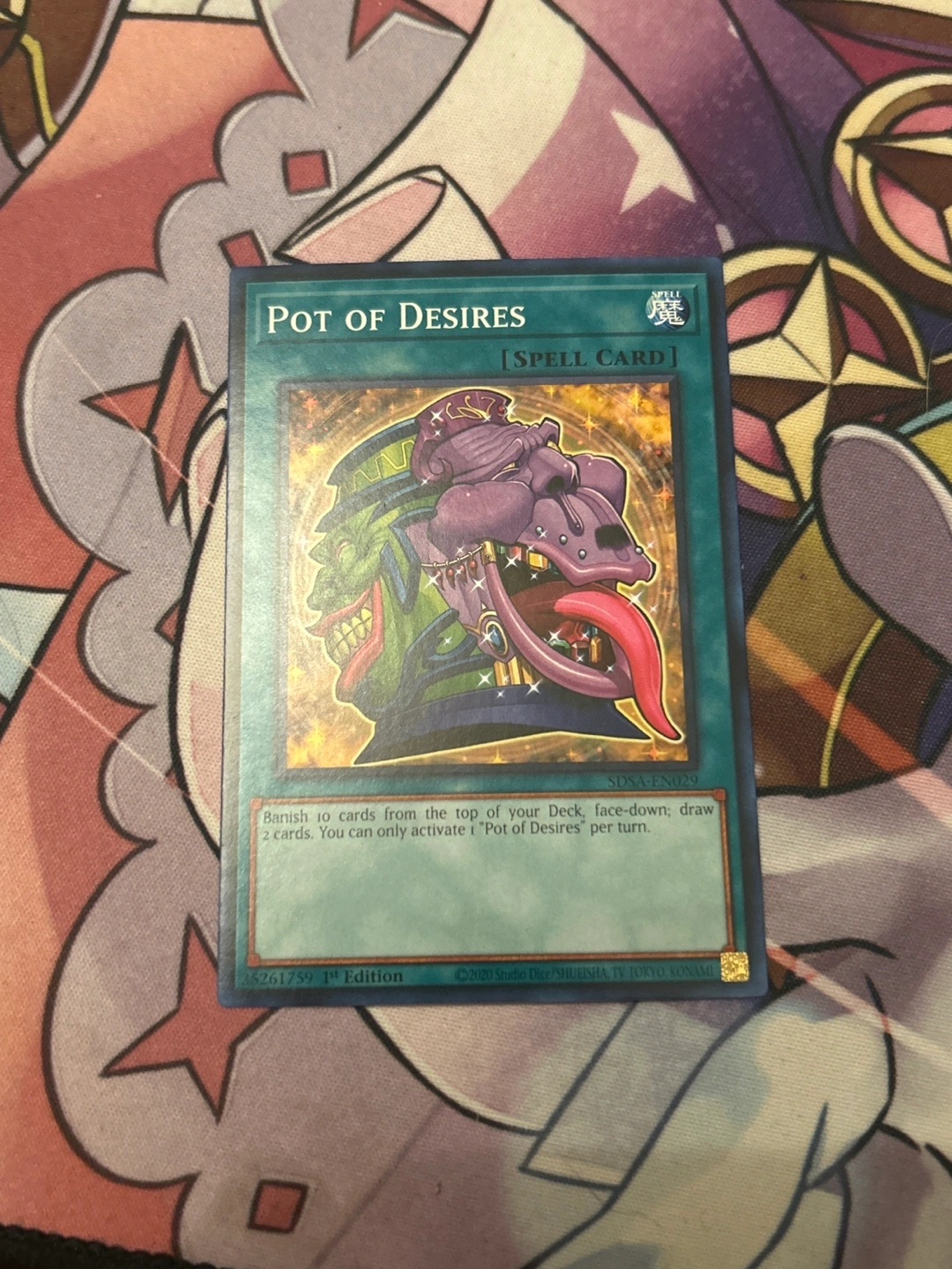 Selling a Yu-Gi-Oh! Pot of Desires spell card. It's a first edition card from 2020! Banish 10 cards from the top of your deck, face-down; draw 2 cards. You can only activate 1 "Pot of Desires" per turn