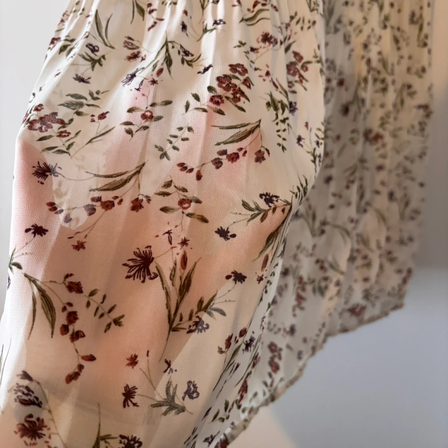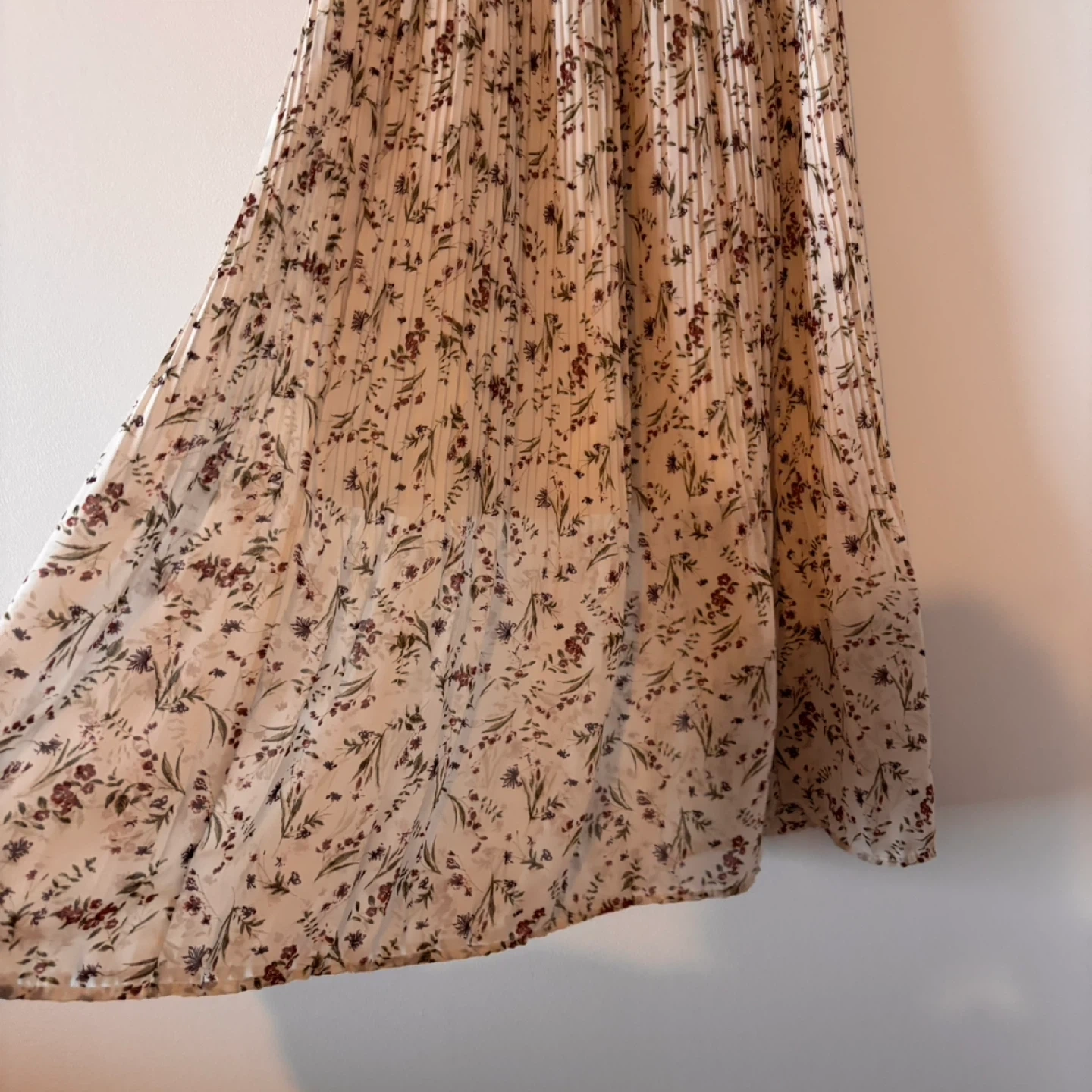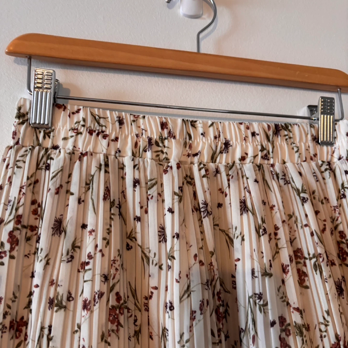 Cream-coloured midi skirt with a delicate floral print and pleats. It's got an elastic waistband for comfort. Lightweight fabric is slightly sheer.