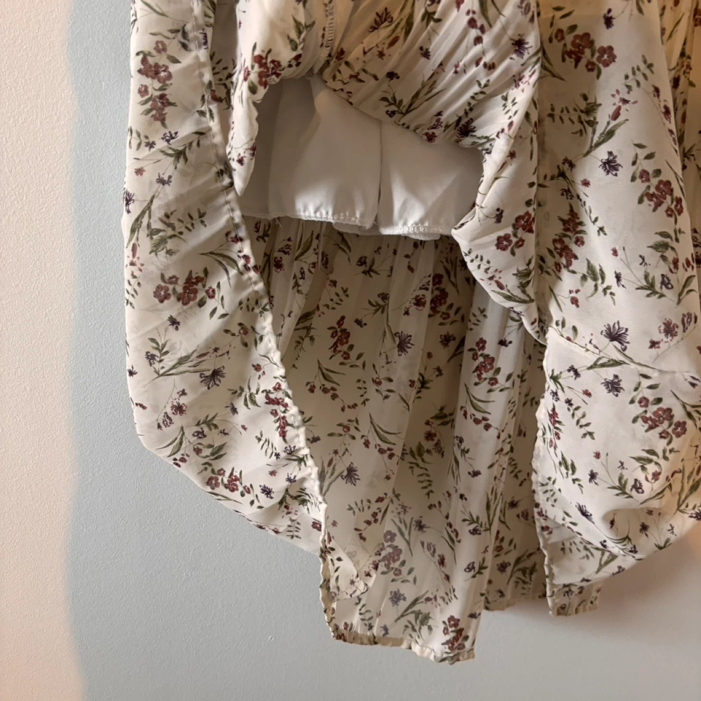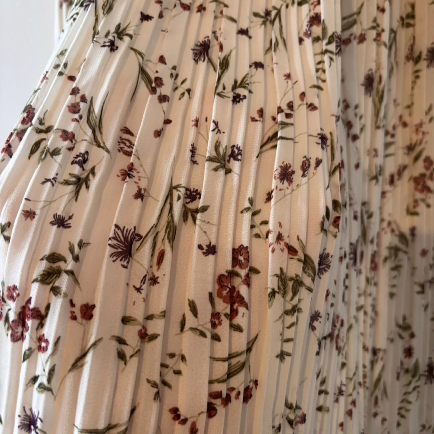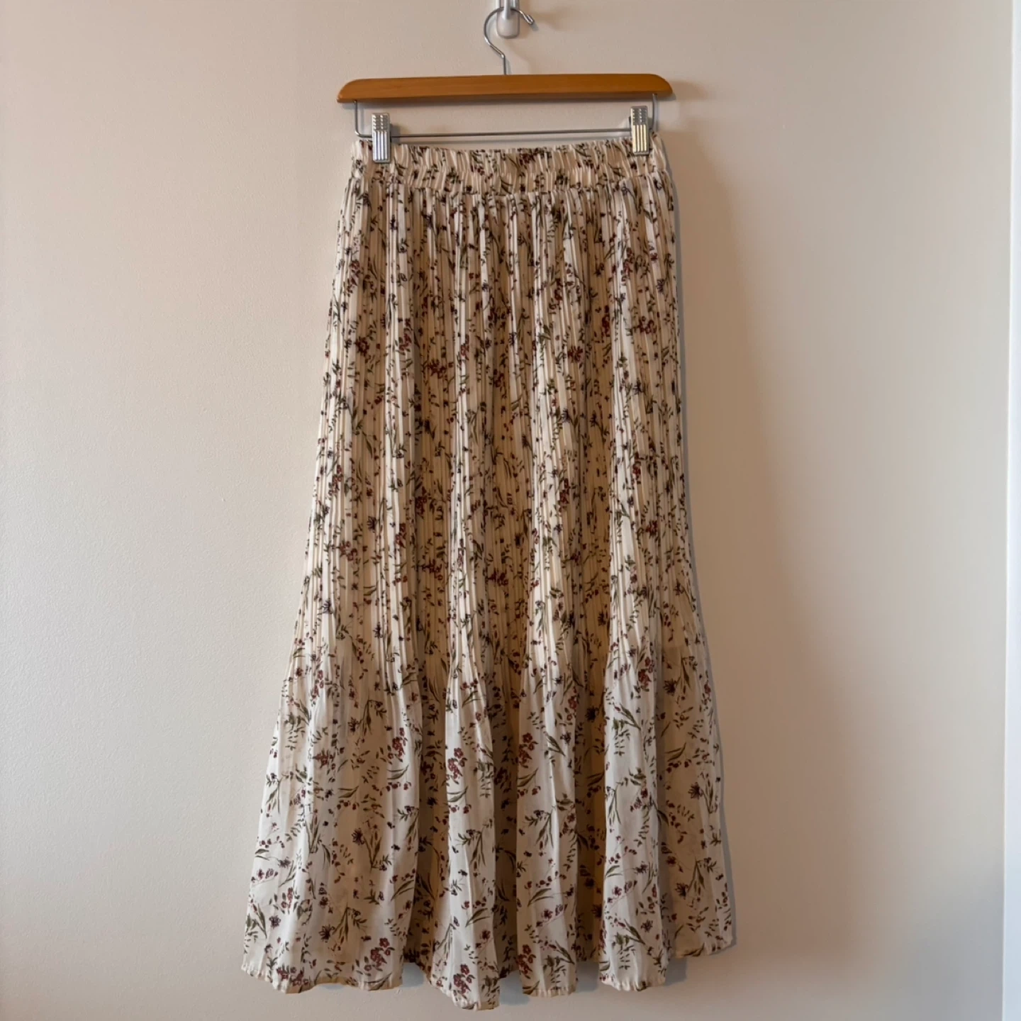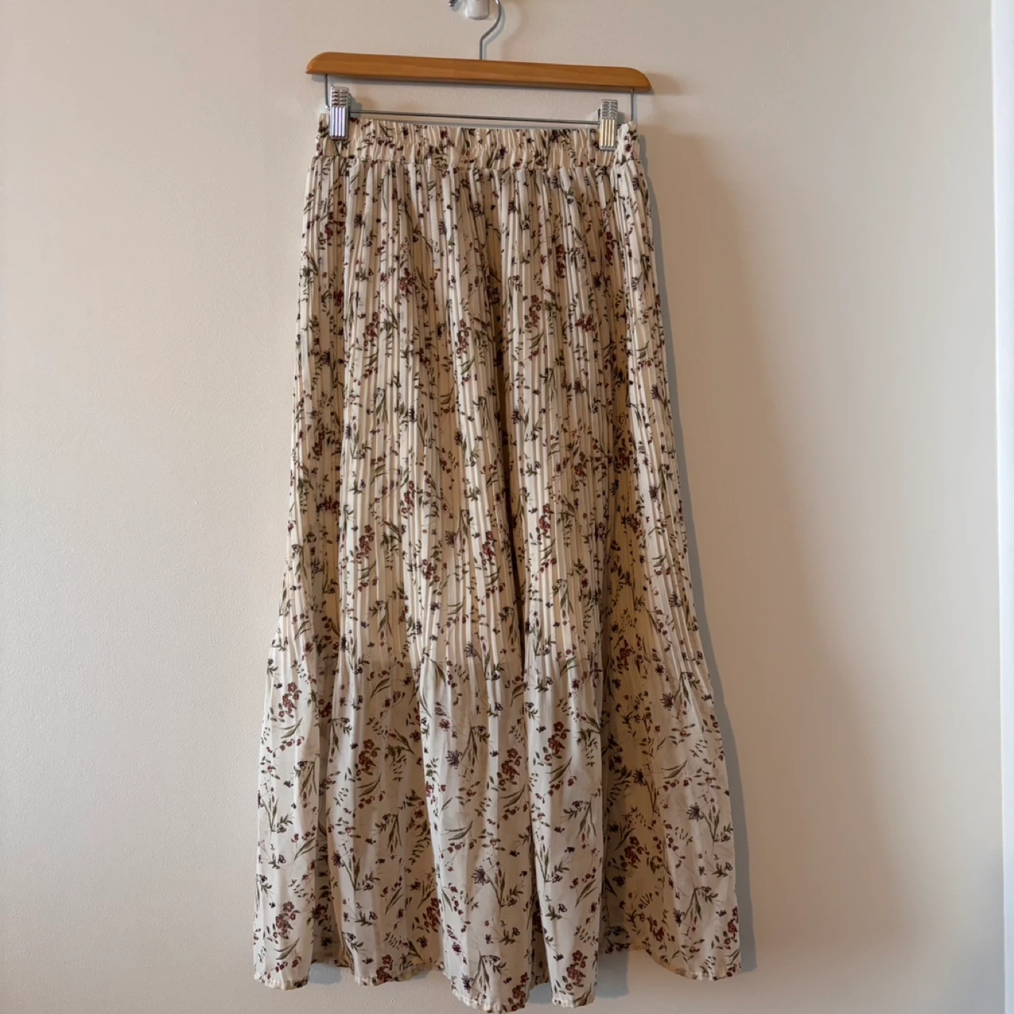 Cream-coloured midi skirt with a delicate floral print and pleats. It's got an elastic waistband for comfort. Lightweight fabric is slightly sheer.