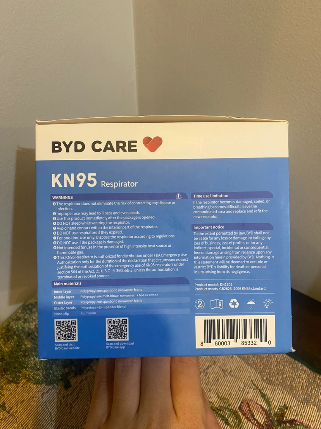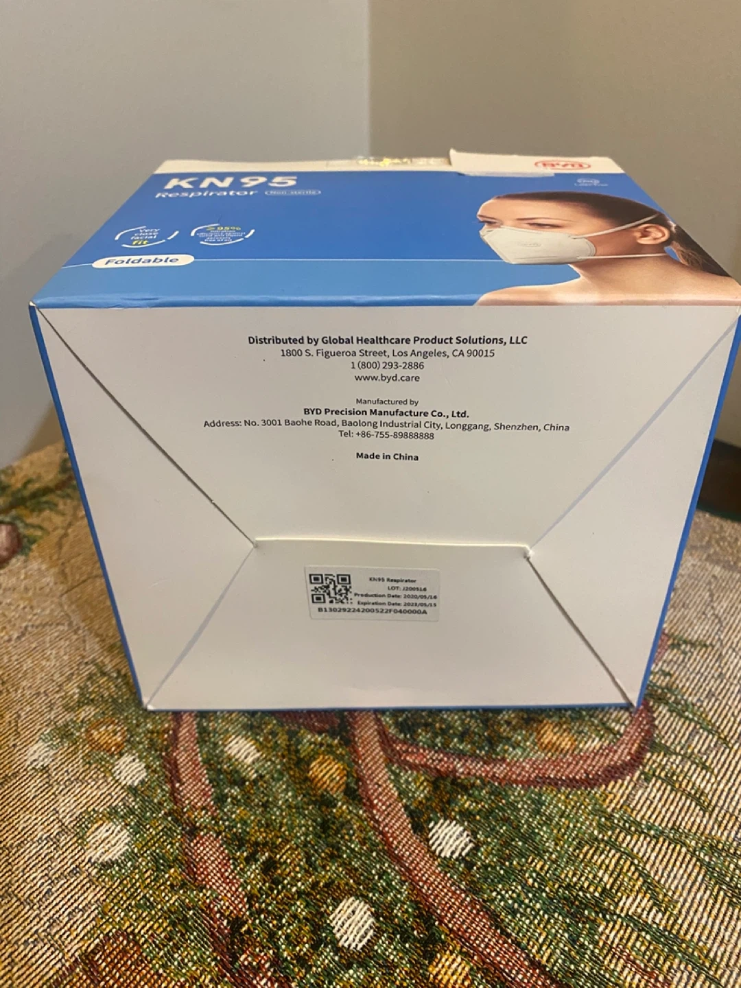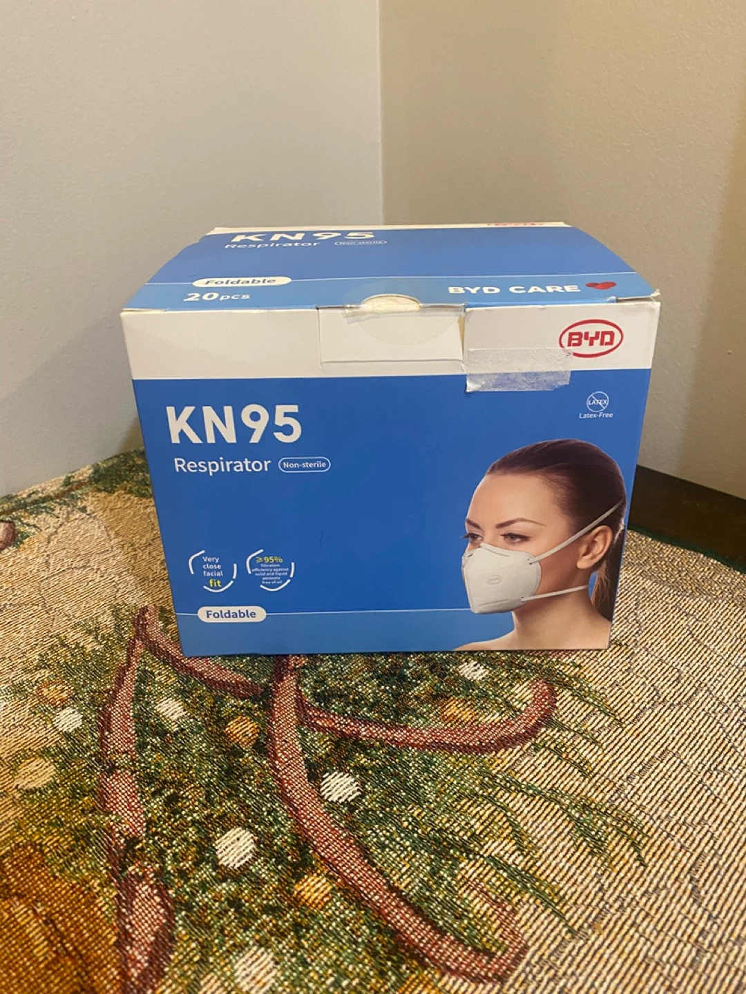 BYD CARE KN95 respirators are foldable and come in a pack of 20. The inner layer is polypropylene spunbond nonwoven fabric, the middle layer is polypropylene meltblown nonwoven fabric, and the outer layer is hot or cotton-spun nonwoven fabric. They feature elastic bands made from a polyester/nylon spandex blend and aluminum nose clips. No pieces were utilized and have been safely stored.