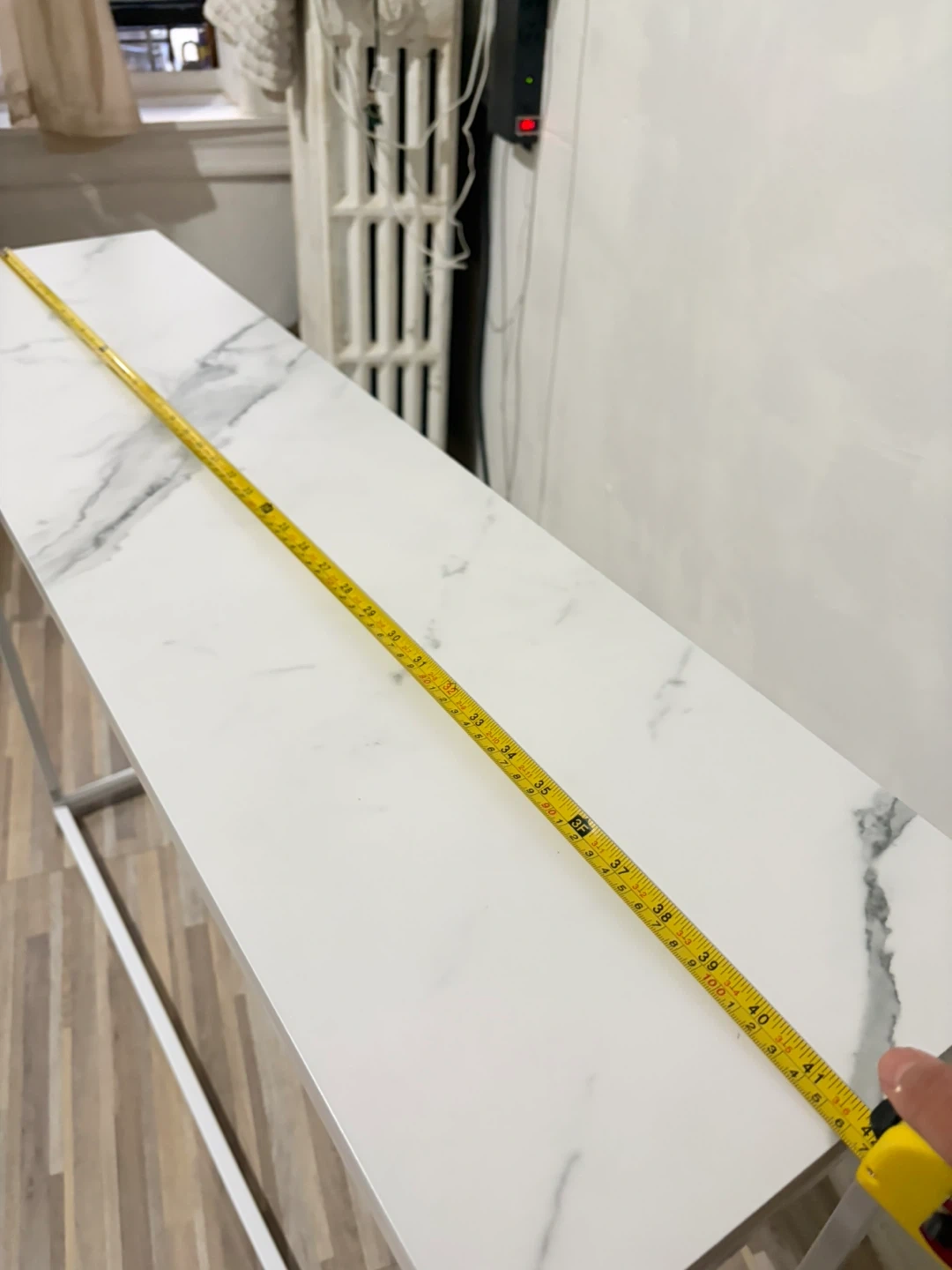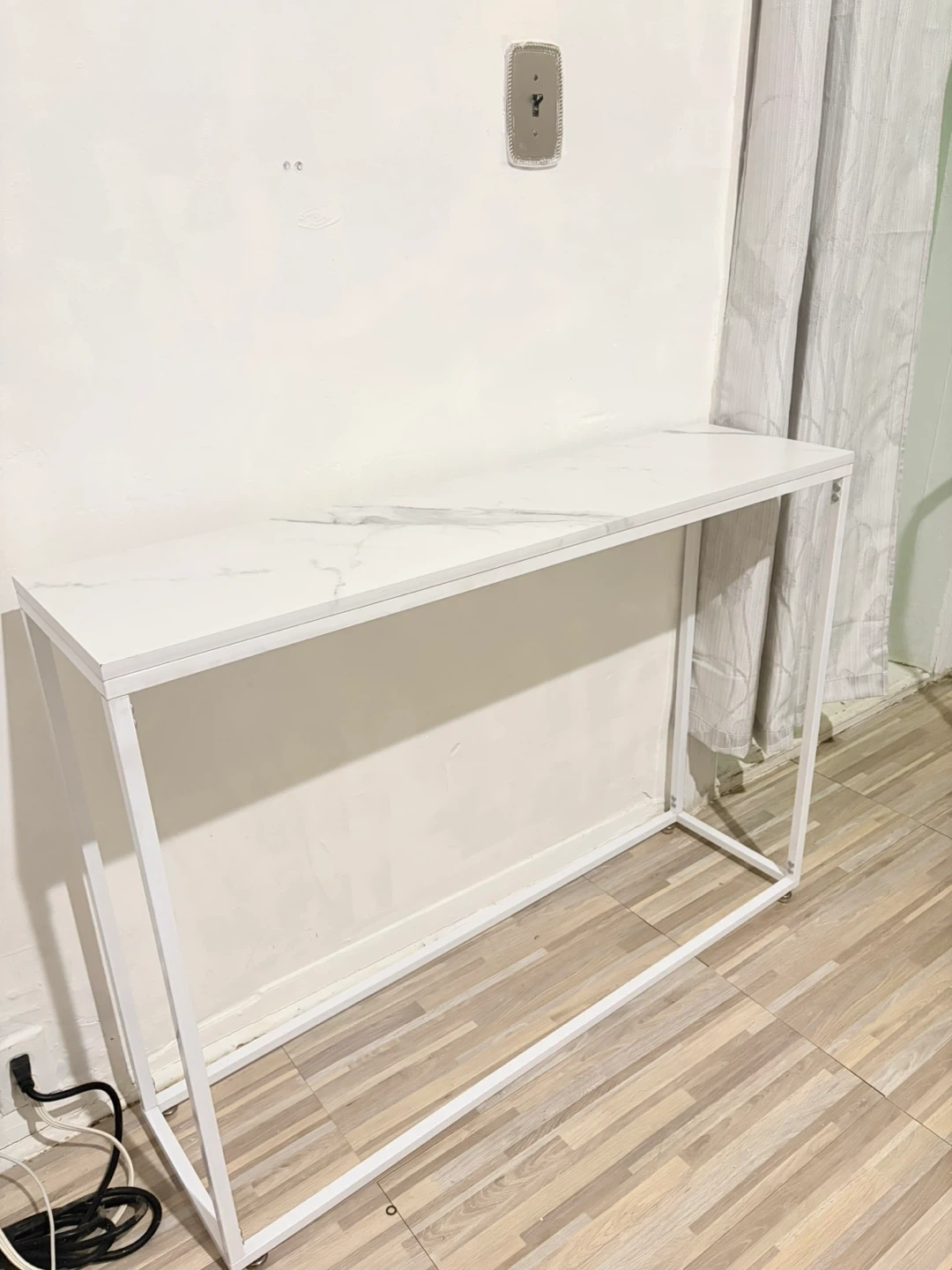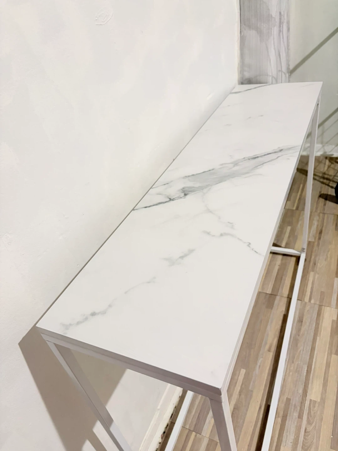 Slim console table with a white marble-patterned top and a white metal frame. The tabletop measures approximately 40 inches long and 10 inches deep. It's about 31 inches tall. Perfect for narrow spaces!