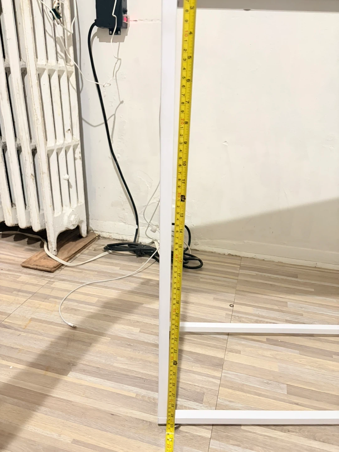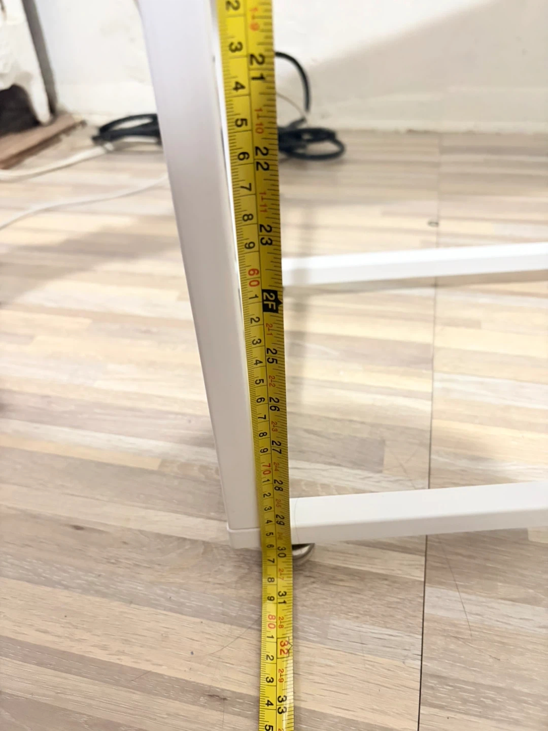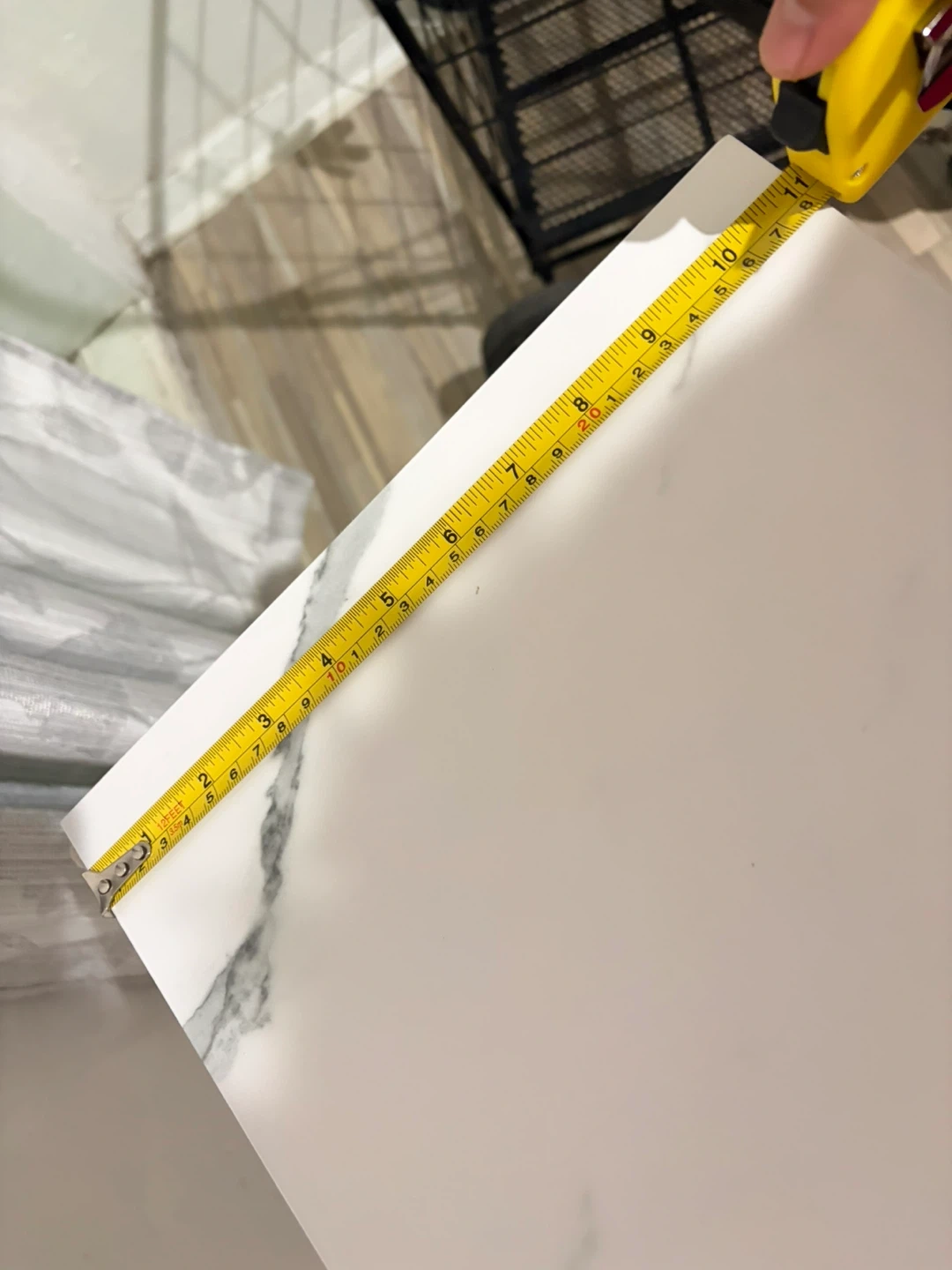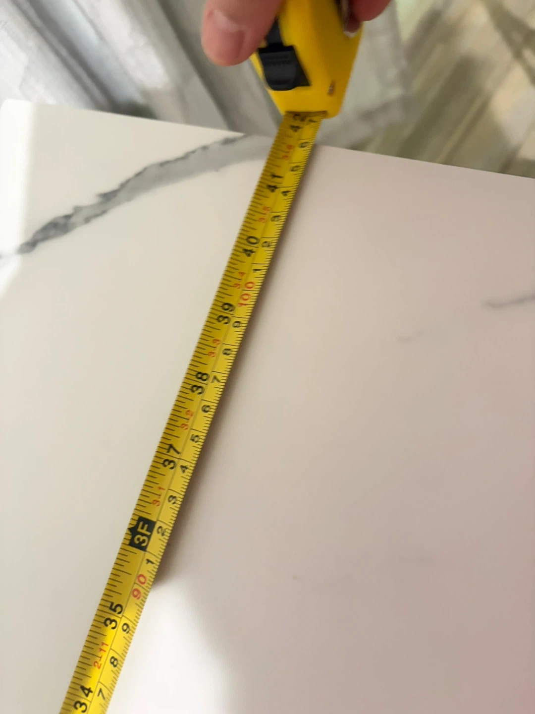 Slim console table with a white marble-patterned top and a white metal frame. The tabletop measures approximately 40 inches long and 10 inches deep. It's about 31 inches tall. Perfect for narrow spaces!