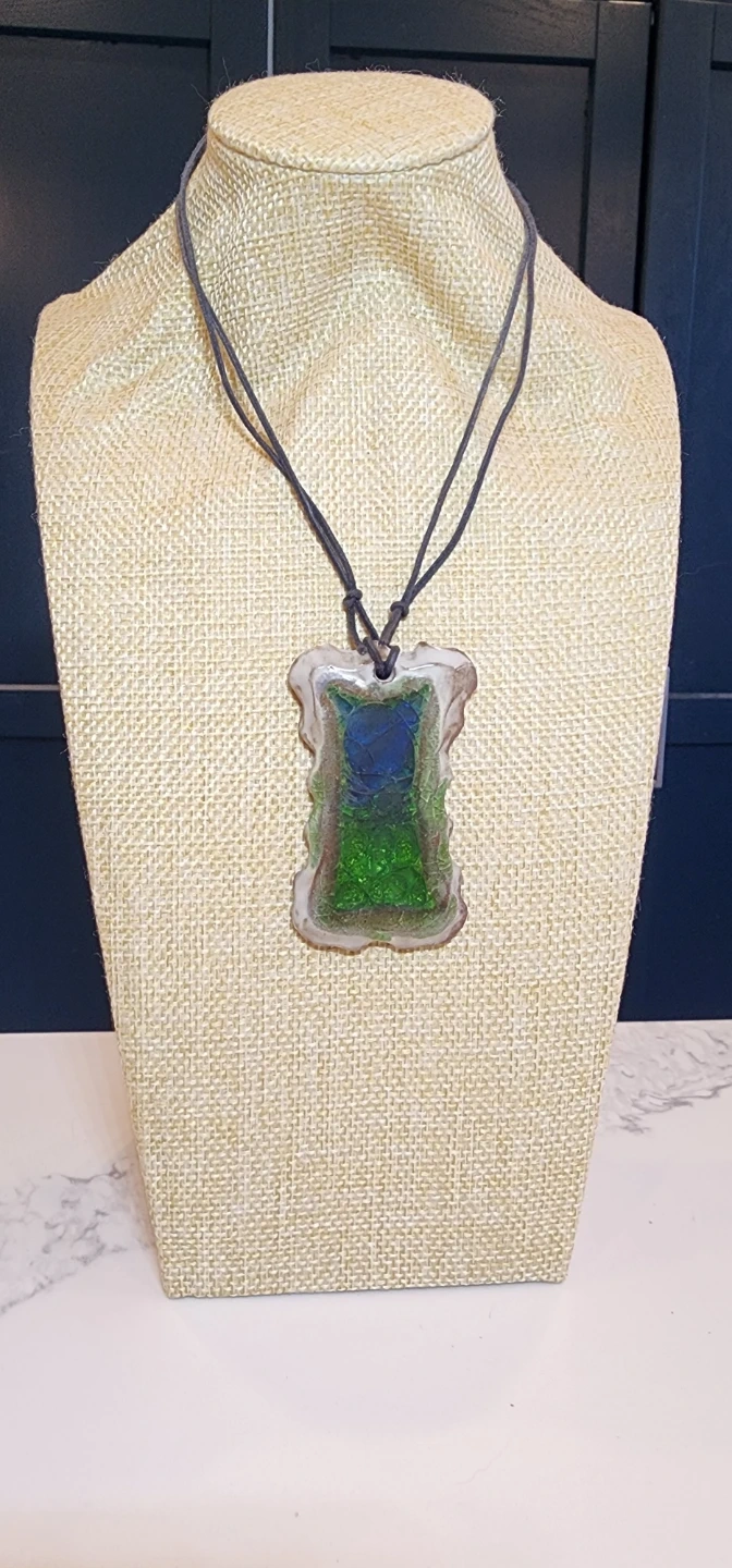 The deep green and blue colors evoke a sense of mystery and nature, like a hidden grotto or a magical portal to a forest pool. This necklace is perfect for anyone who loves unique, boho or fantasy-inspired jewelry and is looking for a statement piece