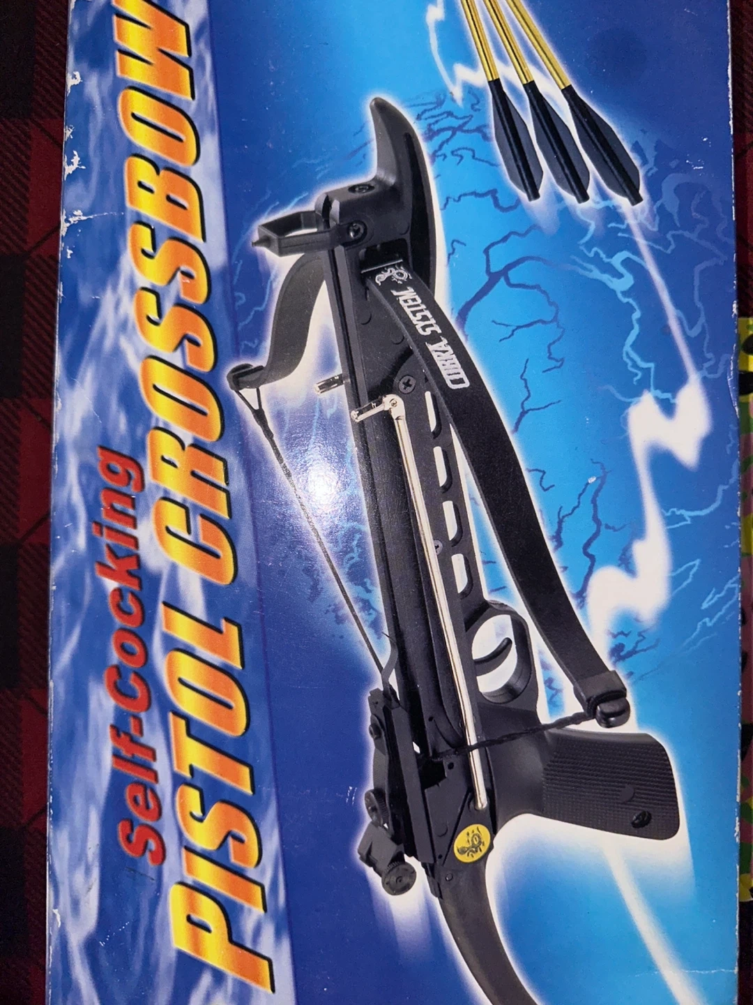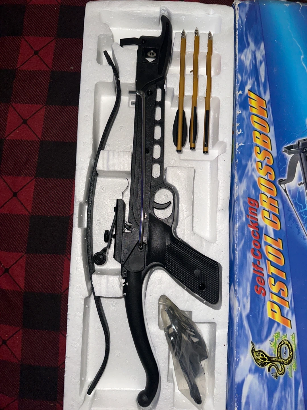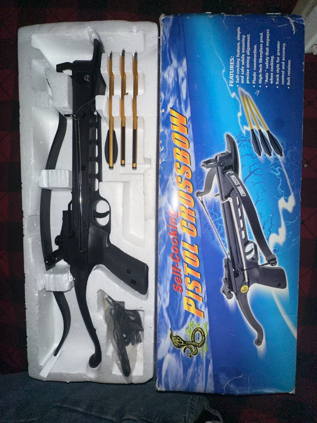 Self-cocking pistol crossbow with a durable black plastic construction. Includes a set of arrows and other accessories in the original box. This is a great item for target practice! 🚨extra 12 pack of darts included ‼️